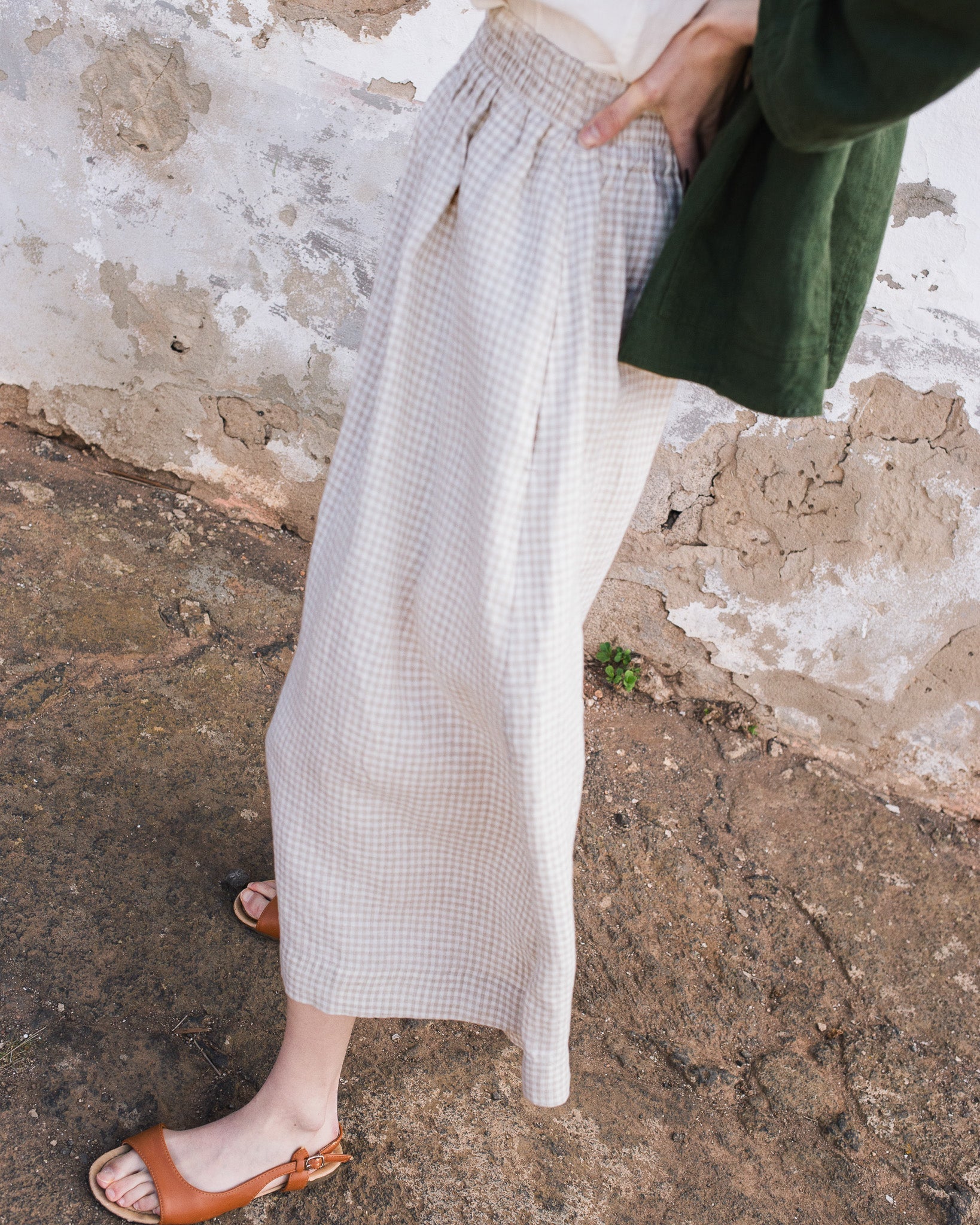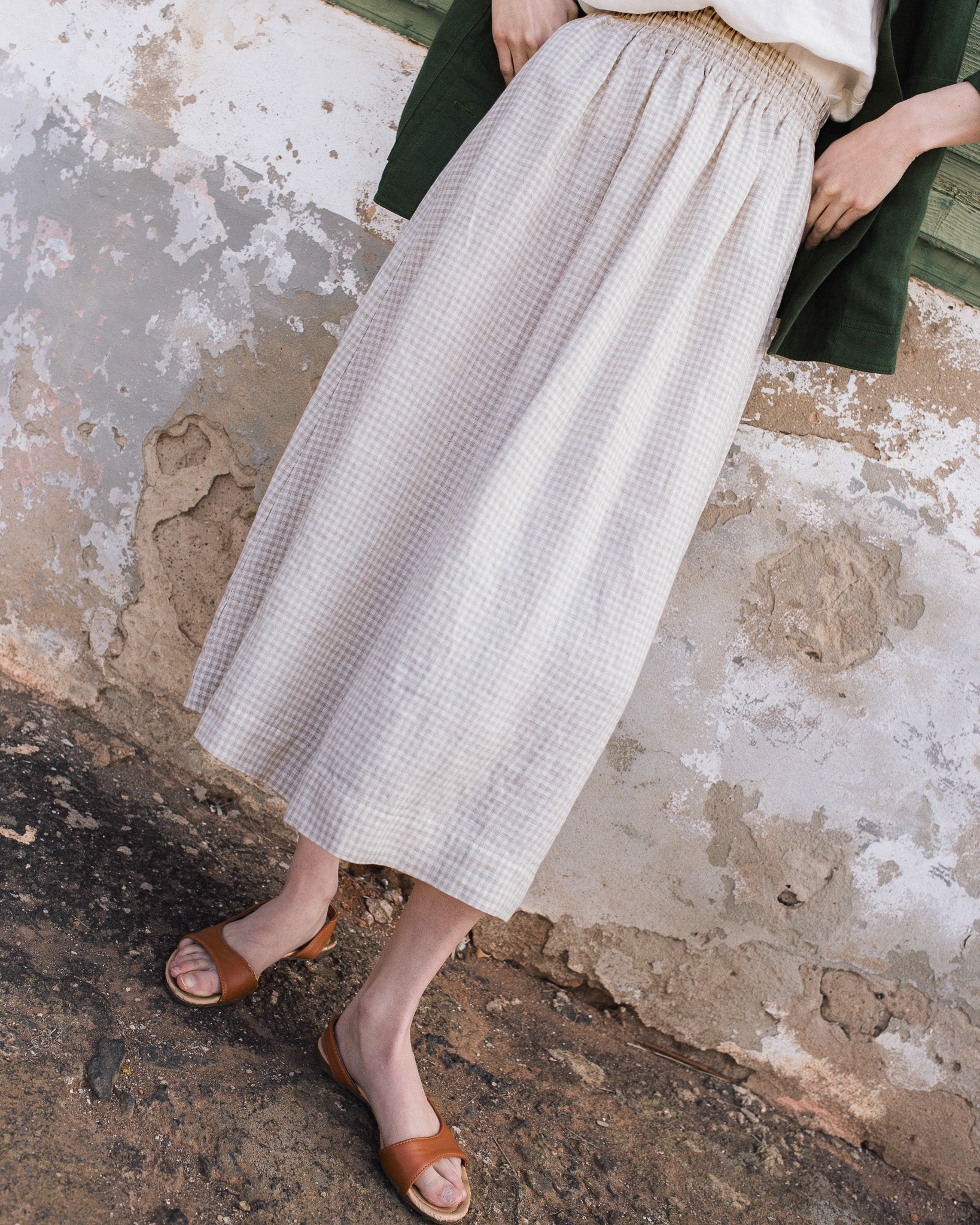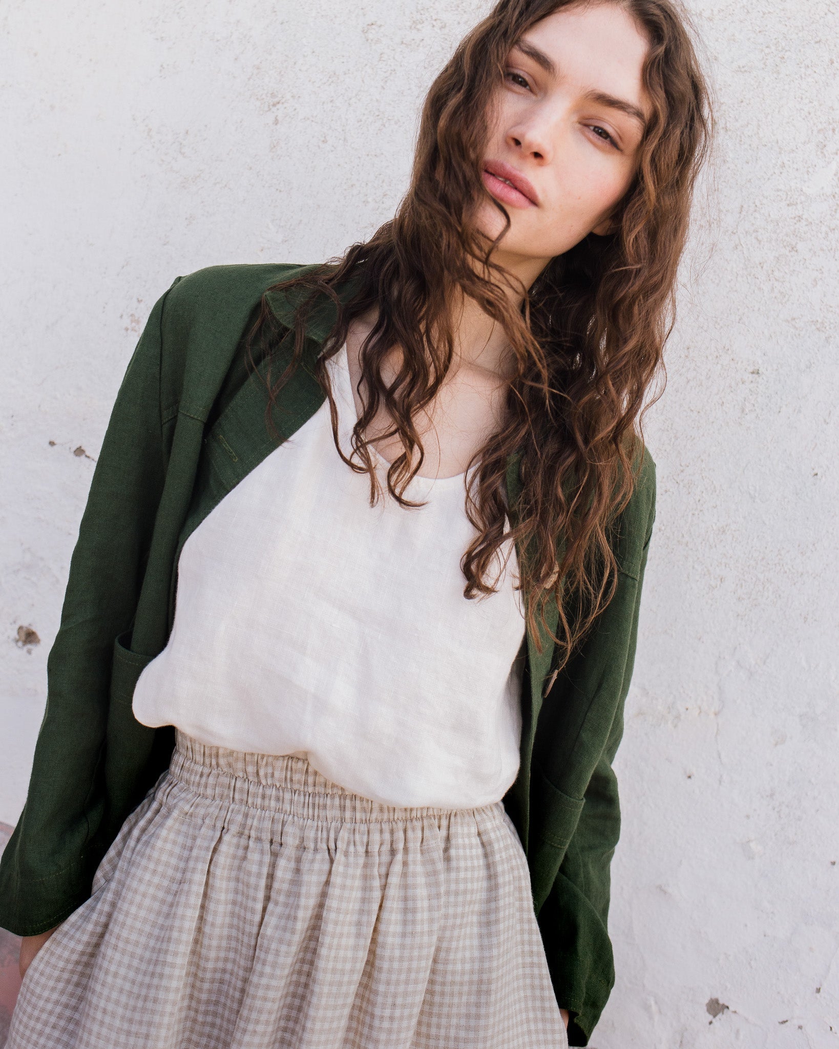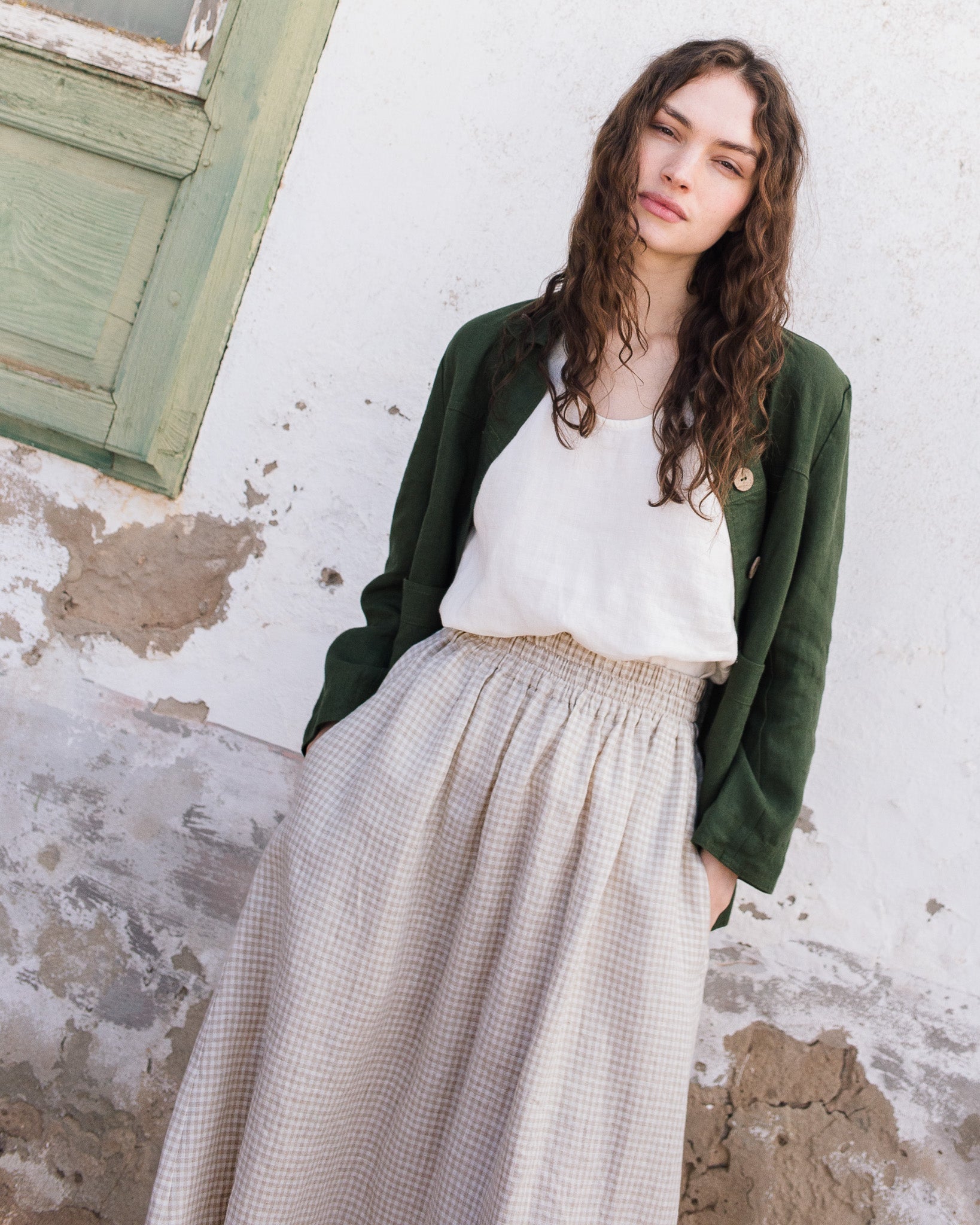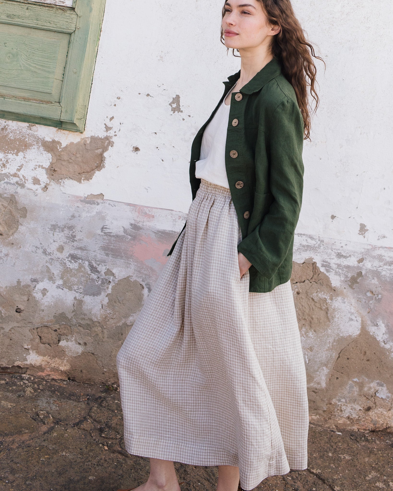 • The model is 5'8" tall (173 cm), size XS, and wears a skirt in medium weight 'Natural/white' gingham pattern (please note that natural color thread may slightly vary in appearance depending on the season and the color of the raw, undyed flax harvested at that time).
