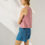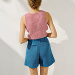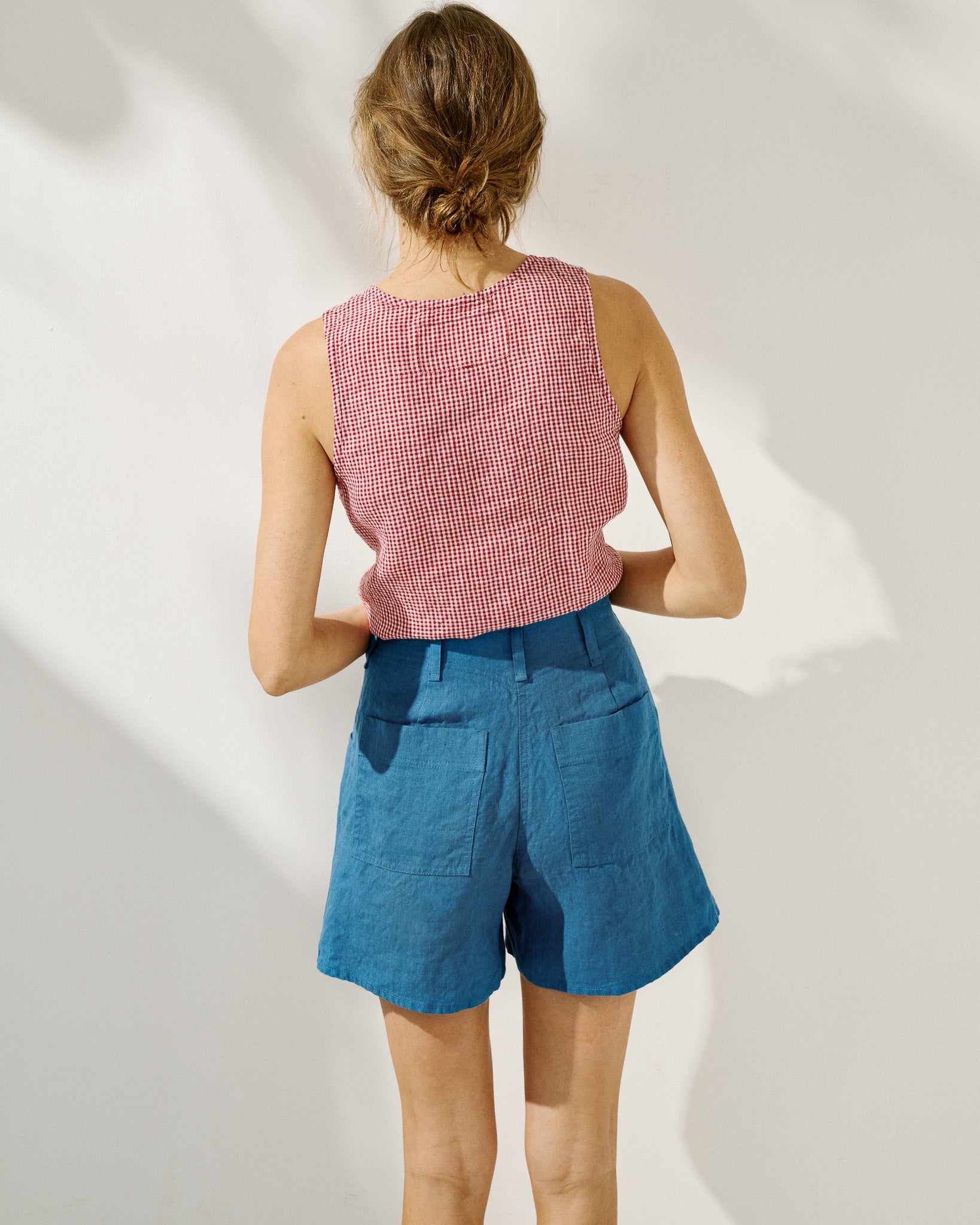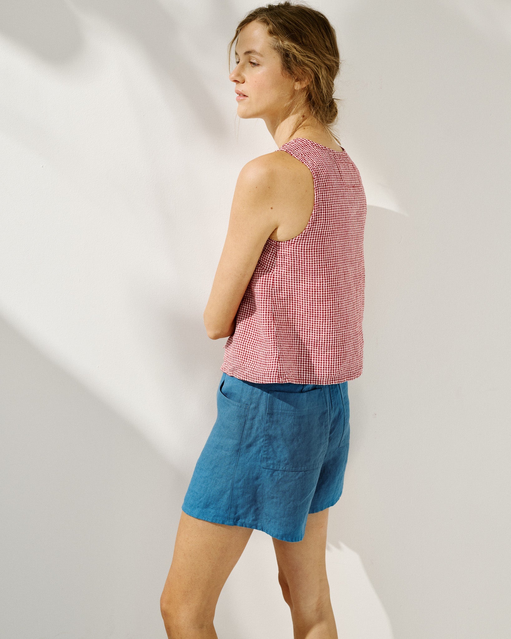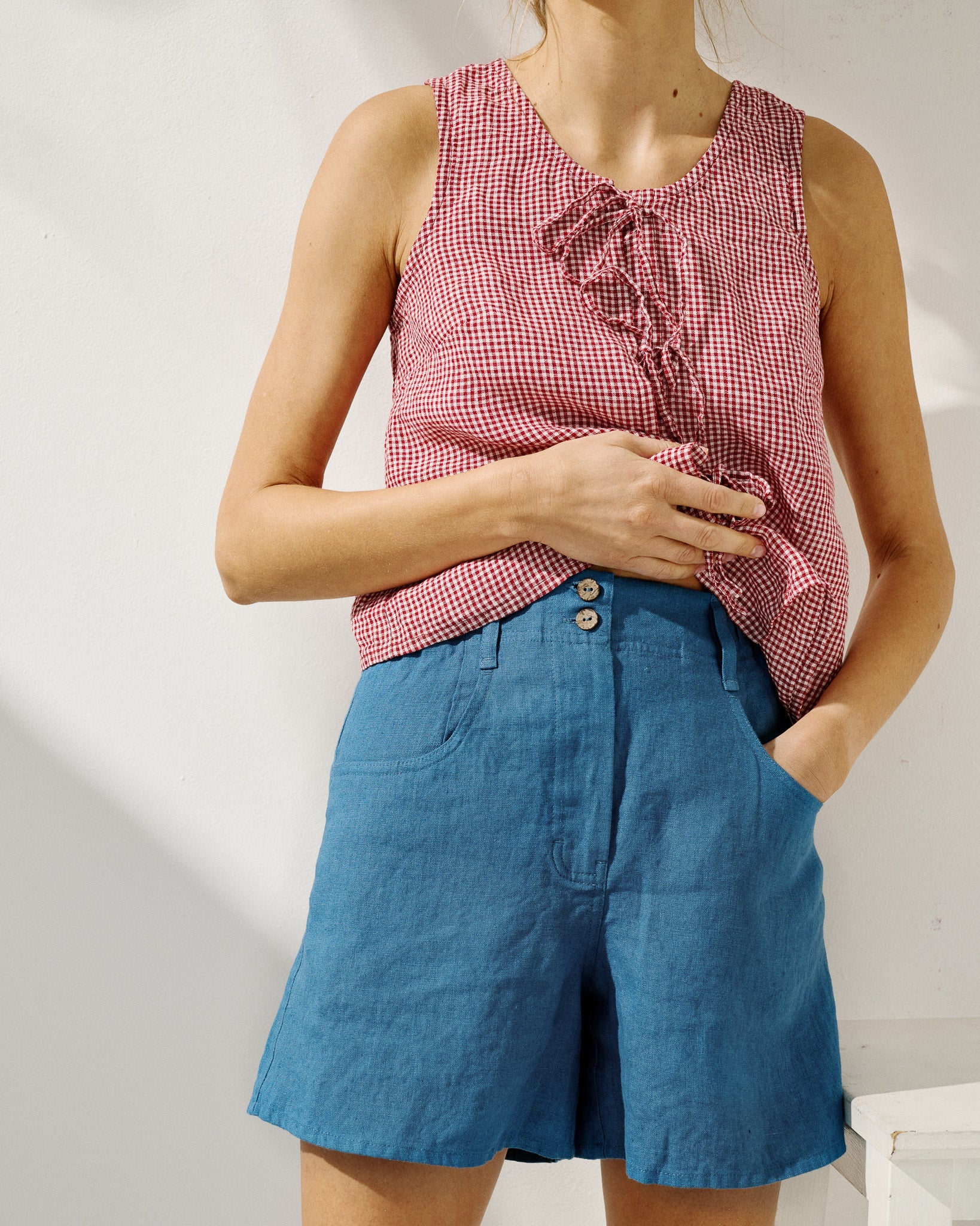 • Model wears a top in light red checks, paired with the Soller shorts in medium weight indigo.