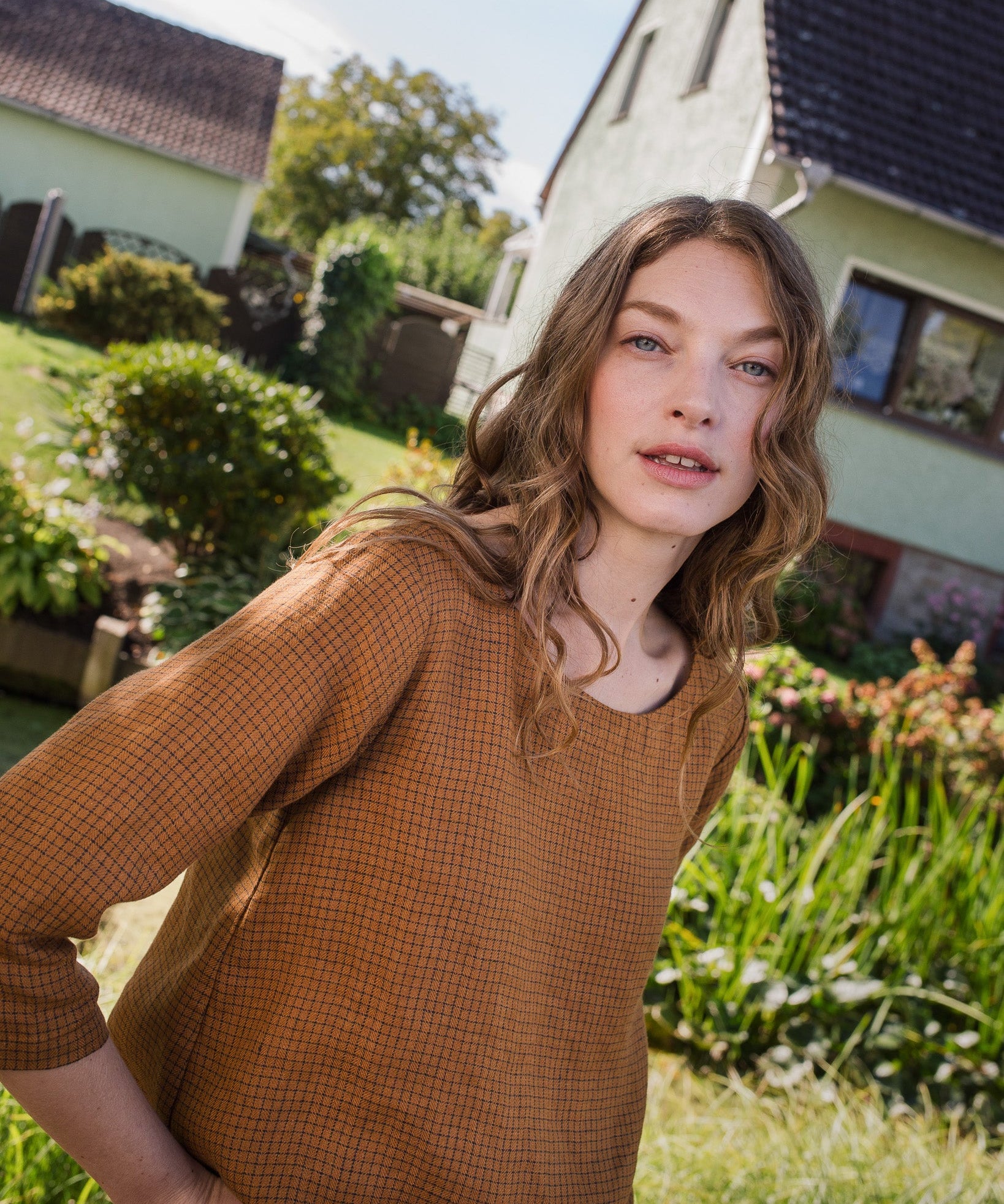 R: JANUARY loose linen top (Color: Mustard Checks; Size: XS)
