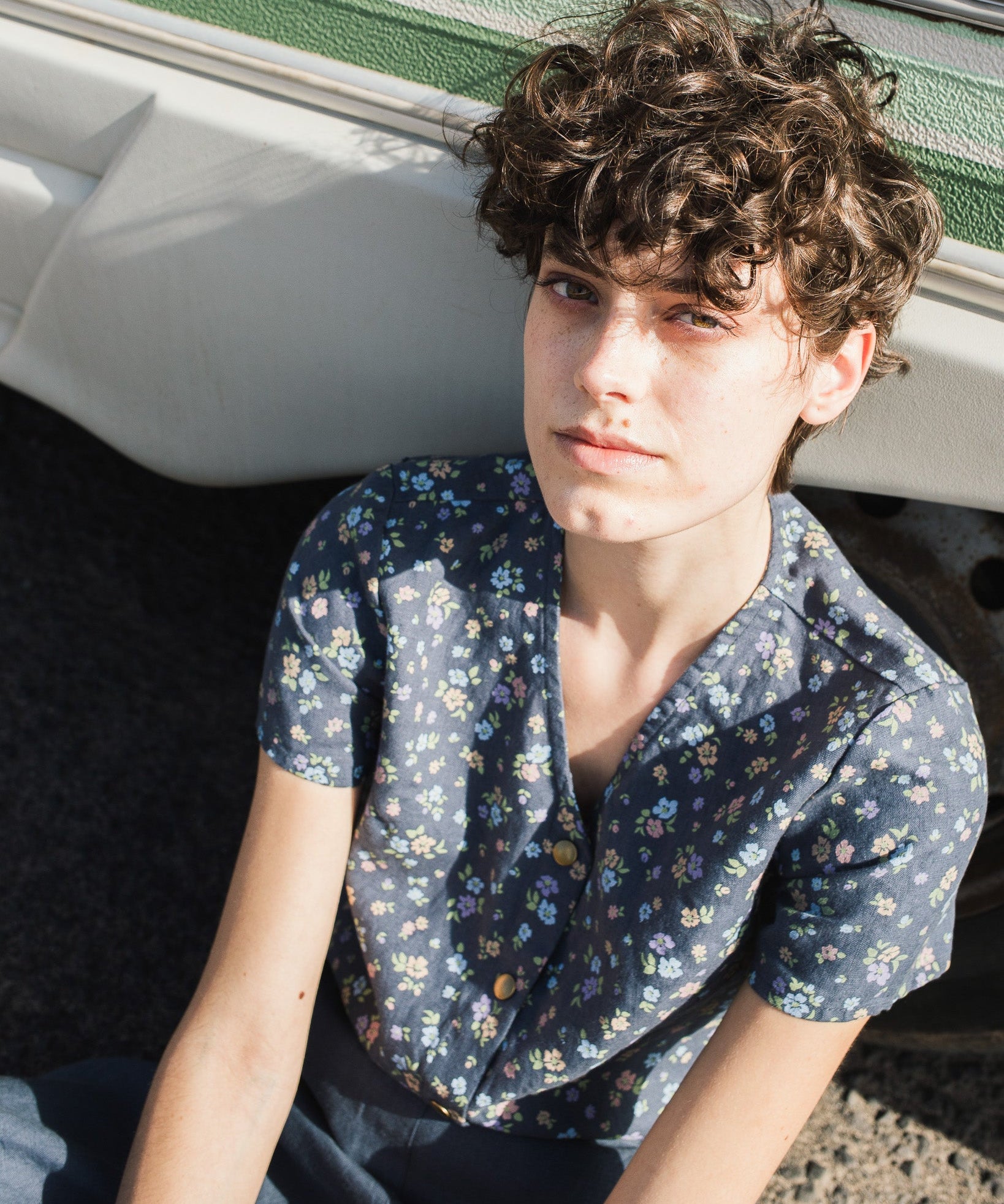 customized: GETTY front snaps linen top (Color: Admiral Blue; Size: S)