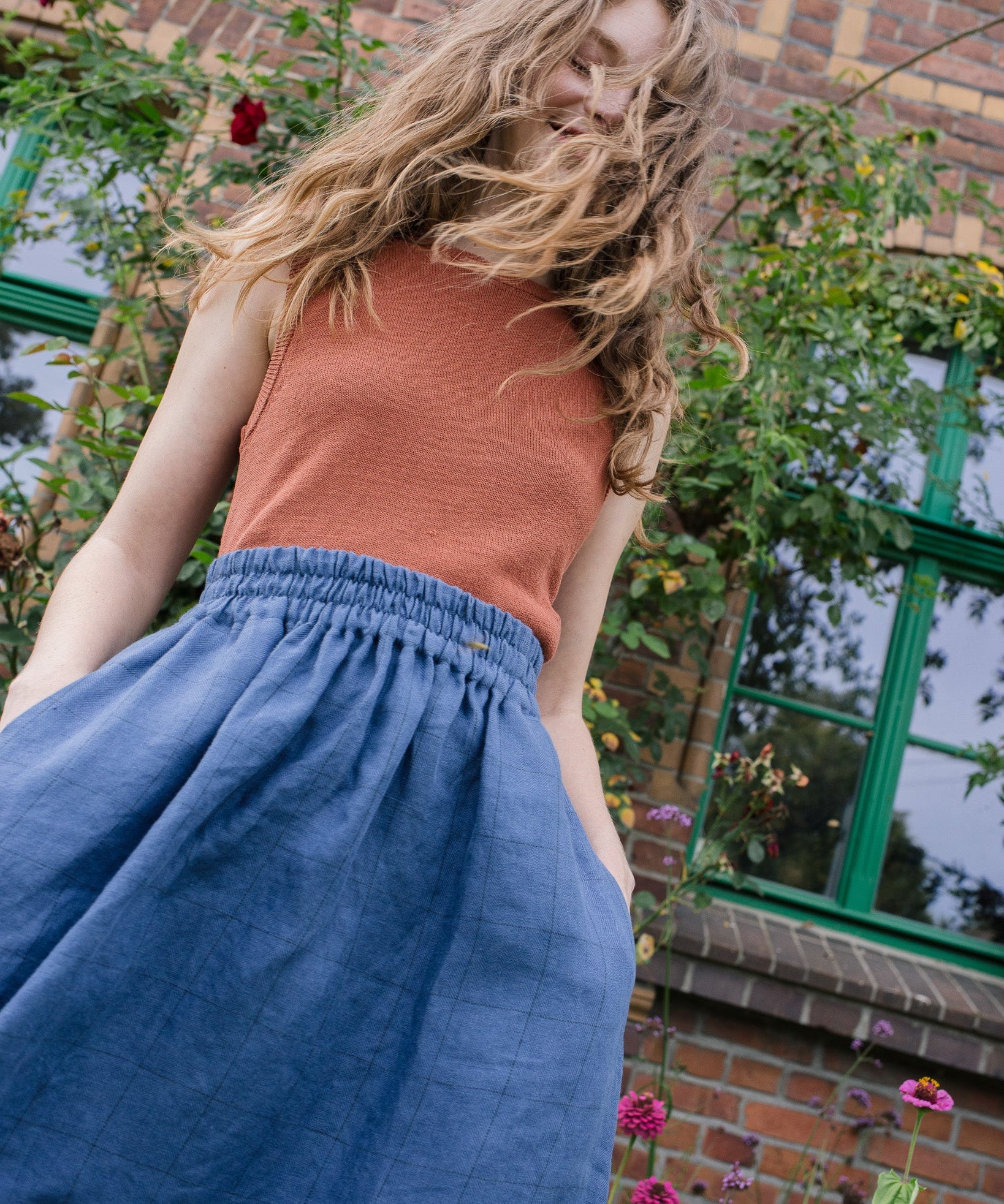 R: SION gathered linen skirt (Color: Delft Blue Checks; Size: XS)