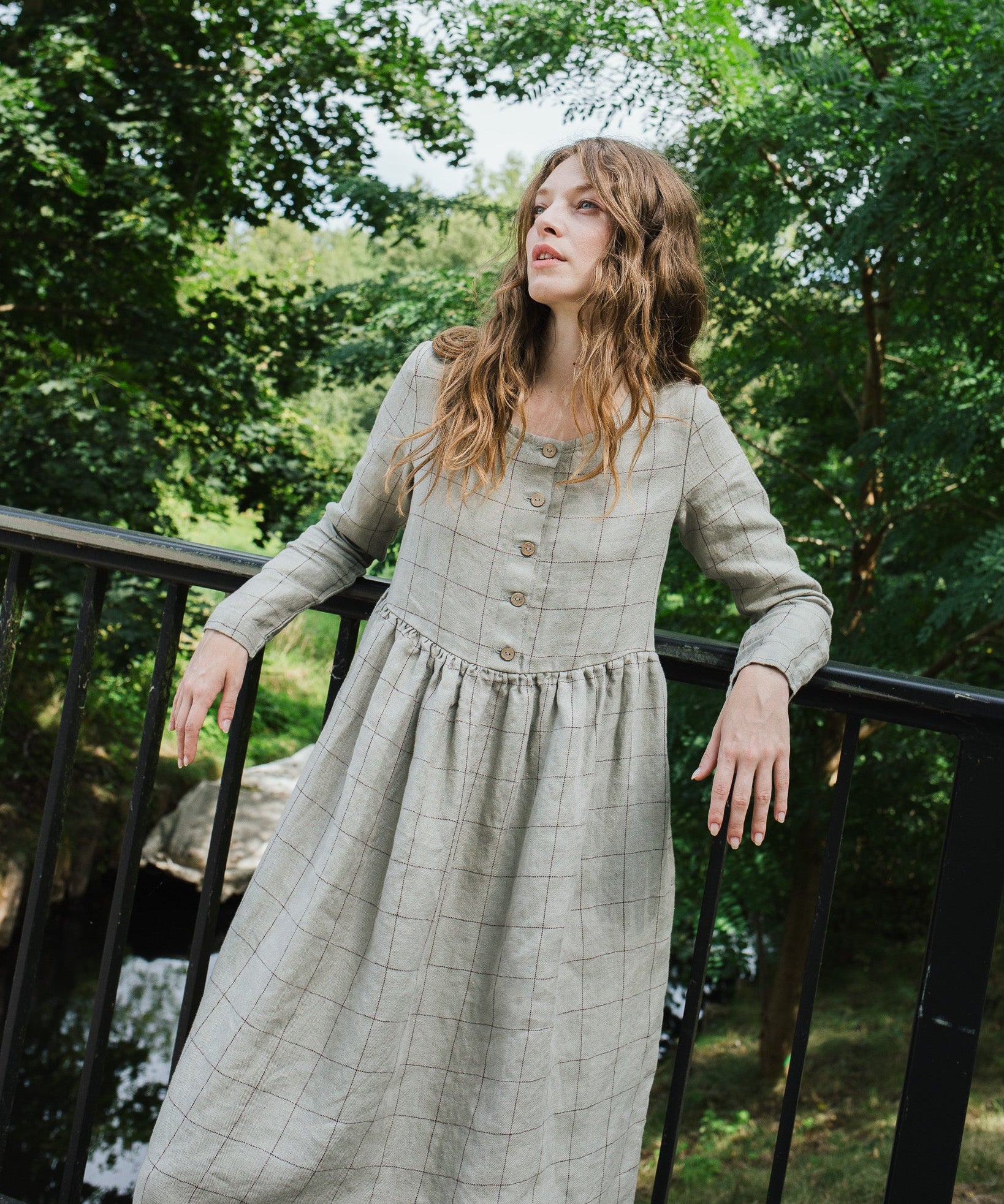 customized: Long sleeve Maxi MAMA linen dress (Color: Grey Checks; Size: S/M - MAXI length)