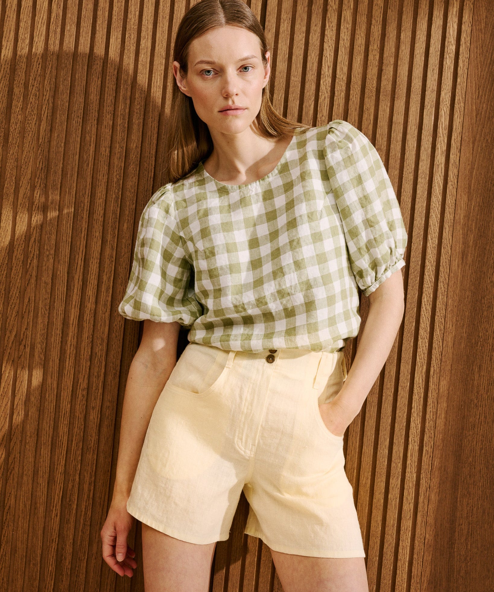 R: RONDA button down linen dress (Color: Mid Sand Gingham; Size: M - MAXI length)