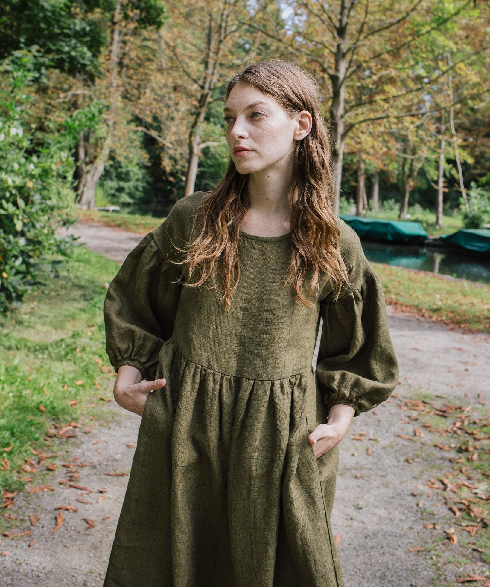 R: MONTMARTE oversized linen dress (Color: Loden Checks; Size: XL)