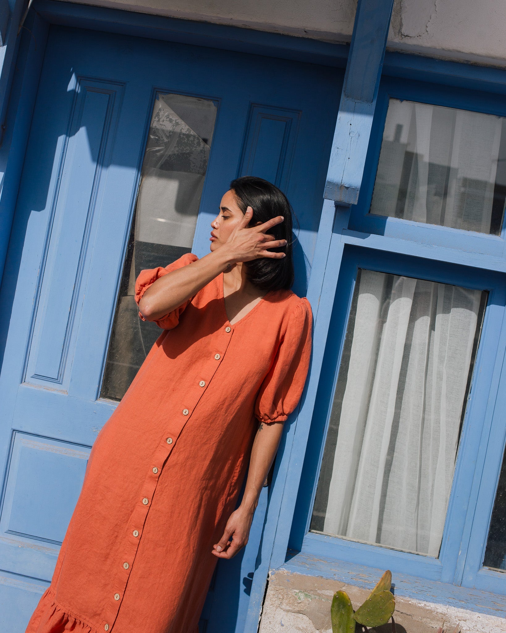 • The model is 5'7" tall (172 cm), size S, and wears a dress in medium weight 'Orange burnt' color.