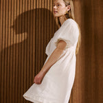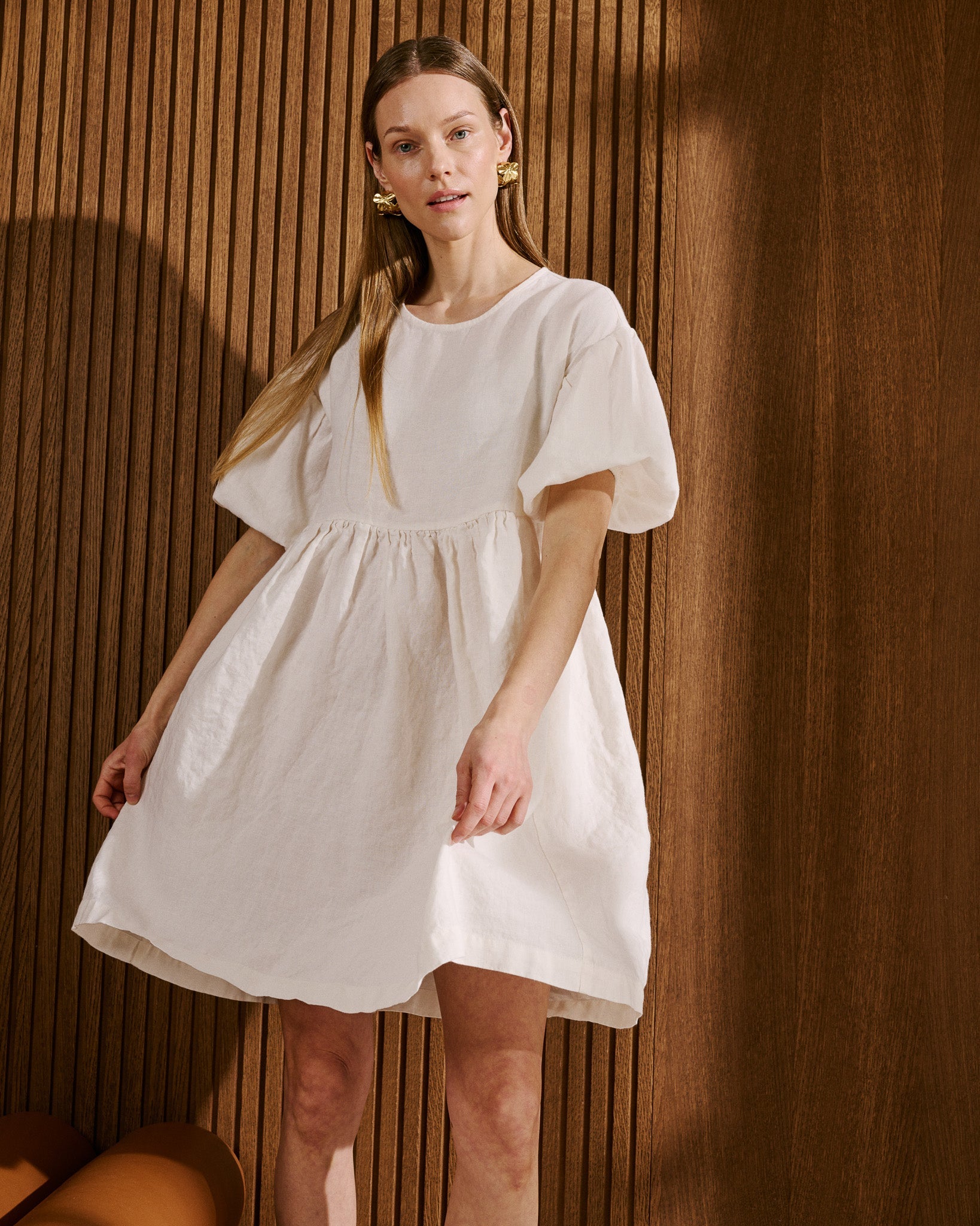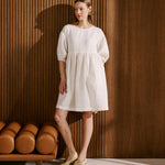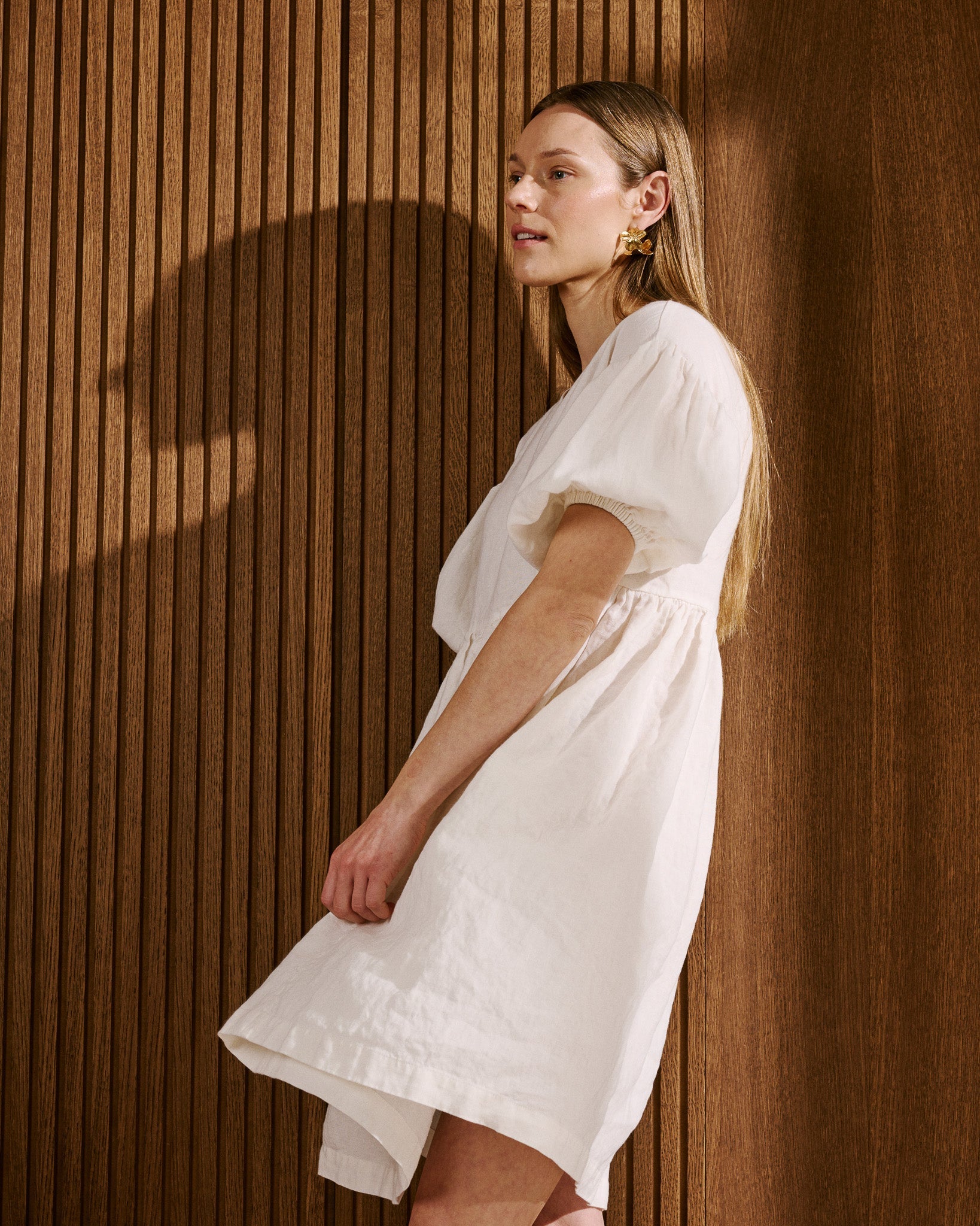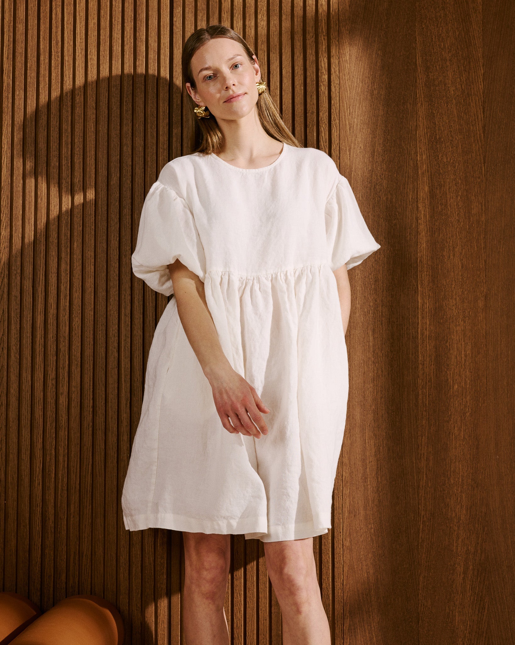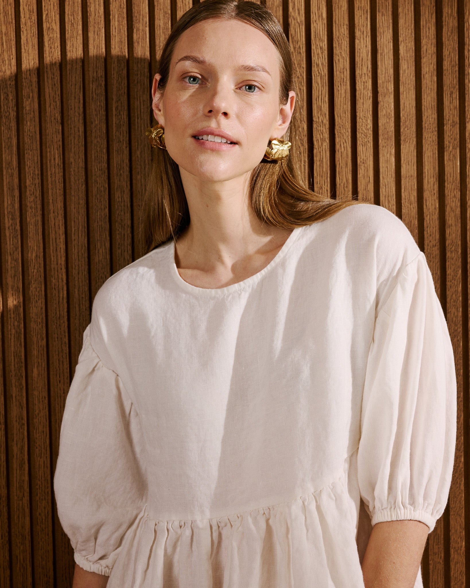 • The model is 5'8" tall (173 cm), size S, and wears a dress in medium weight cream color.