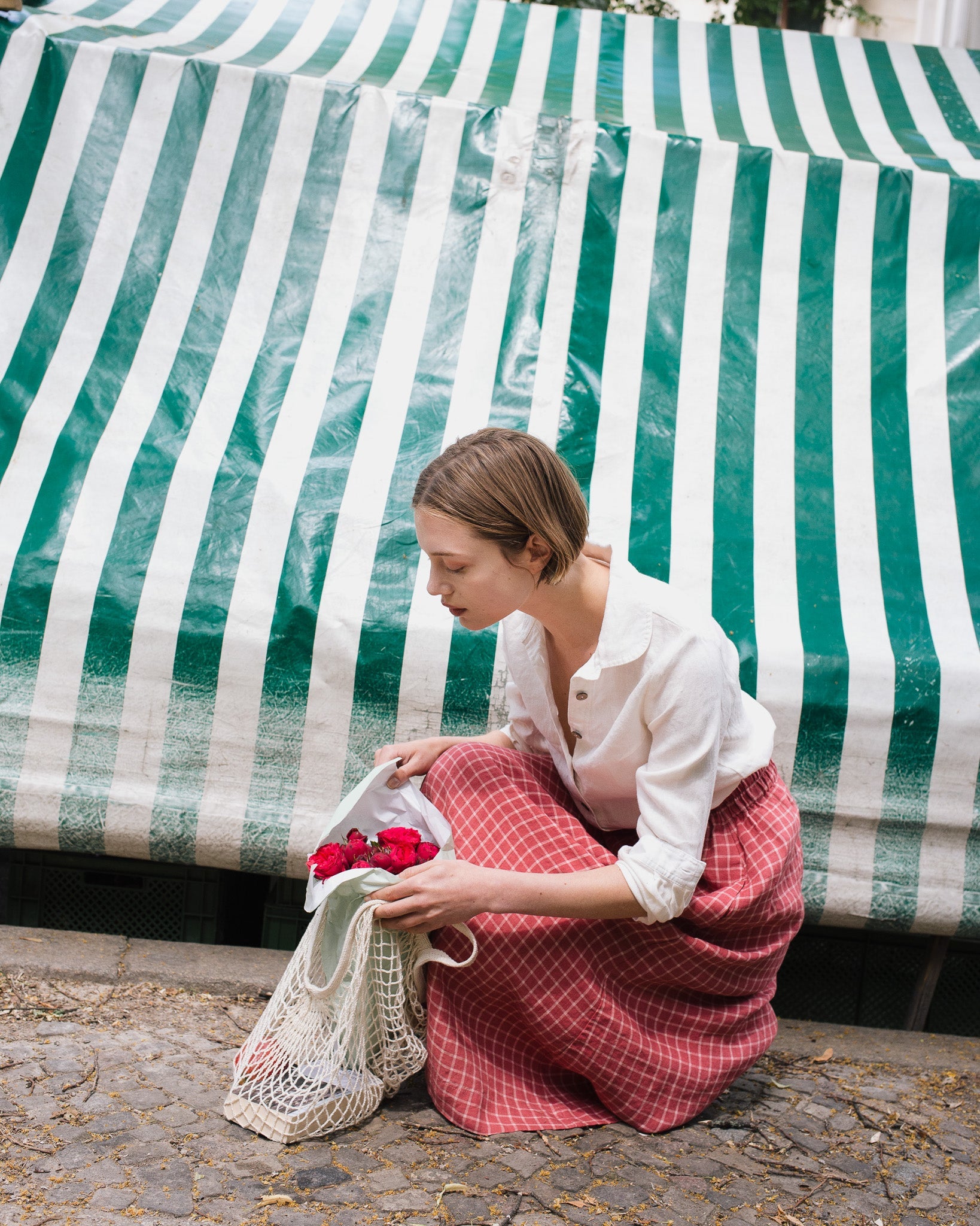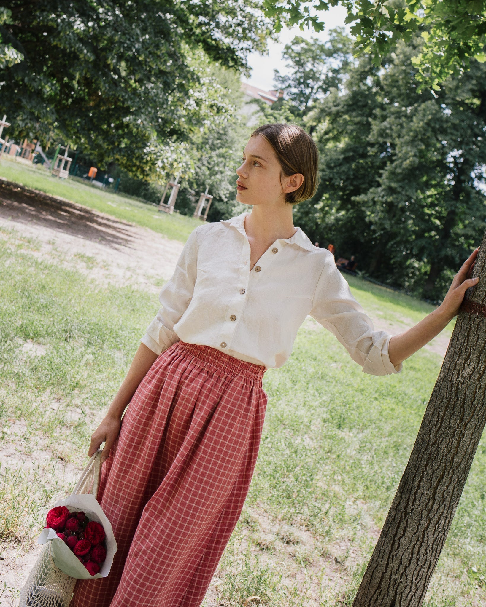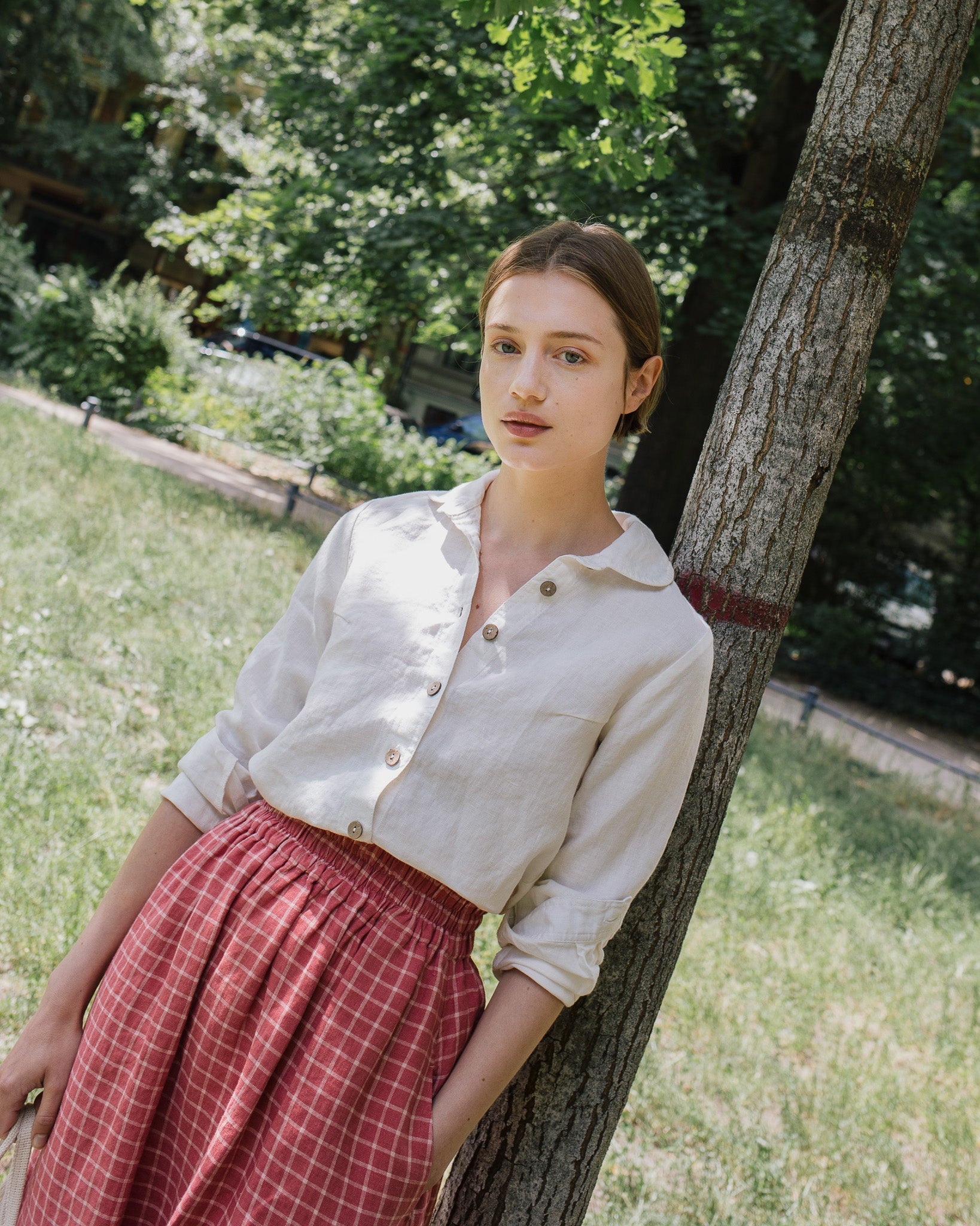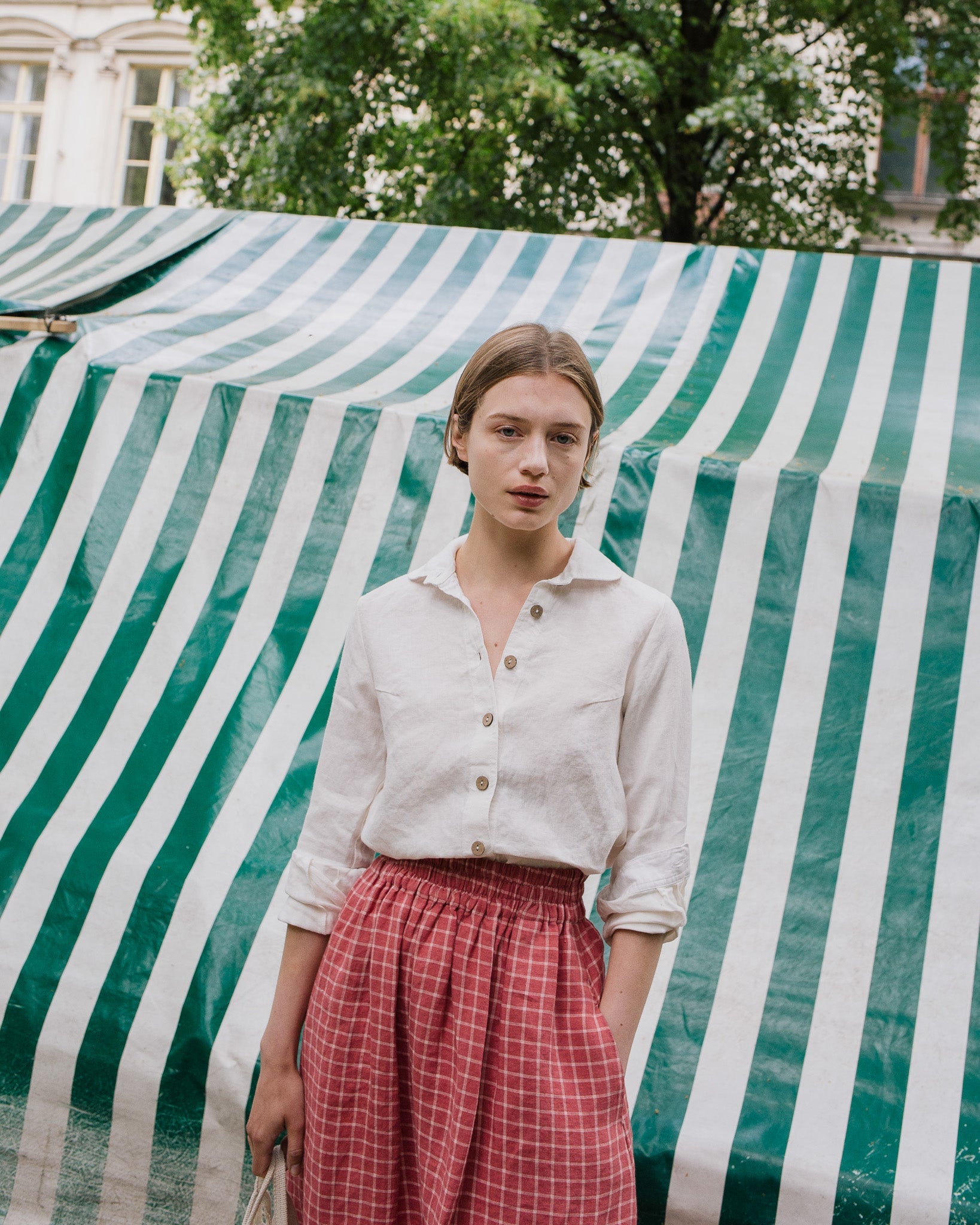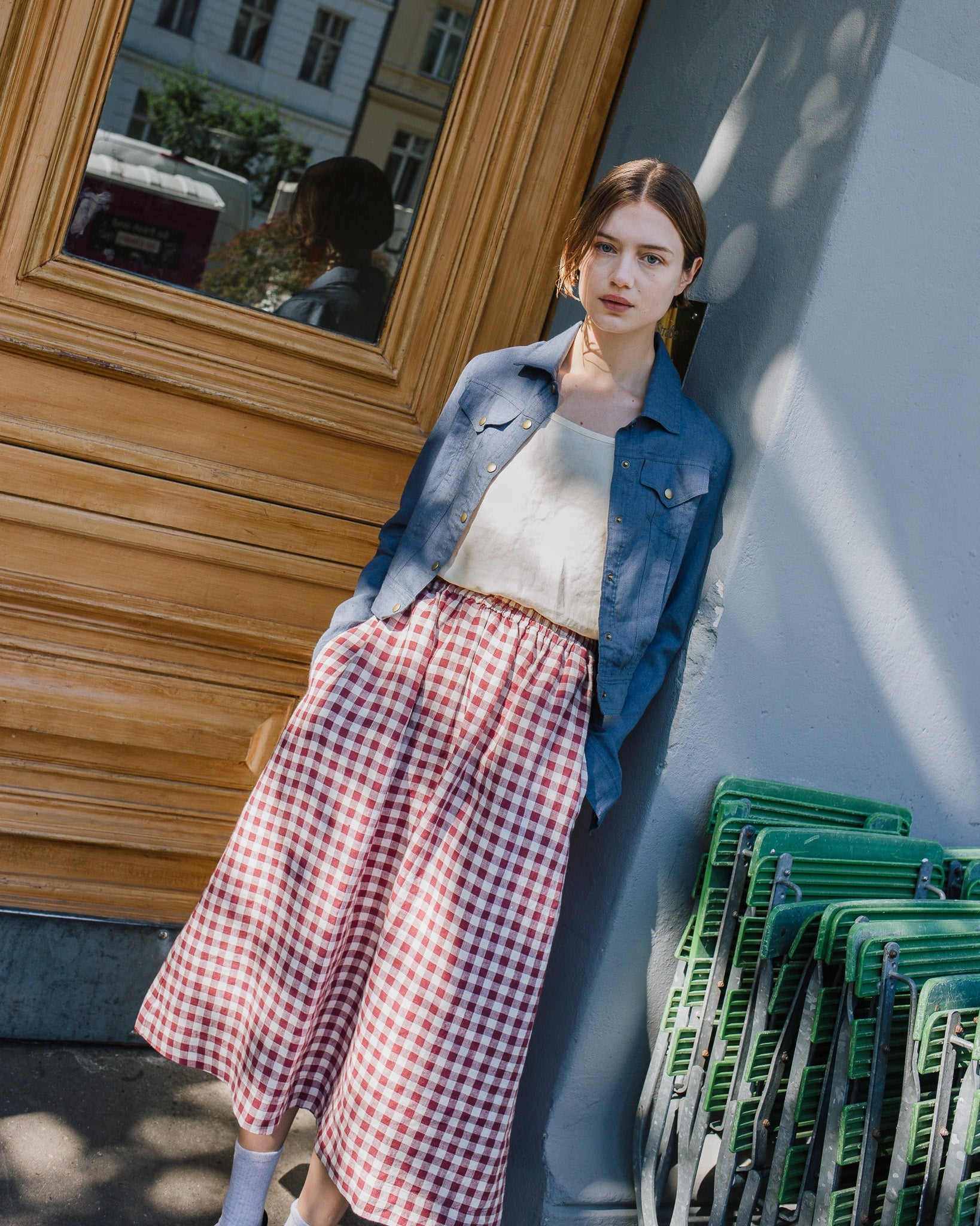 • Model wears a skirt in raspberry grid.