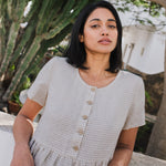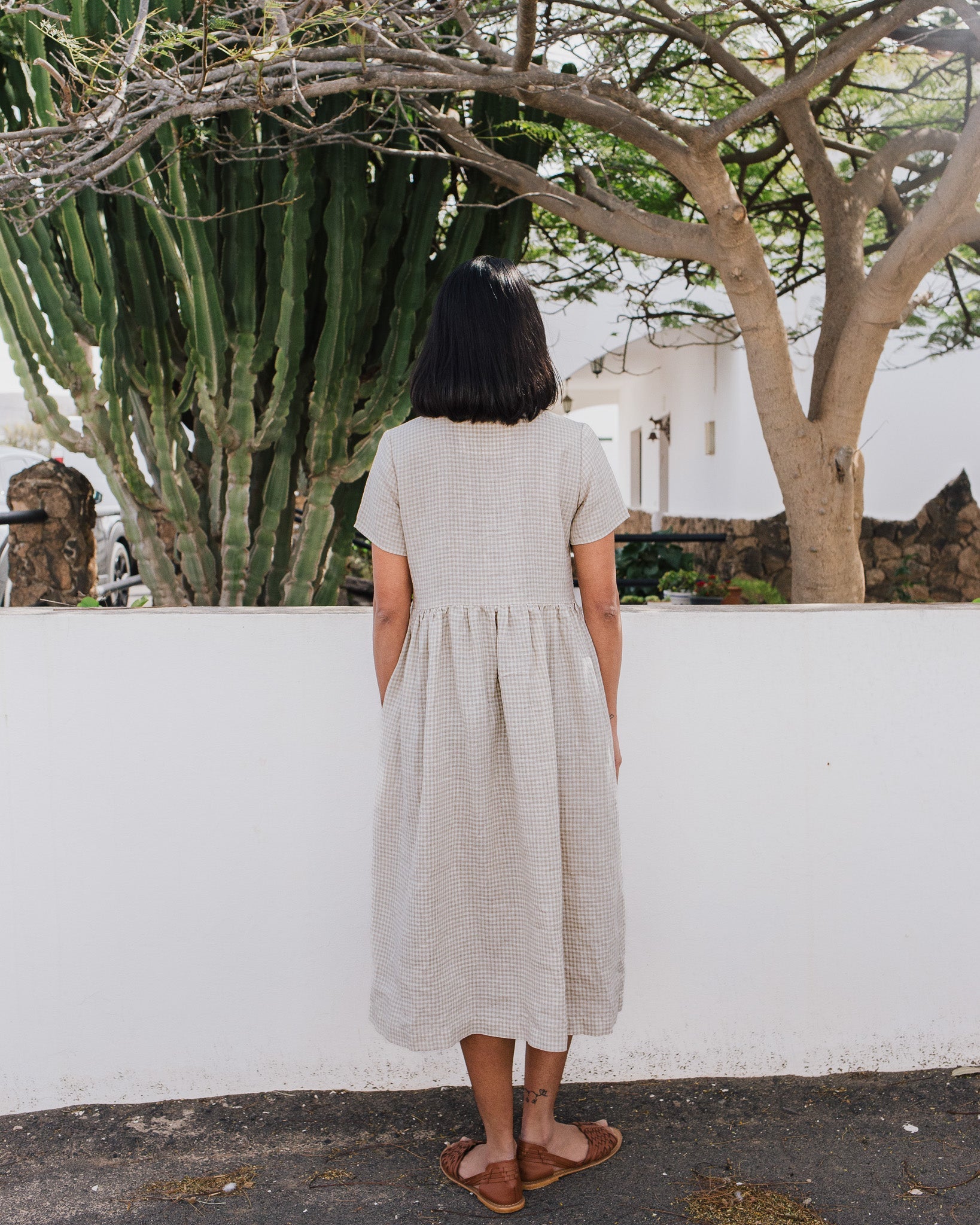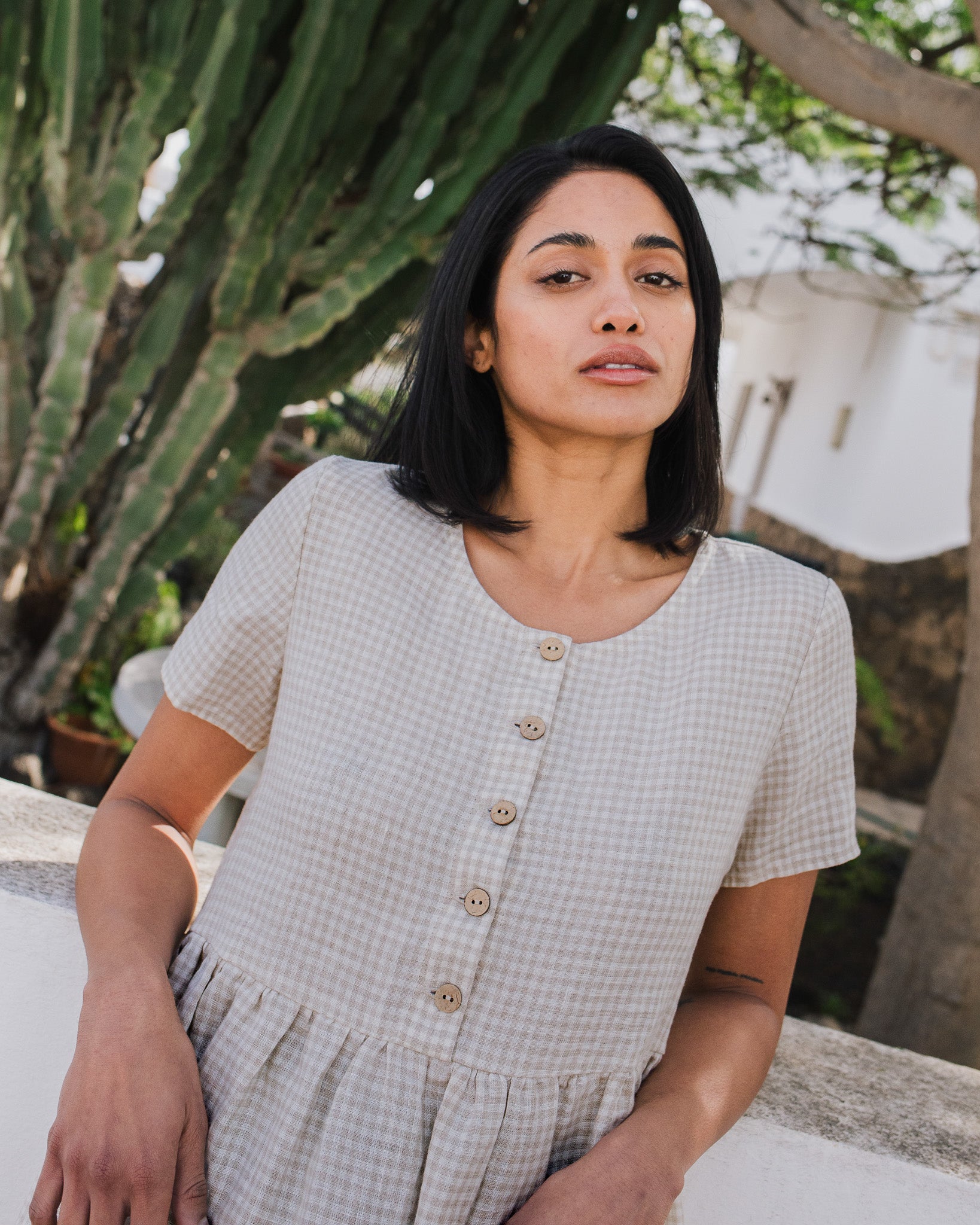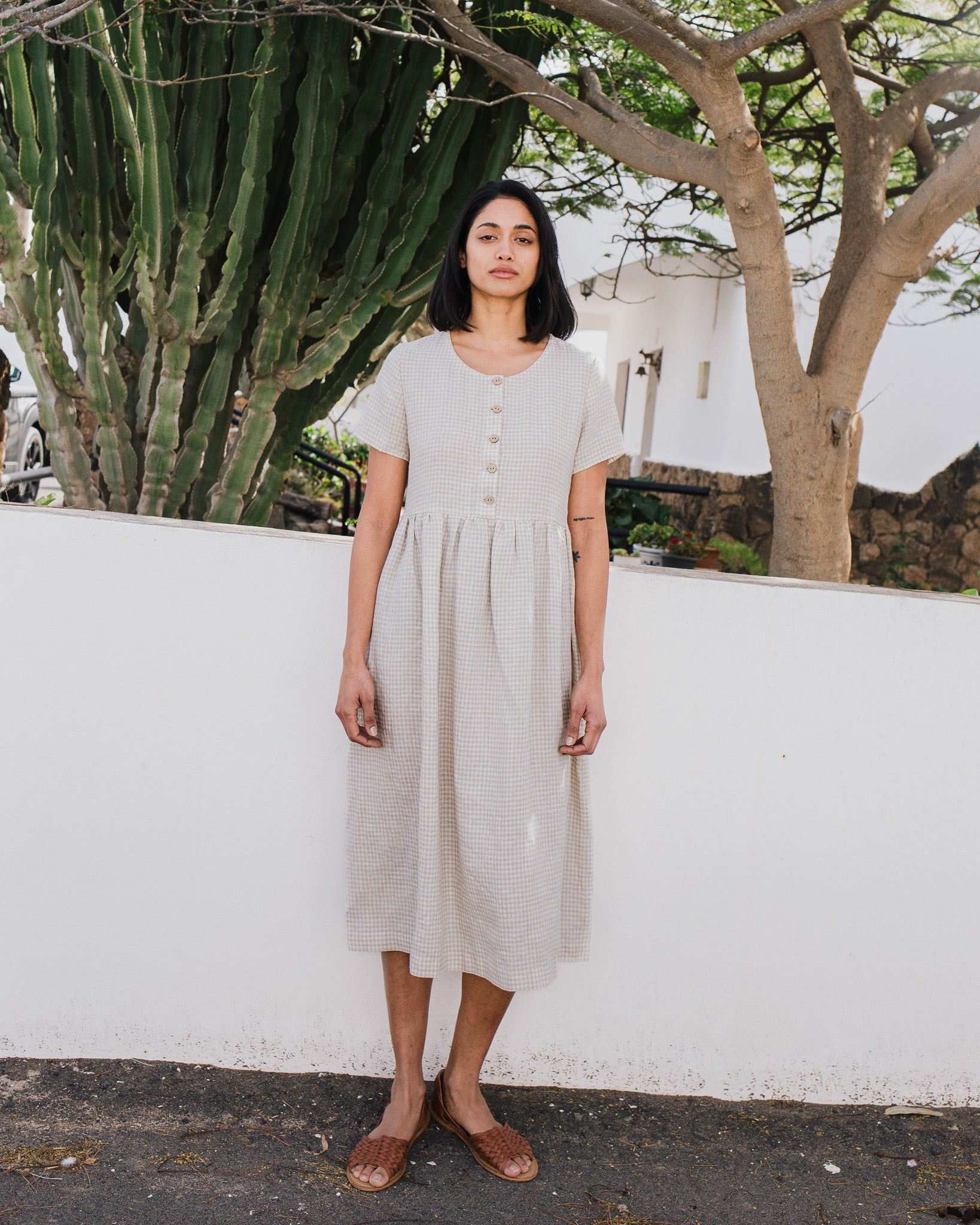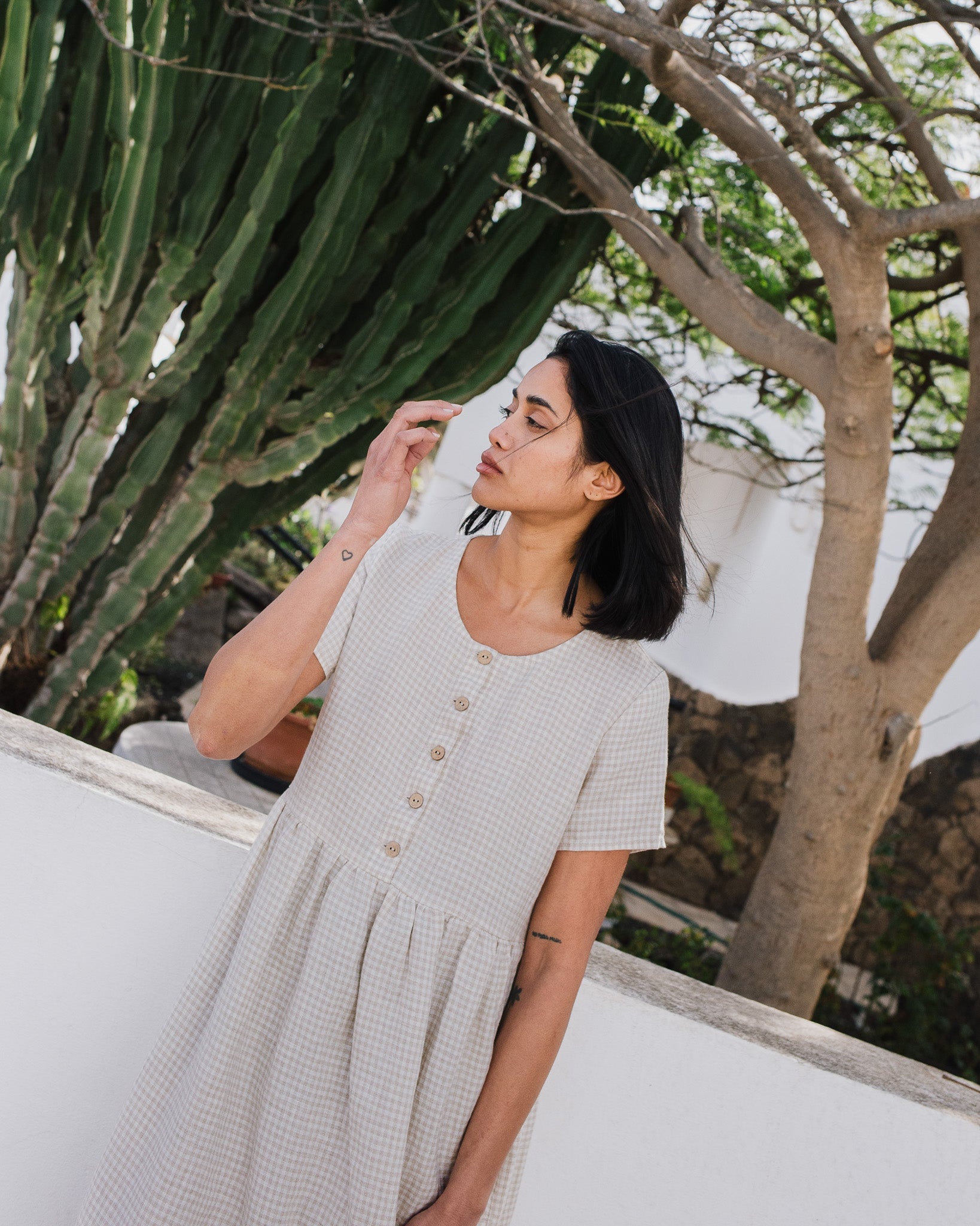 • The model is 5'7" tall (172 cm), size S, and wears a dress in medium weight 'Natural/white gingham" pattern (please note that natural color thread may slightly vary in appearance depending on the season and the color of the raw, undyed flax harvested at that time).