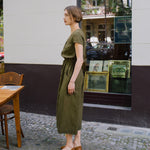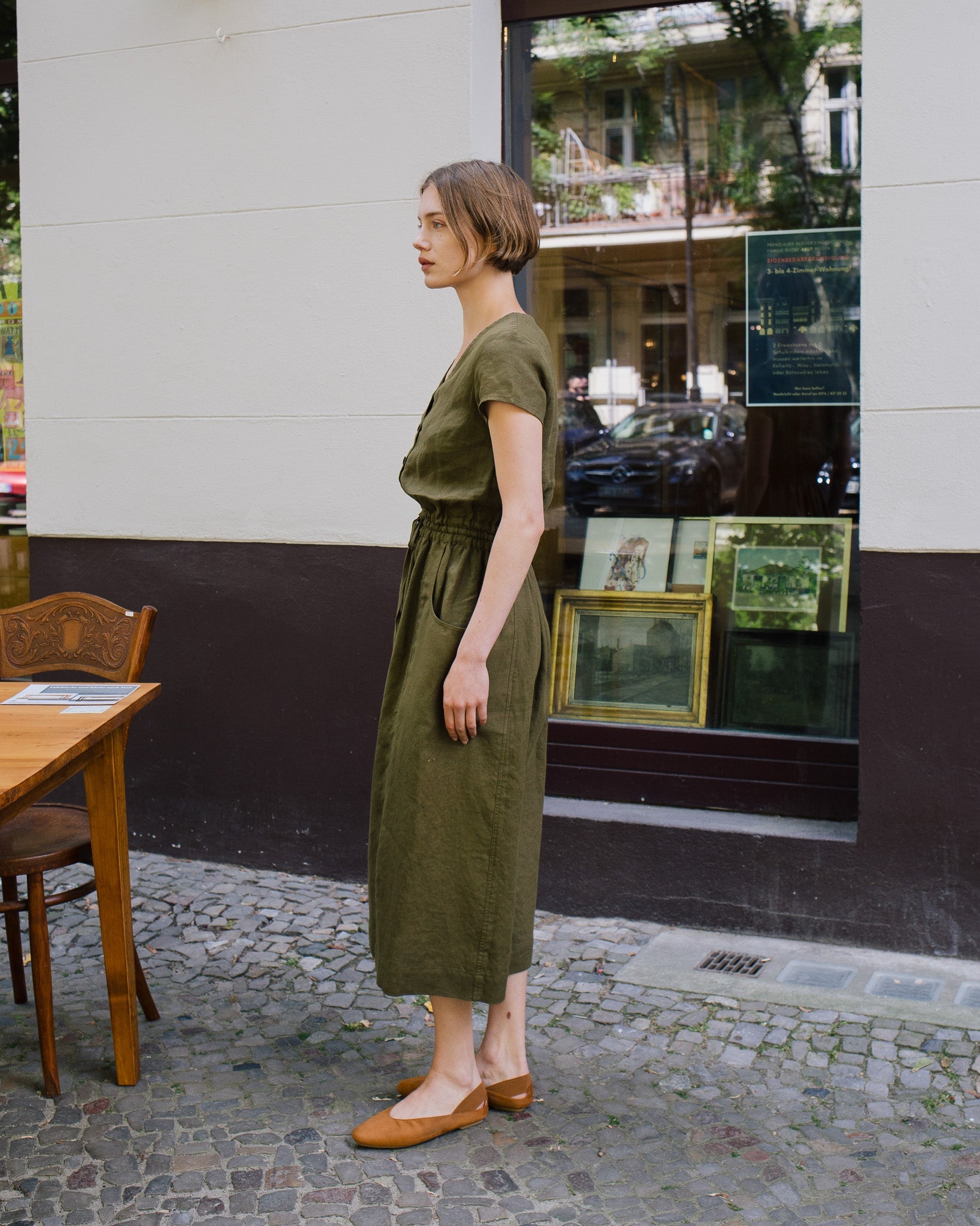 • The model is 5'8" tall (174 cm), size S, and wears a dress in medium weight 'Loden Green' color.