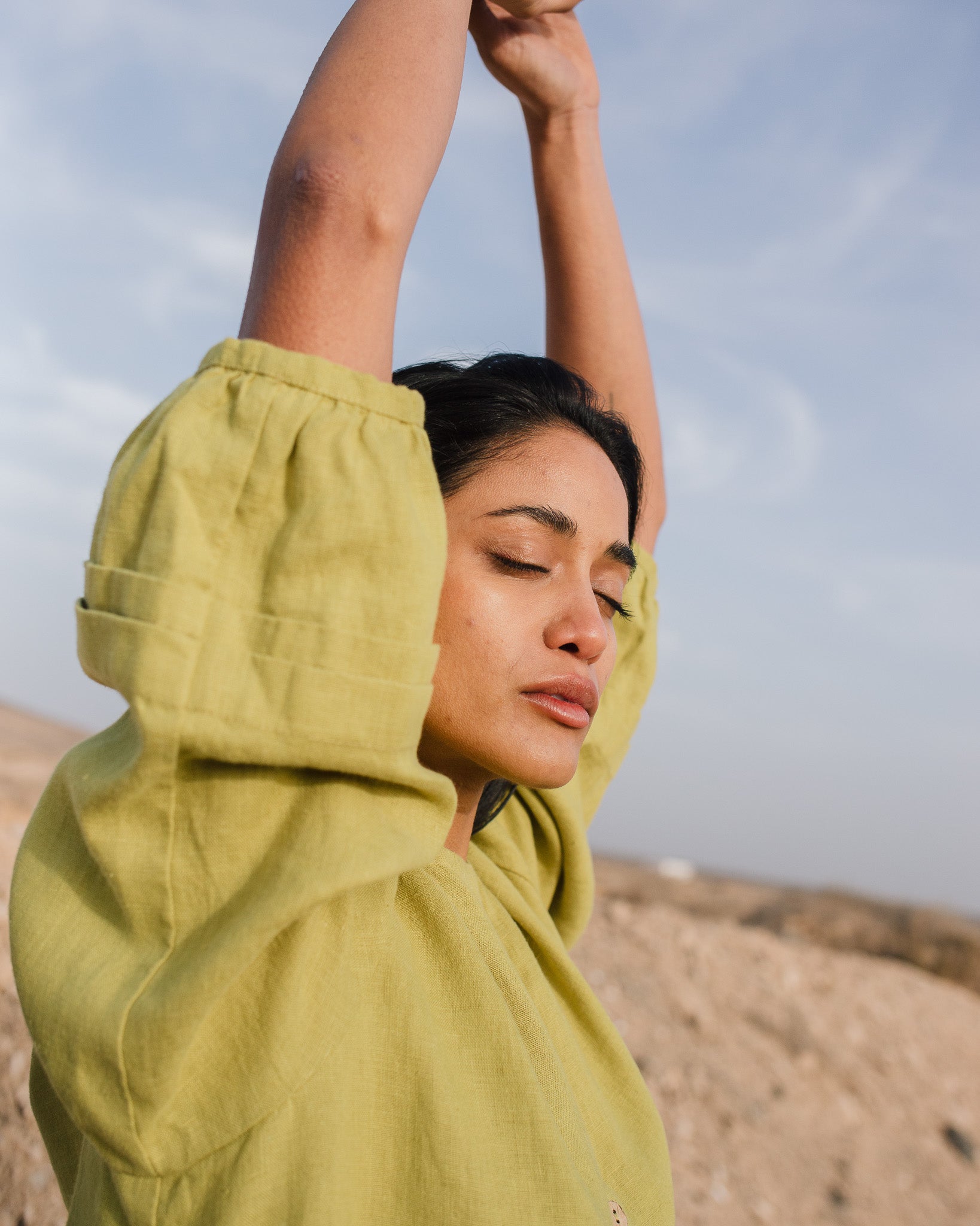 • Billowy sleeves with subtle pleated detailing.