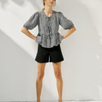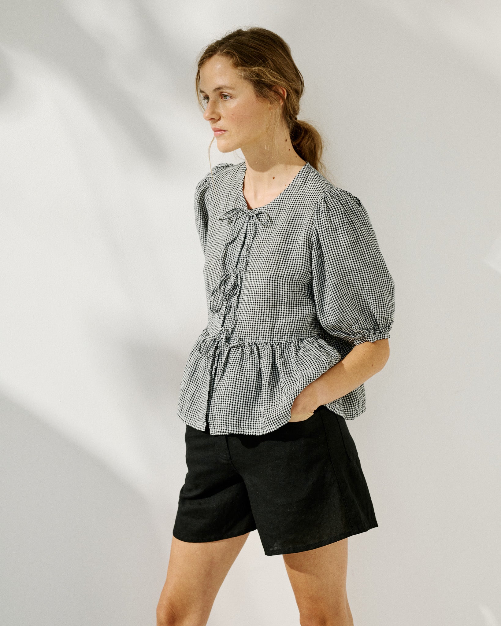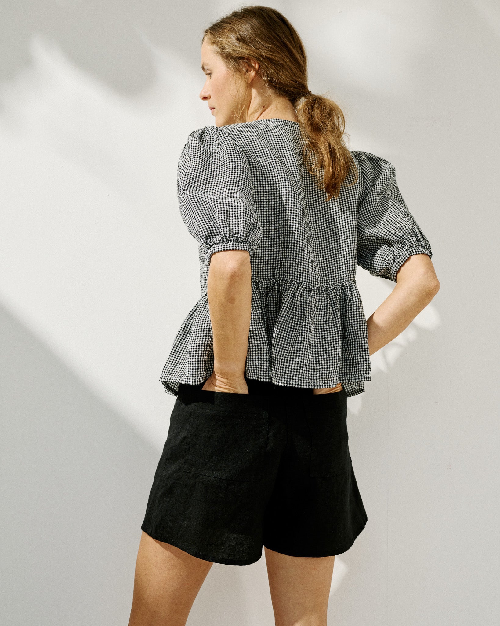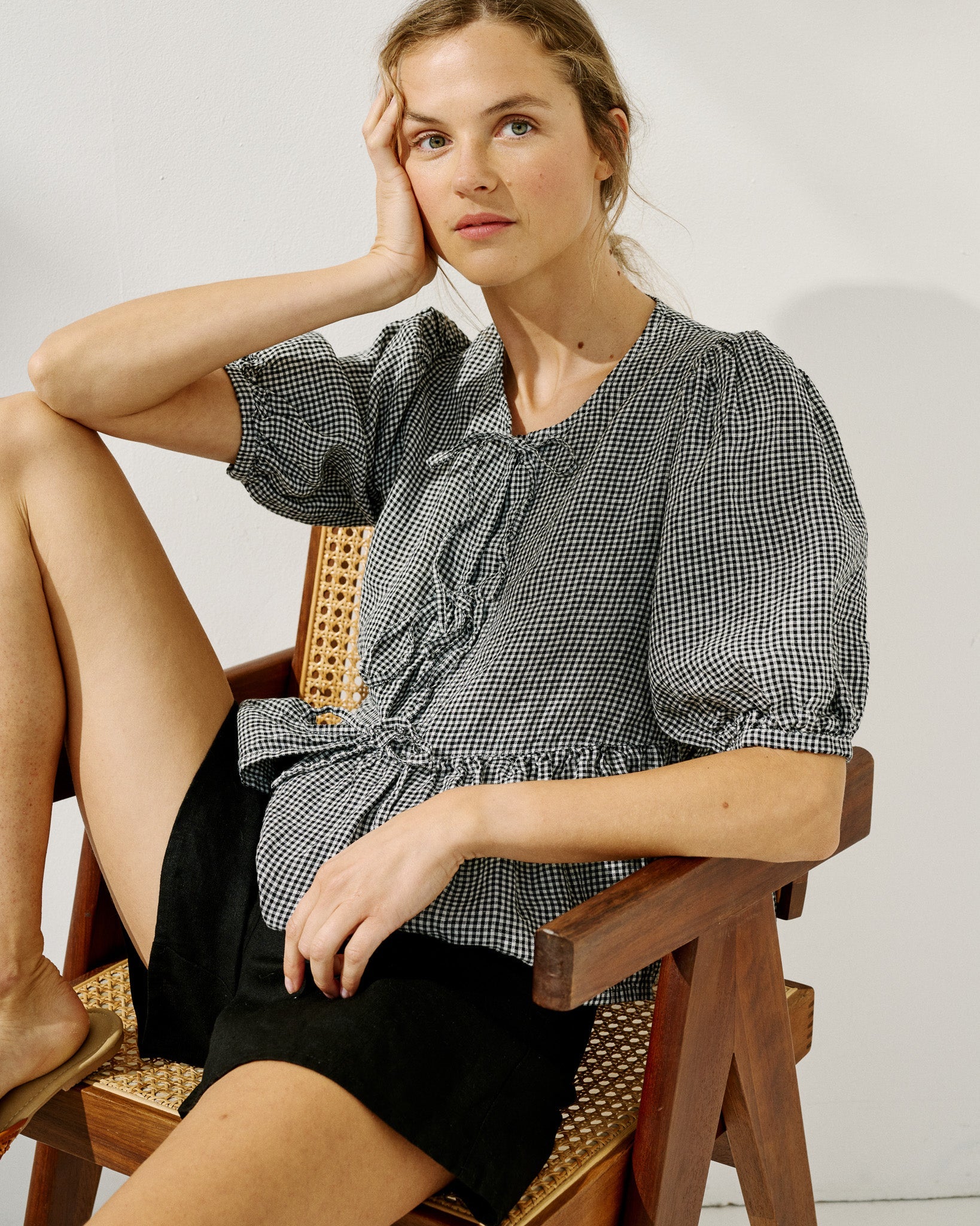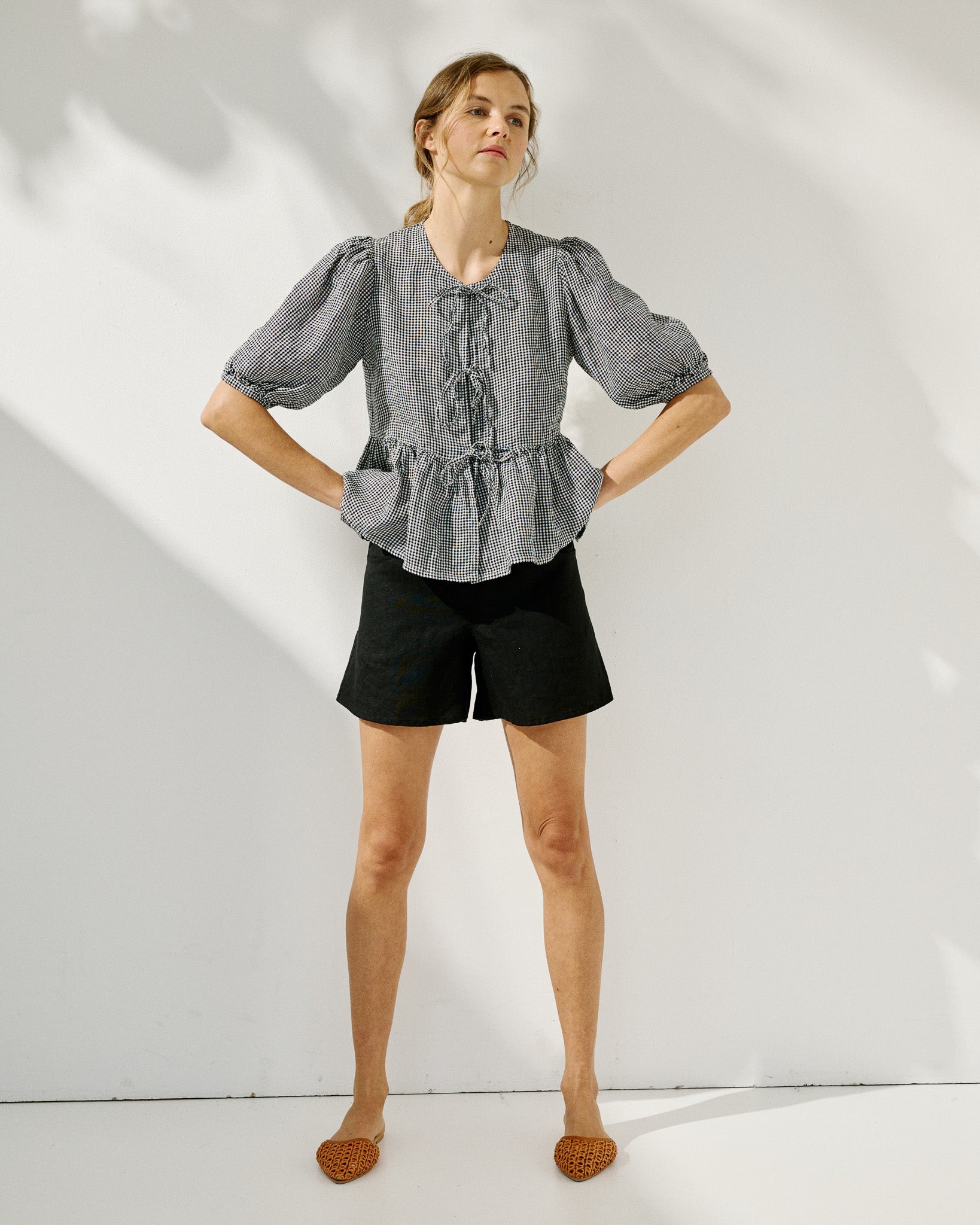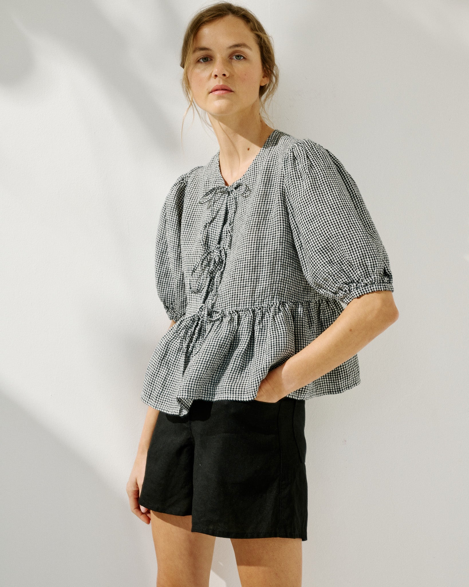 • Model wears a top in light red checks, paired with Soller shorts in medium weight deepest black.