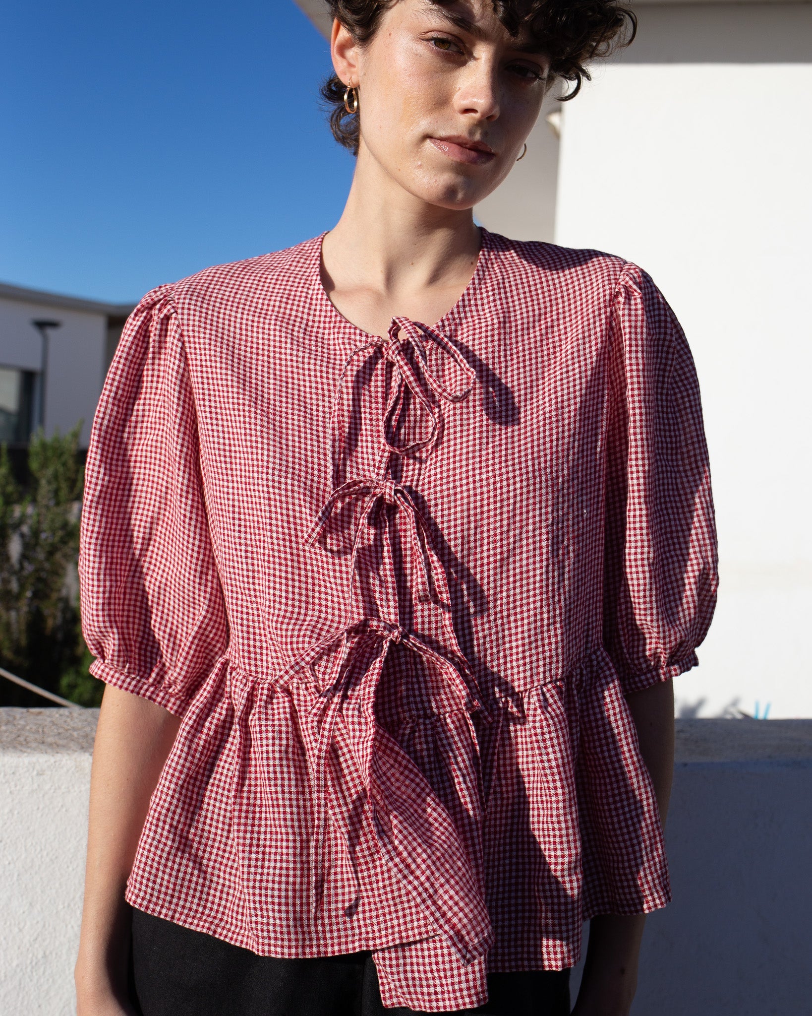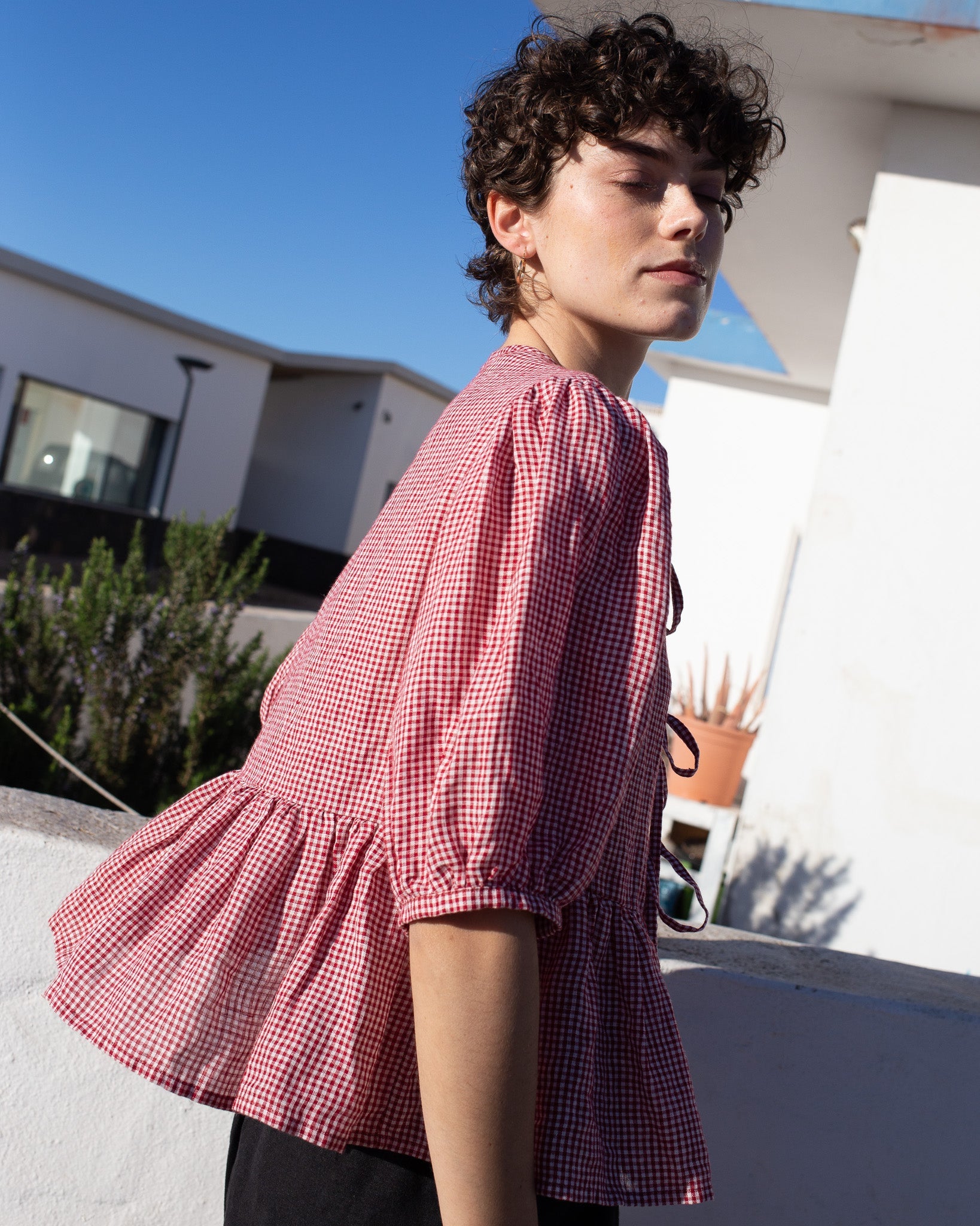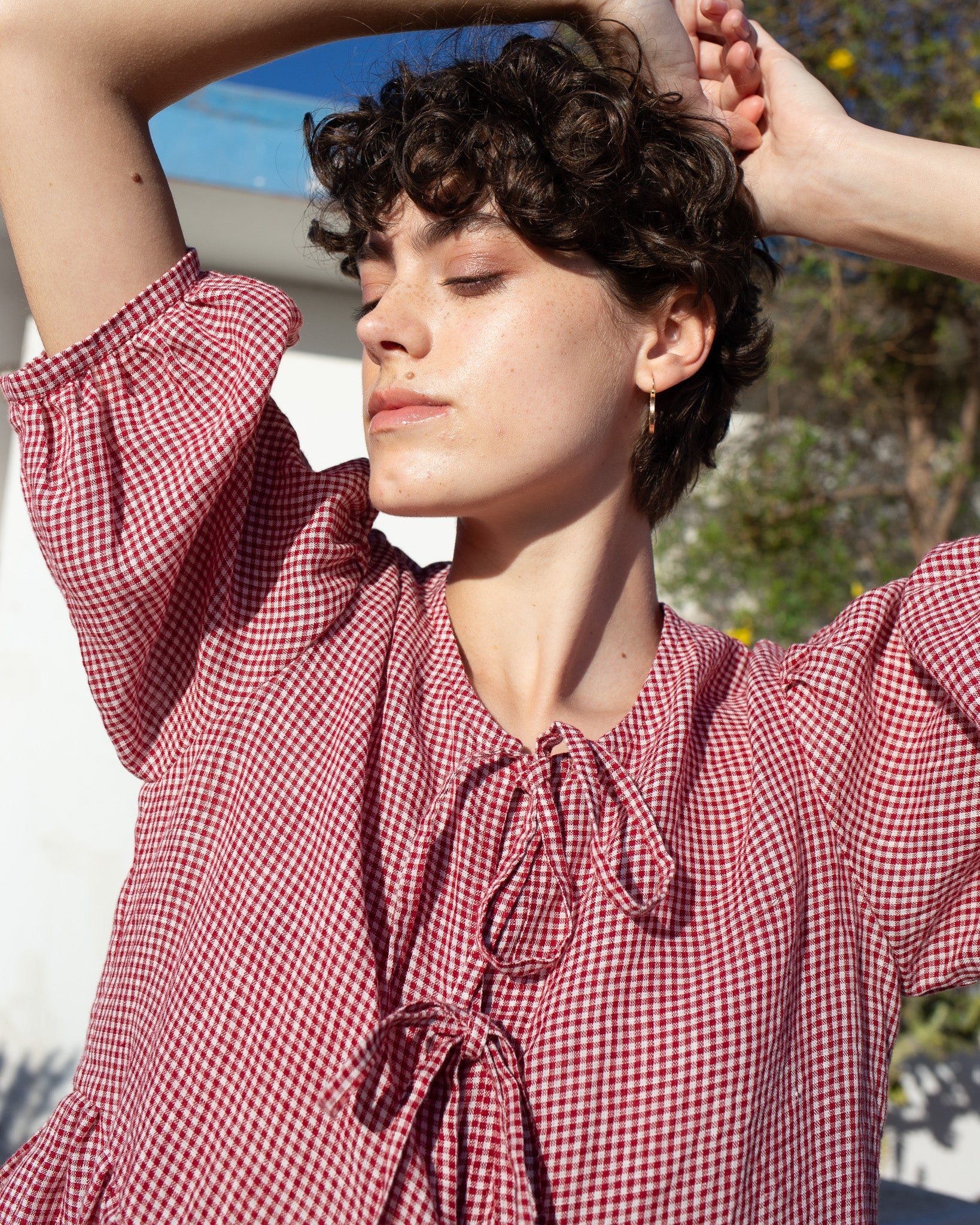 Woman wearing a red and white checkered linen dress with arms raised outdoors.