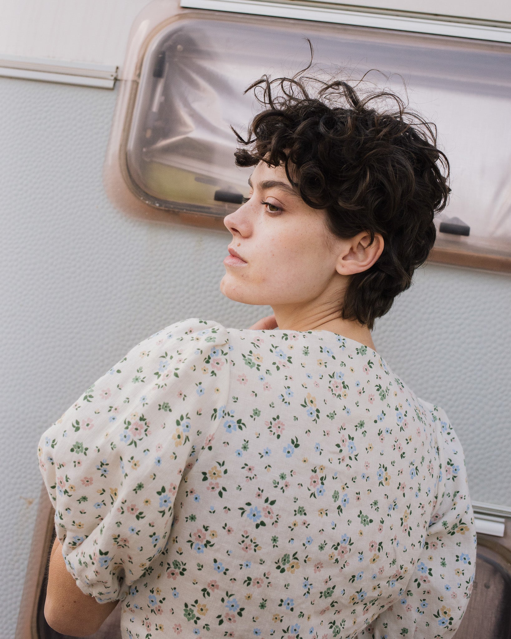 • The model is 5'10" tall (177 cm), size S, and wears a shirt in medium weight 'Antique petals' pattern.