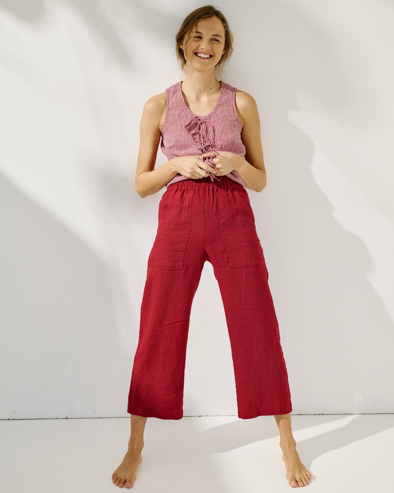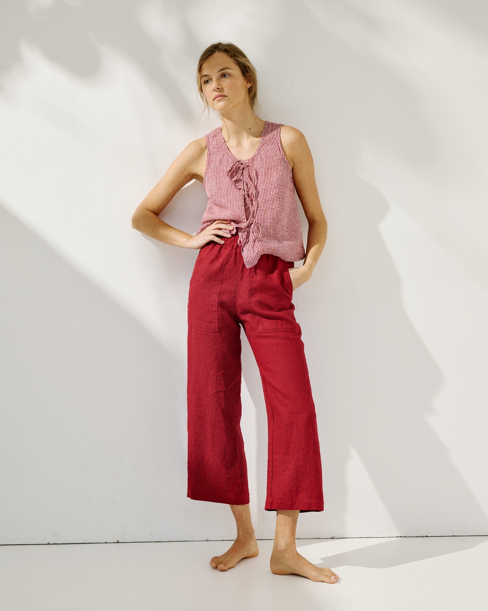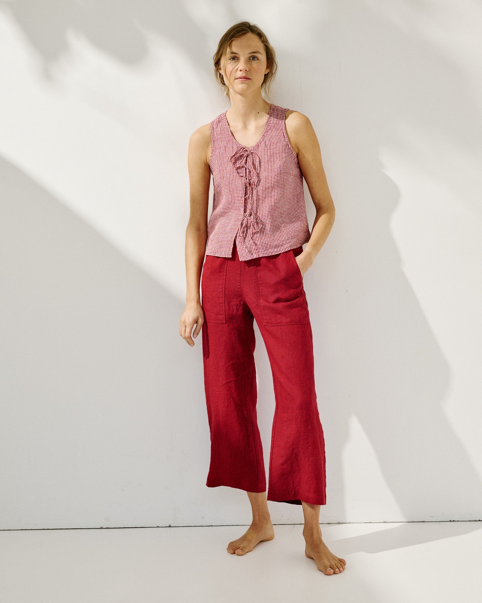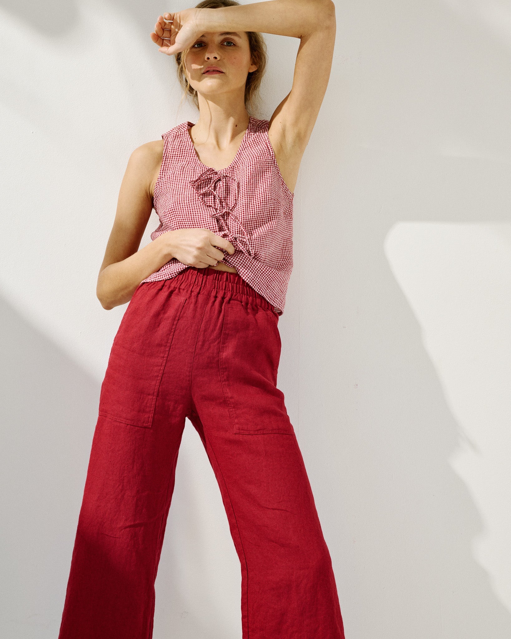 • Model wears a top in light red checks, paired with Puglia pants in medium red wine color.