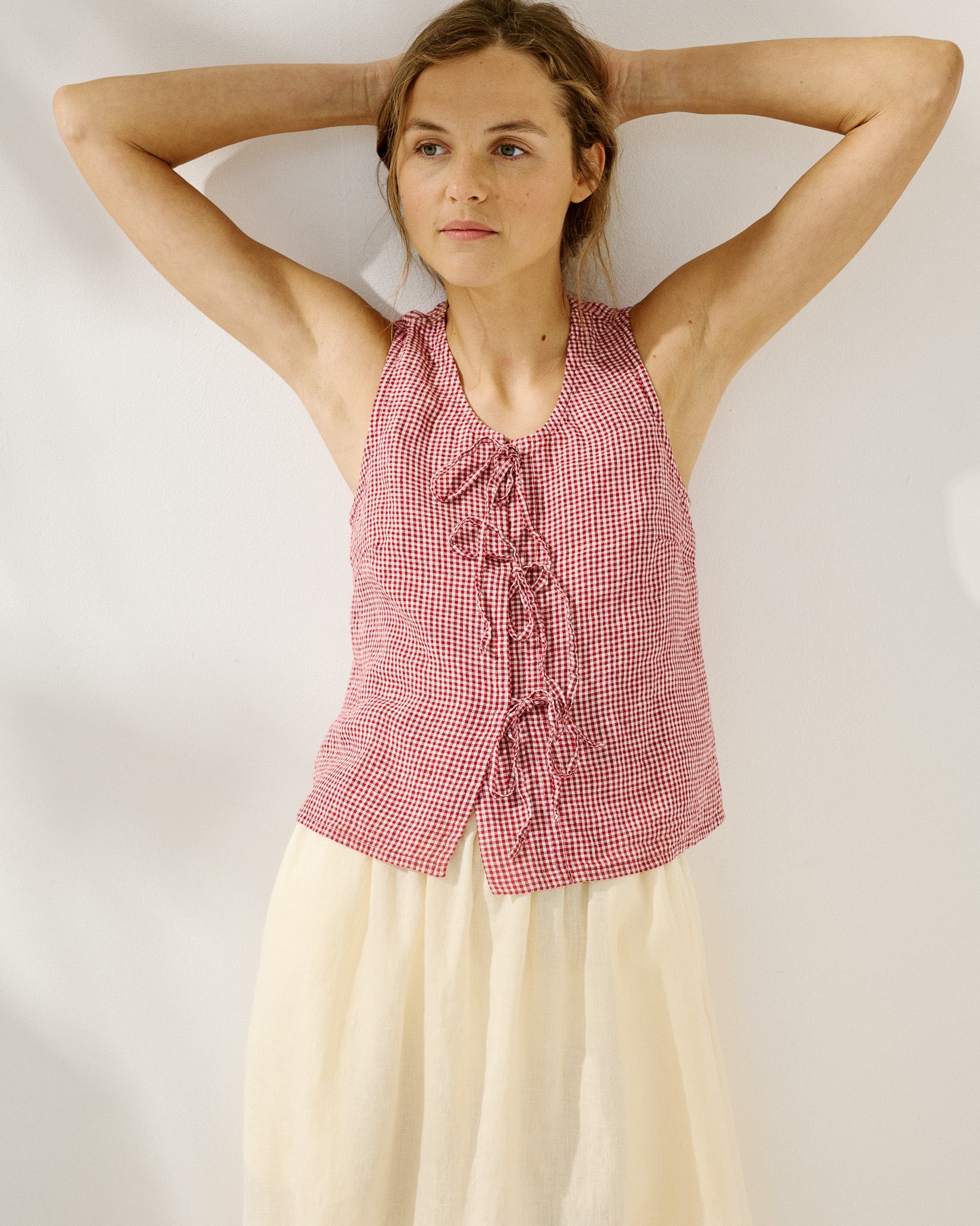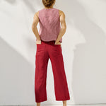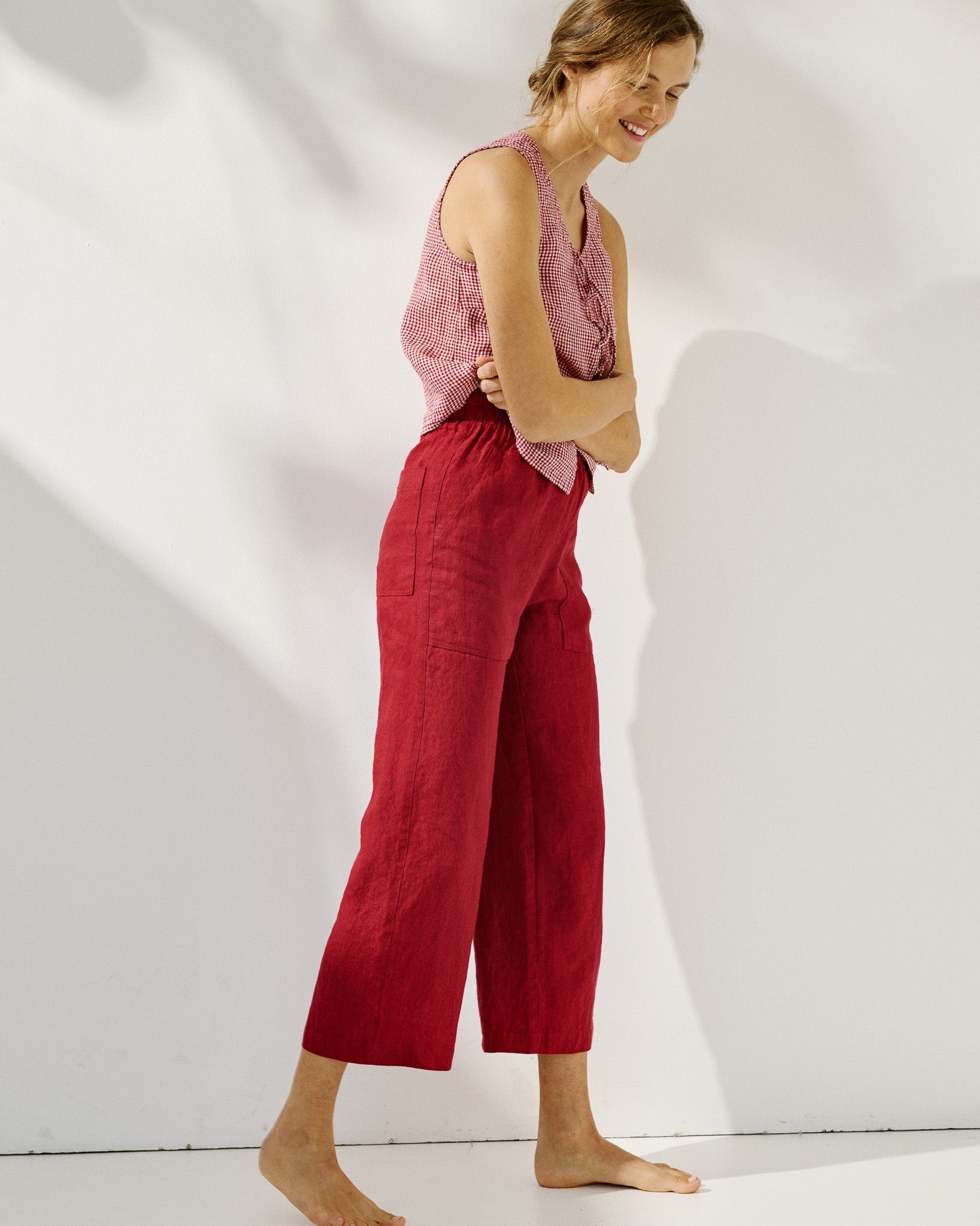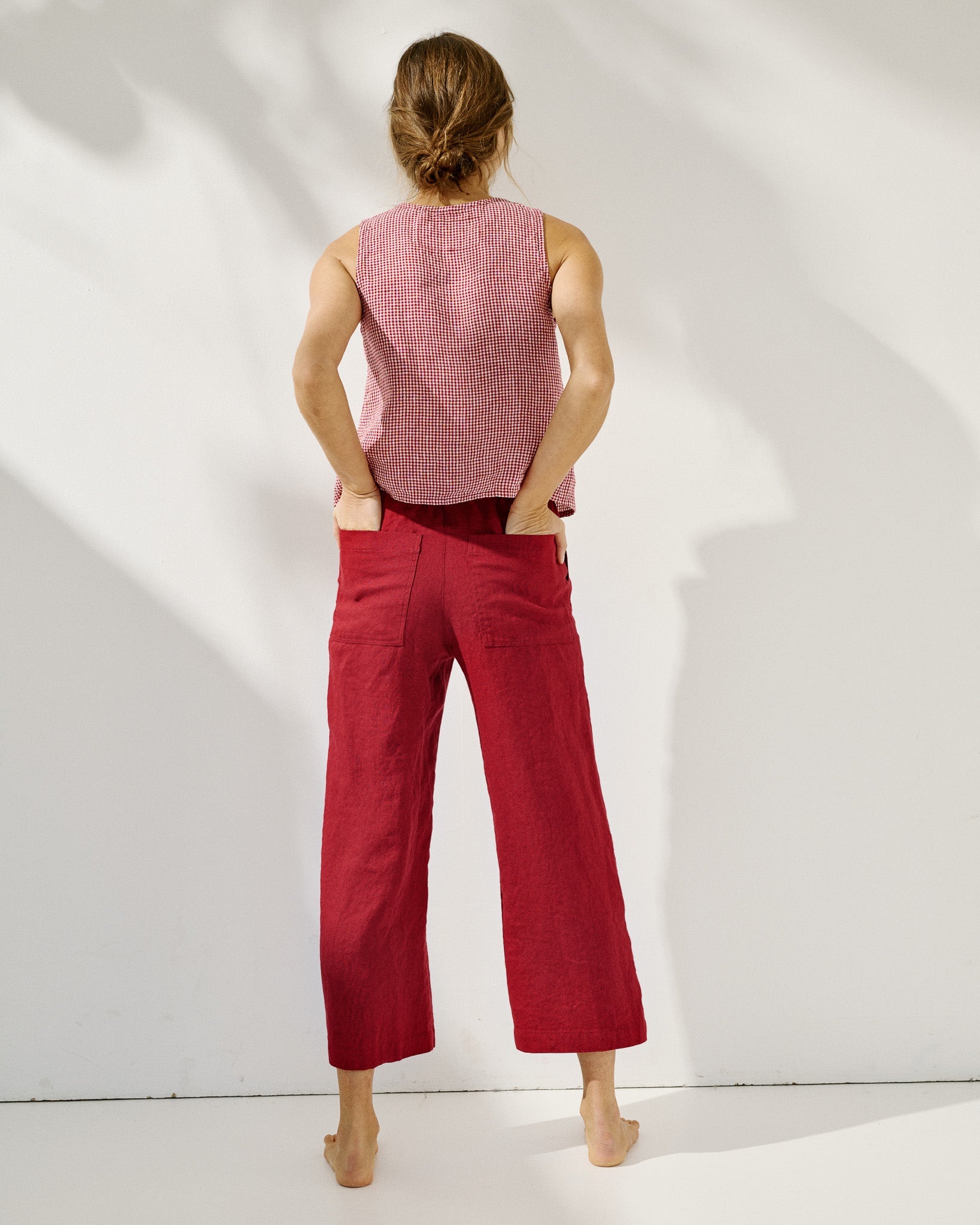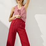 • Model wears a top in light red checks, paired with Puglia pants in medium red wine color.