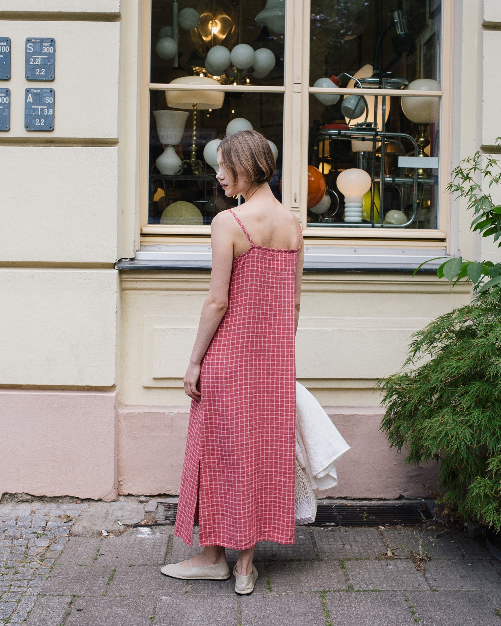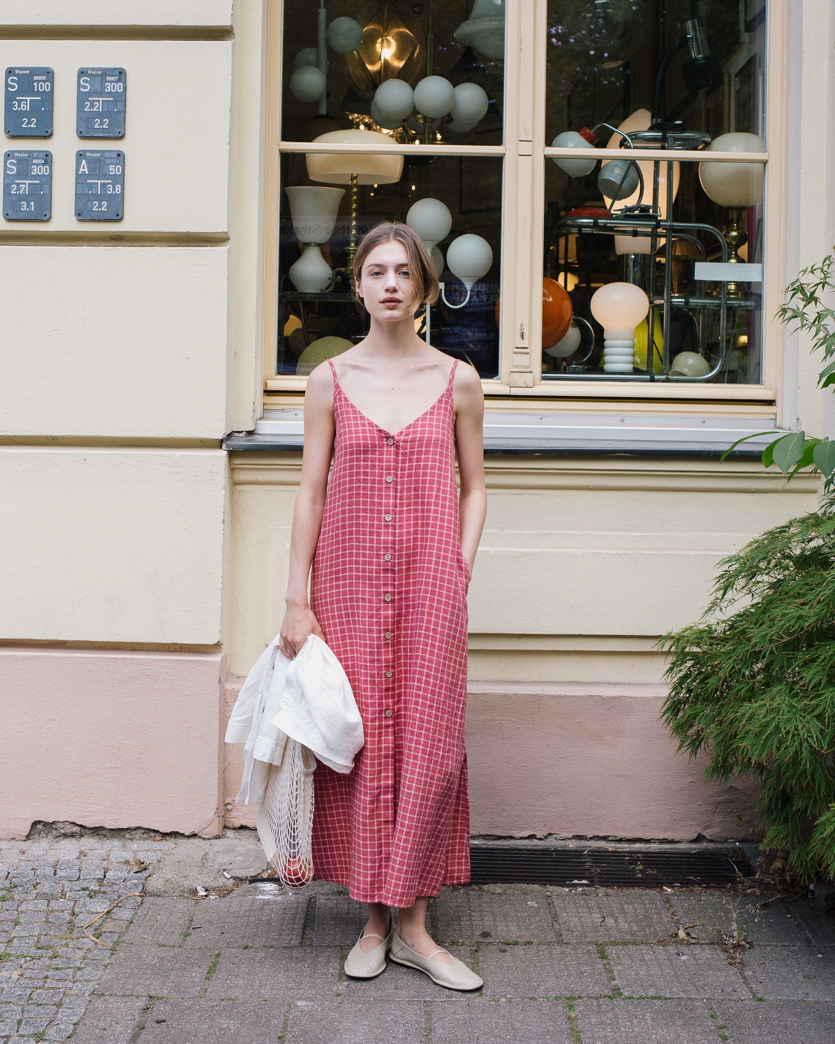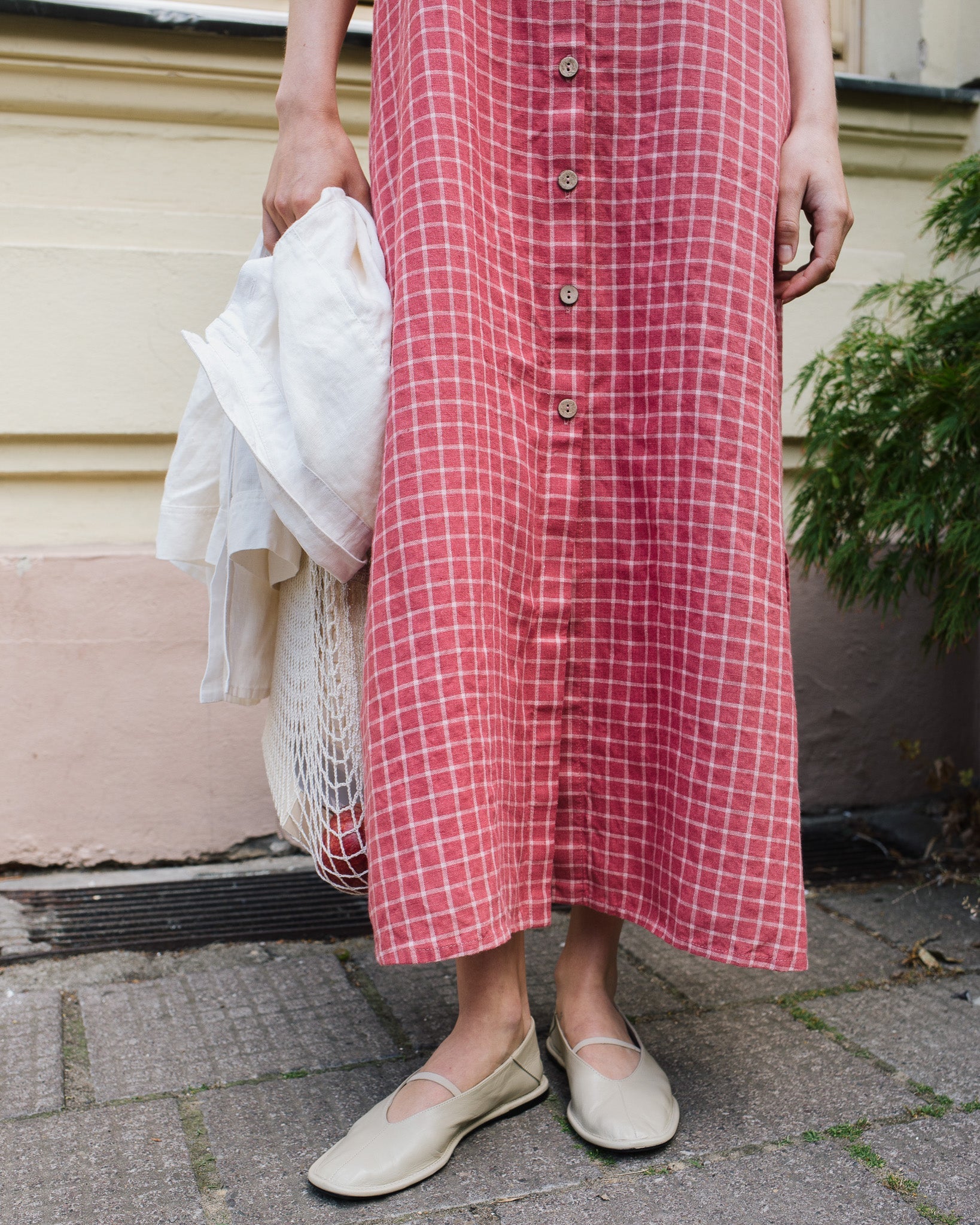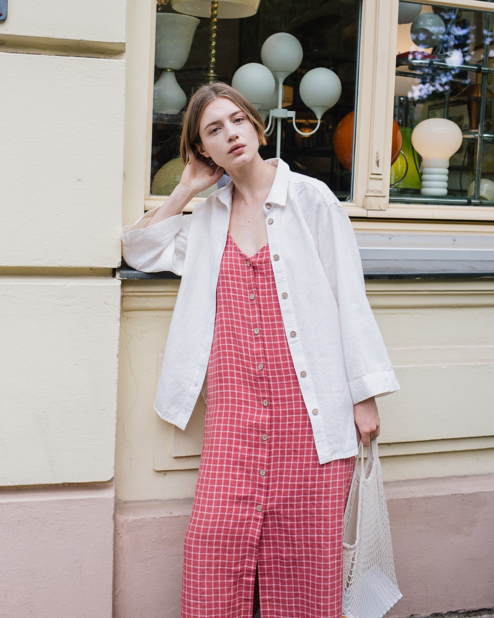 • The model is 5'8" tall (174 cm), size S, and wears a dress in medium weight 'raspberry grid' pattern.