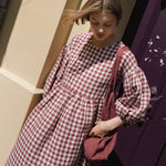 • The model is 5'8" tall (174 cm), size S, and wears a dress in medium weight 'Marsala gingham' pattern.