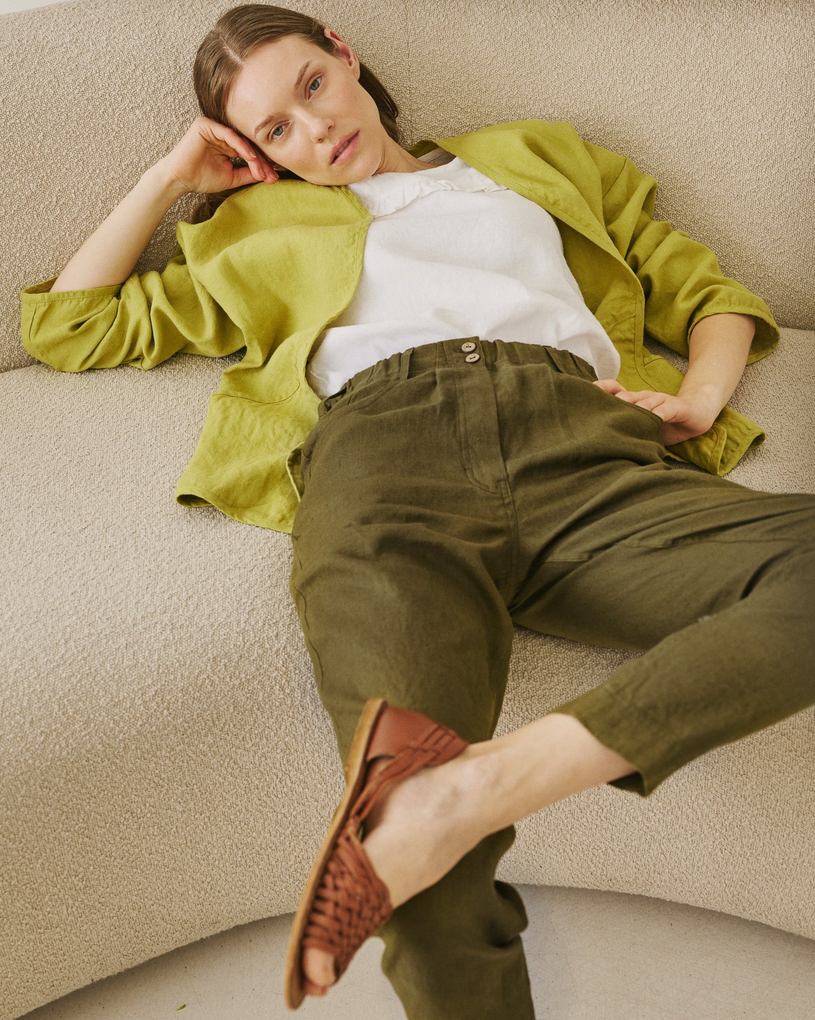 • Buttonless linen jacket designed to be worn as an easy 'throw-on' jacket.