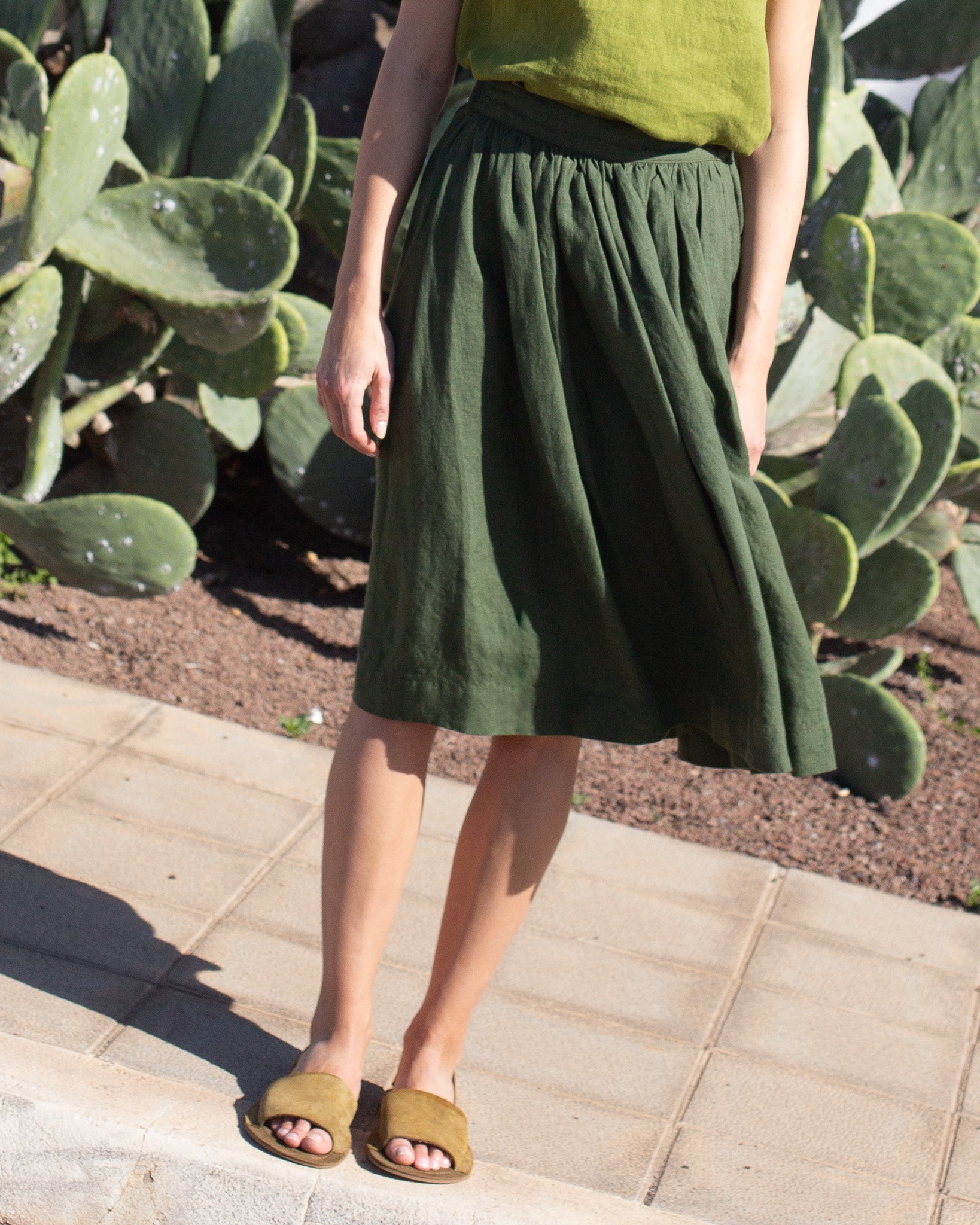 • The model is 5'7" tall (172 cm), size S, and wears a skirt in medium weight 'Olive' color.