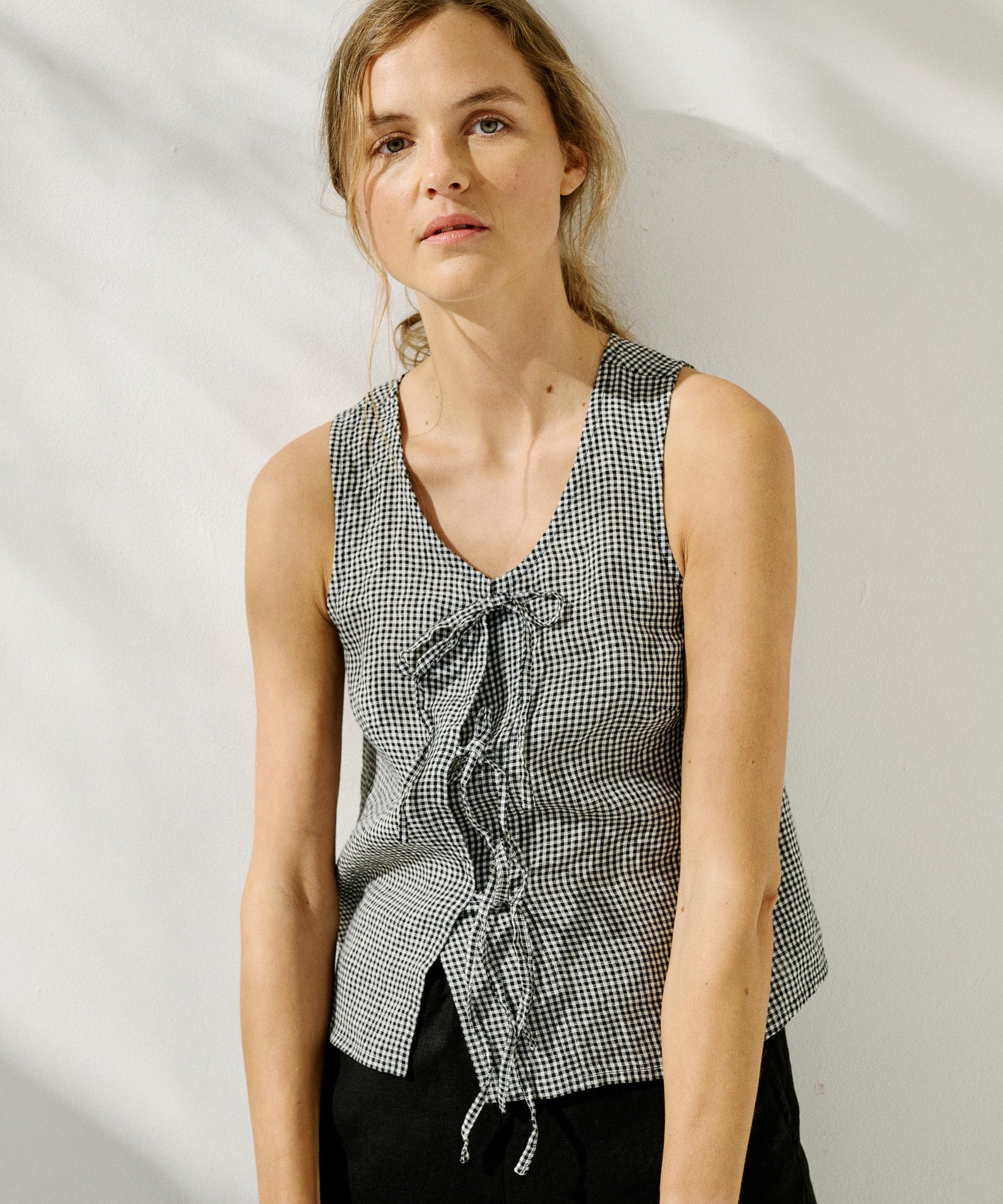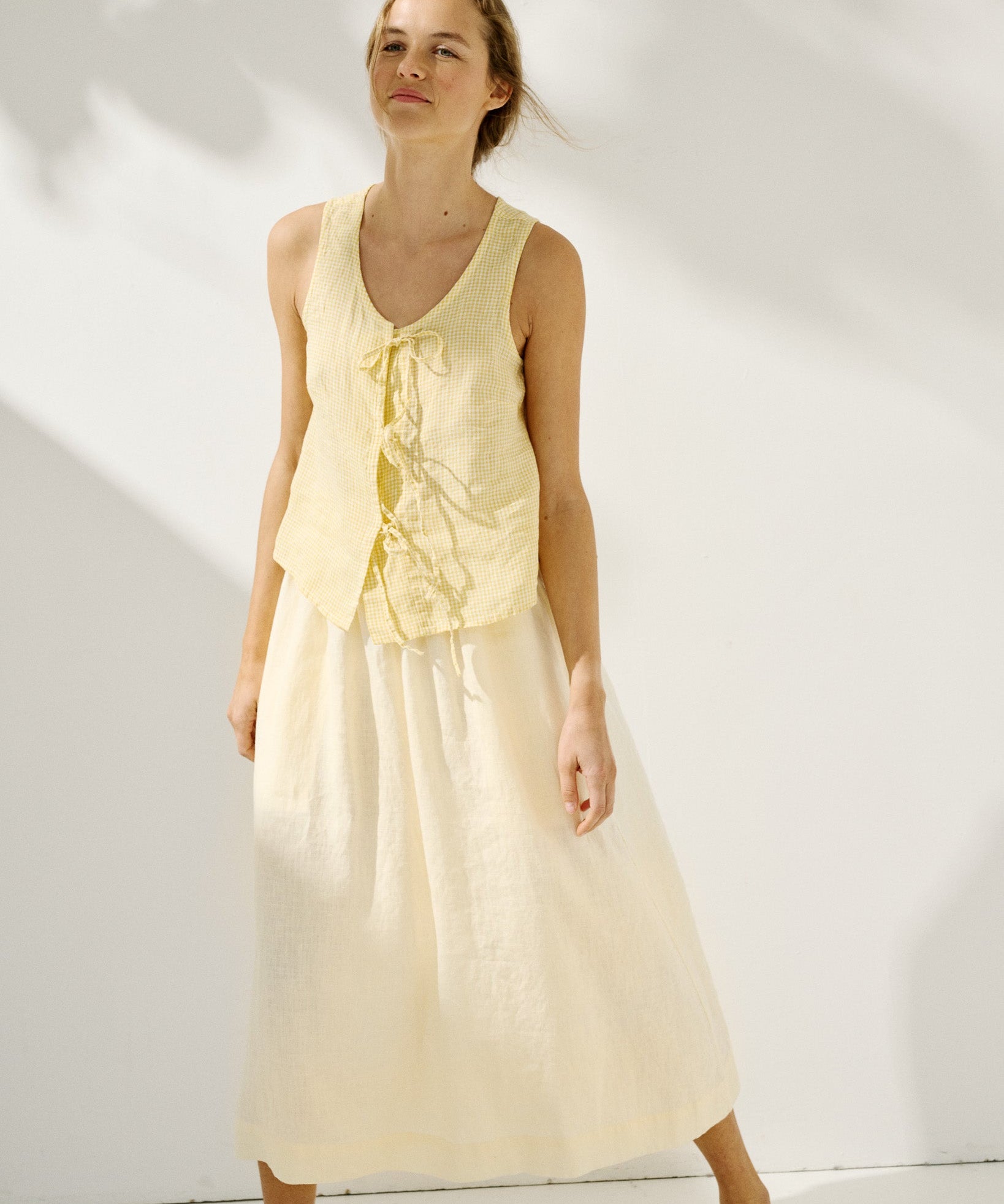 Woman wearing a red and white checkered linen dress with arms raised outdoors.