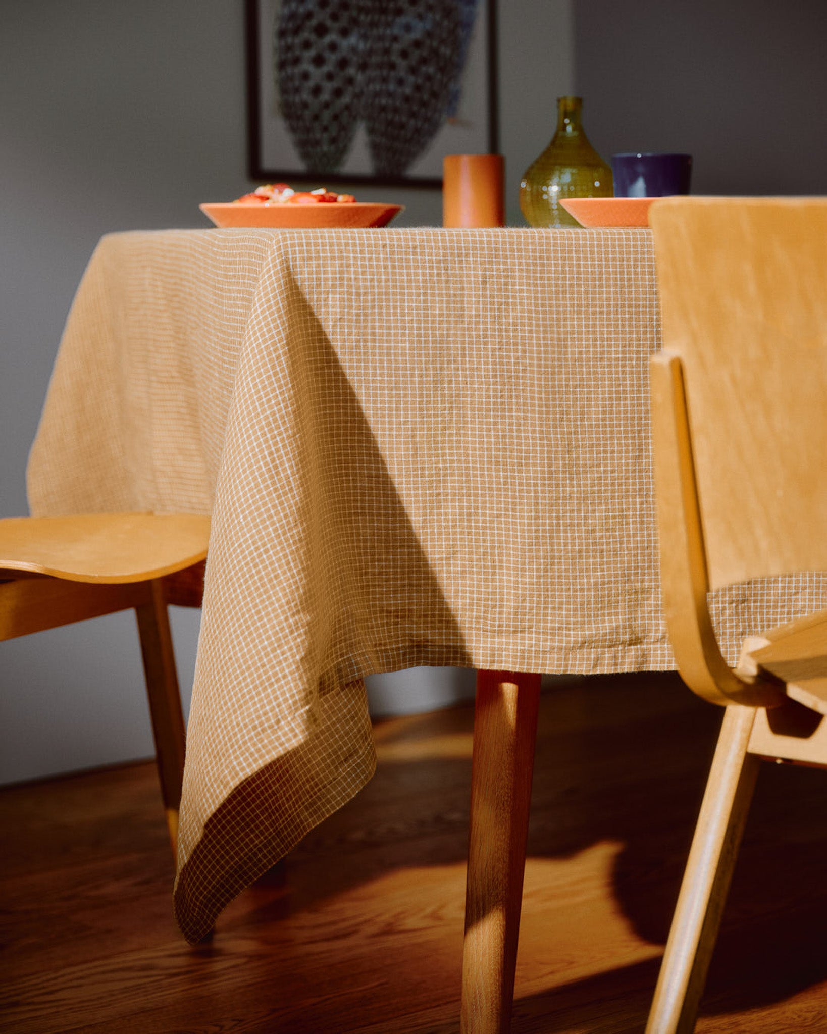 • Pure linen tablecloth, hand-cut, sewn, and pre-washed with precision.