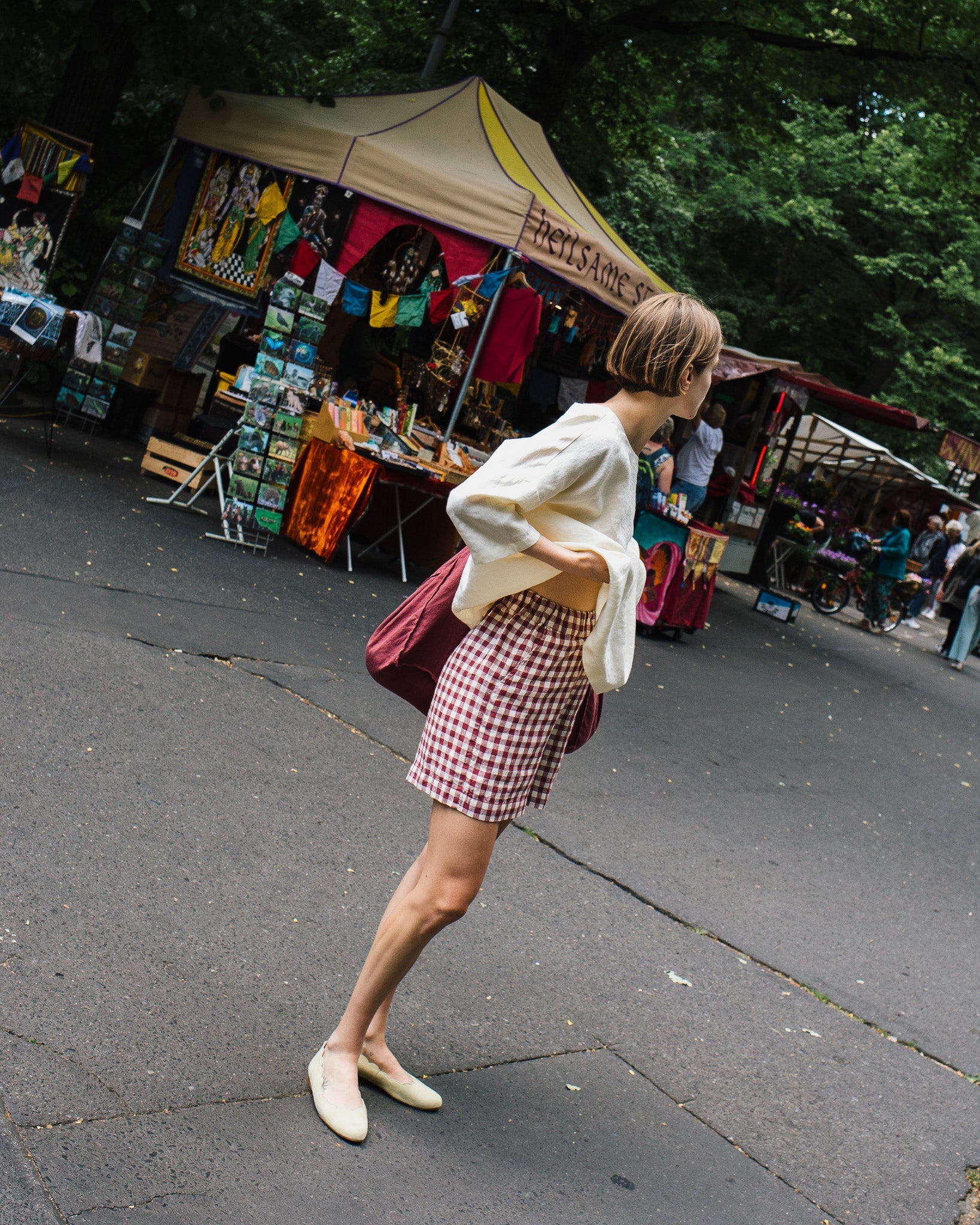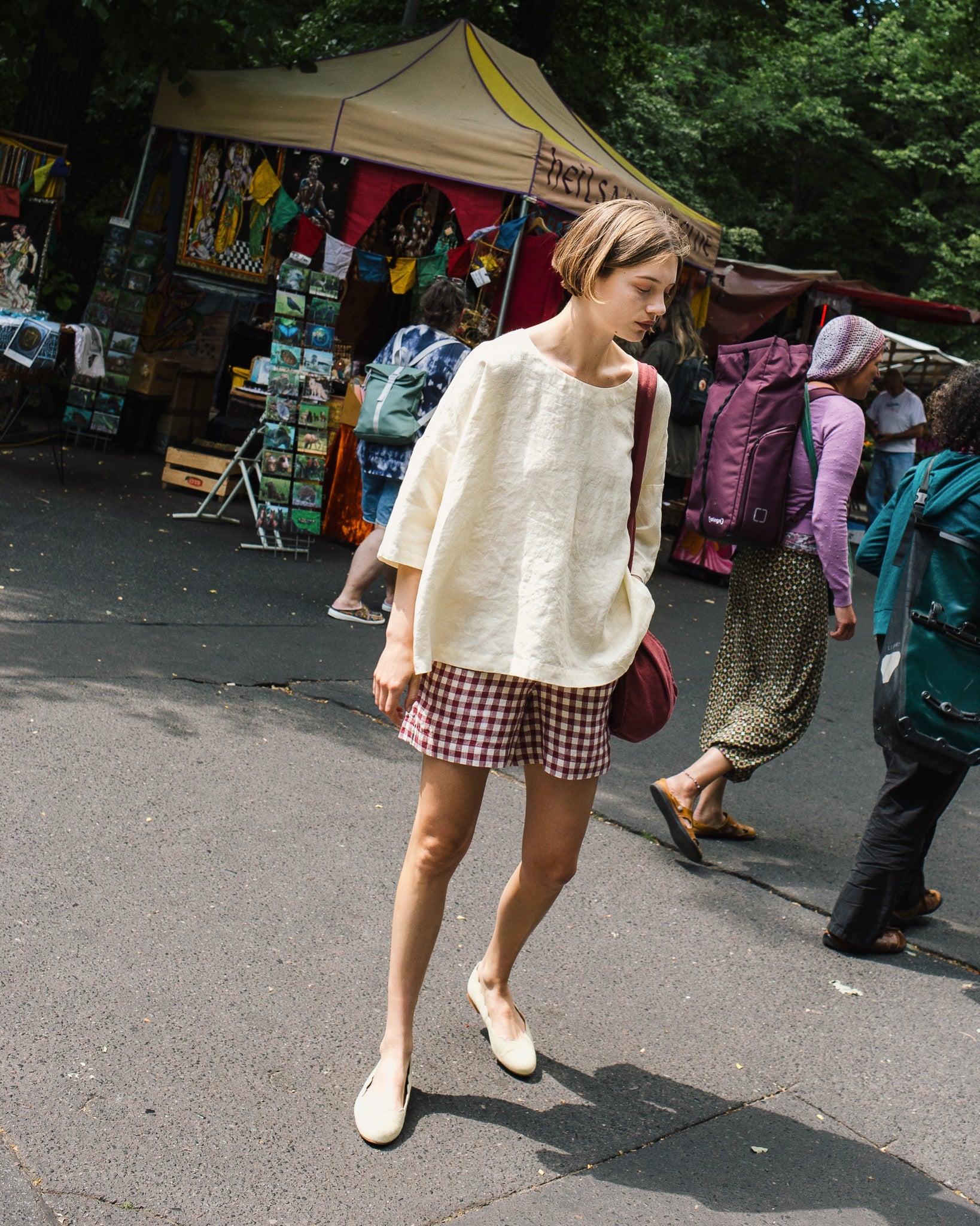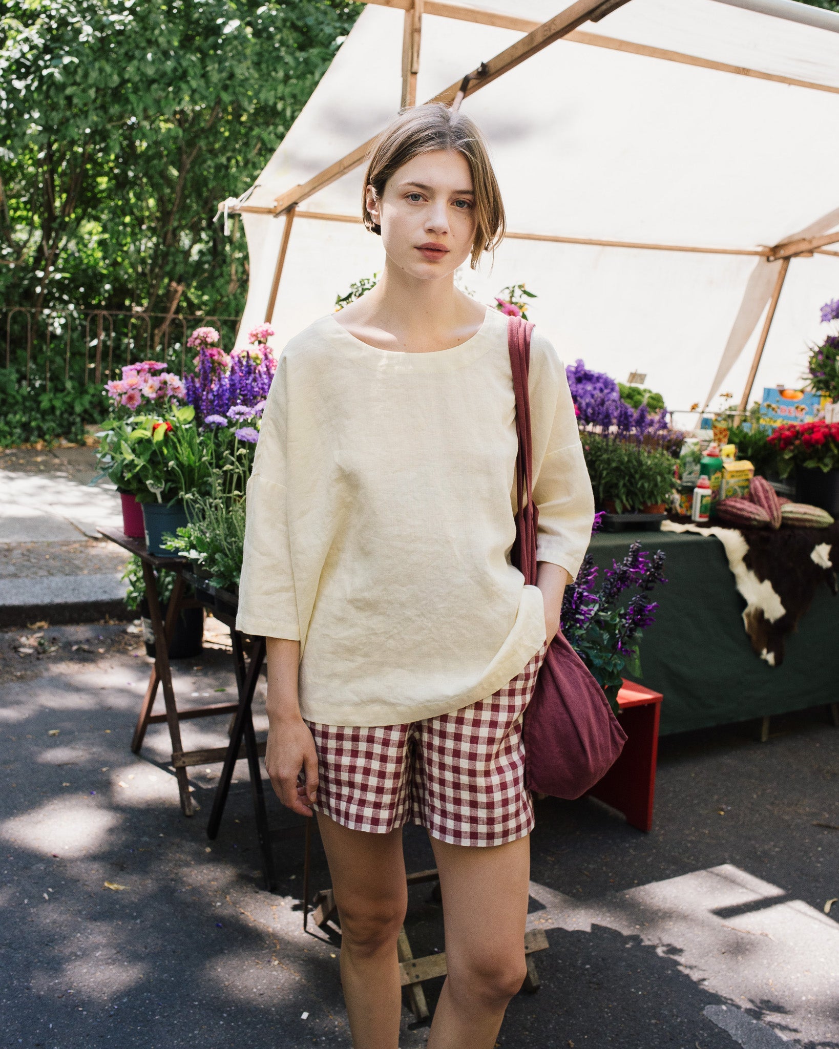 • The model is 5'8" tall (174 cm), size S, and wears shorts in medium weight 'Marsala gingham' color.