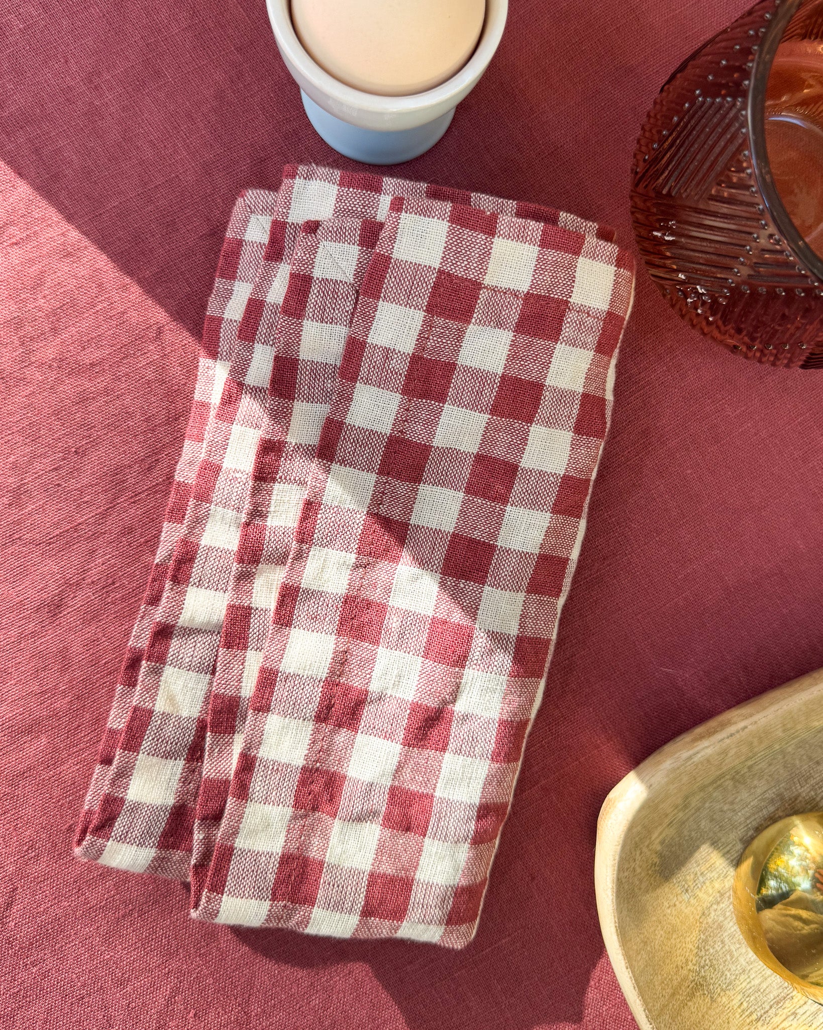 • The colors of the linen tablecloths listed as follows - marsala, marsala gingham, amber checks, olive, indigo and cream.