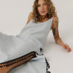 The linen dress is designed for joy and freedom of movement, with side splits trimmed in delicate hand-crocheted “poppy seeds” — a detail that takes over 9 hours (that’s more than a full workday) for an artisan to complete. Wear it on its own or paired with the crocheted outer layer for the full Aguonos look.