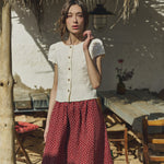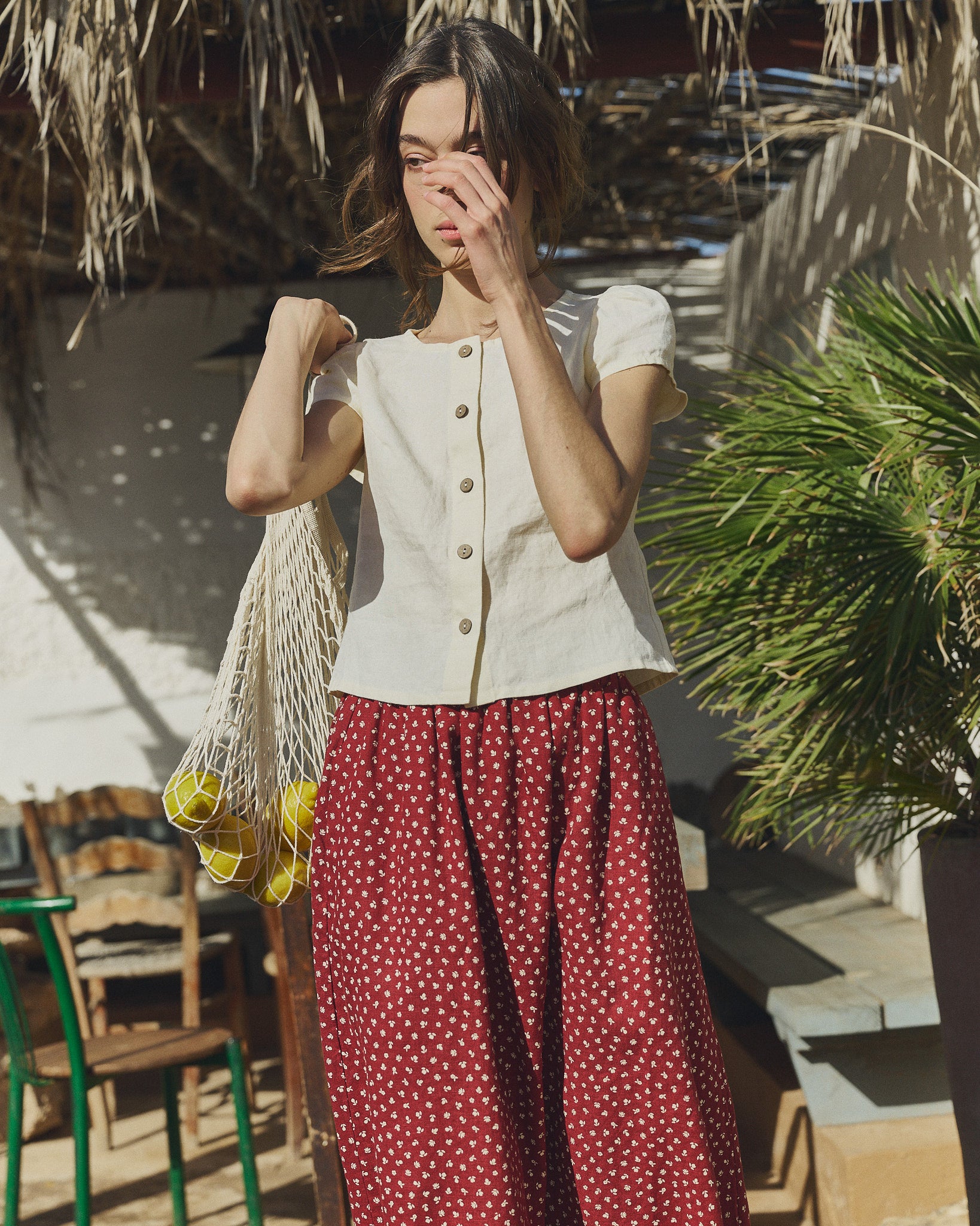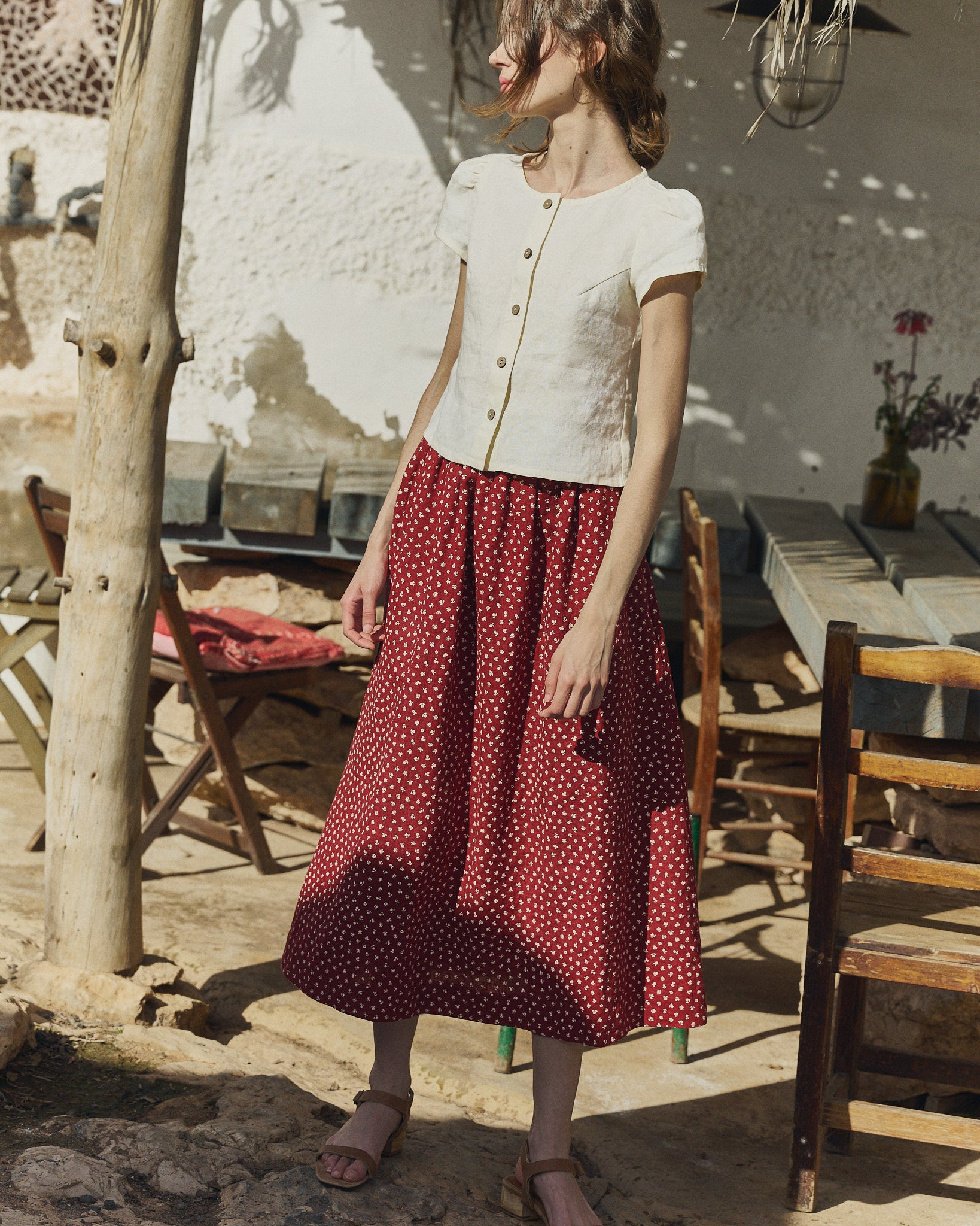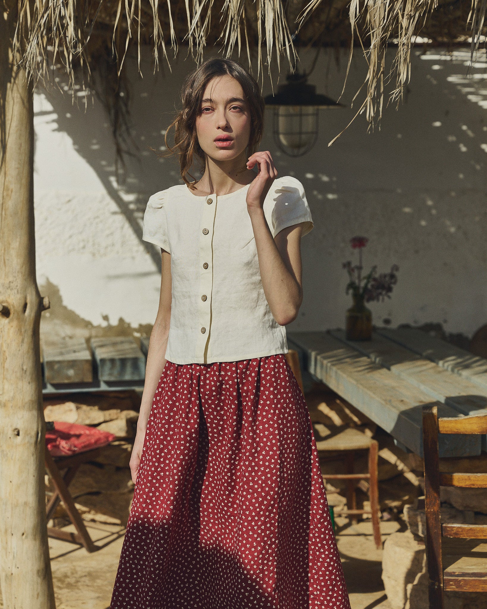 • Model wears XS in cream, paired with a Sion skirt in ruby red florals.