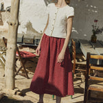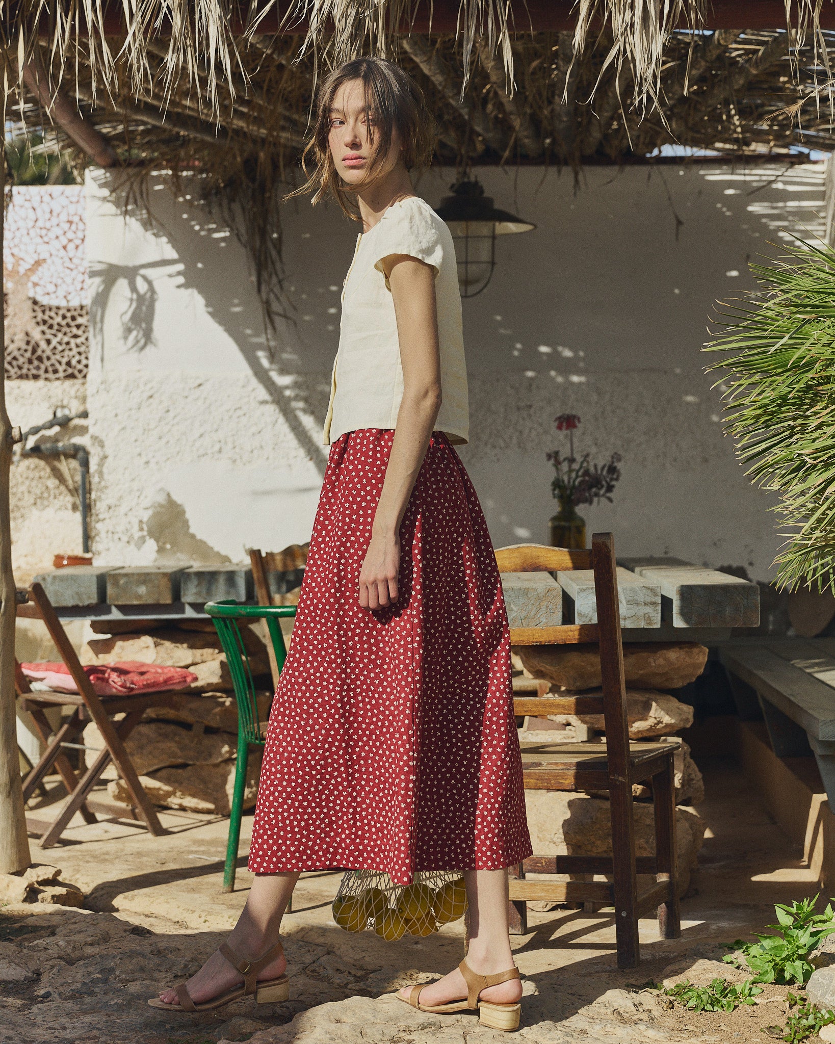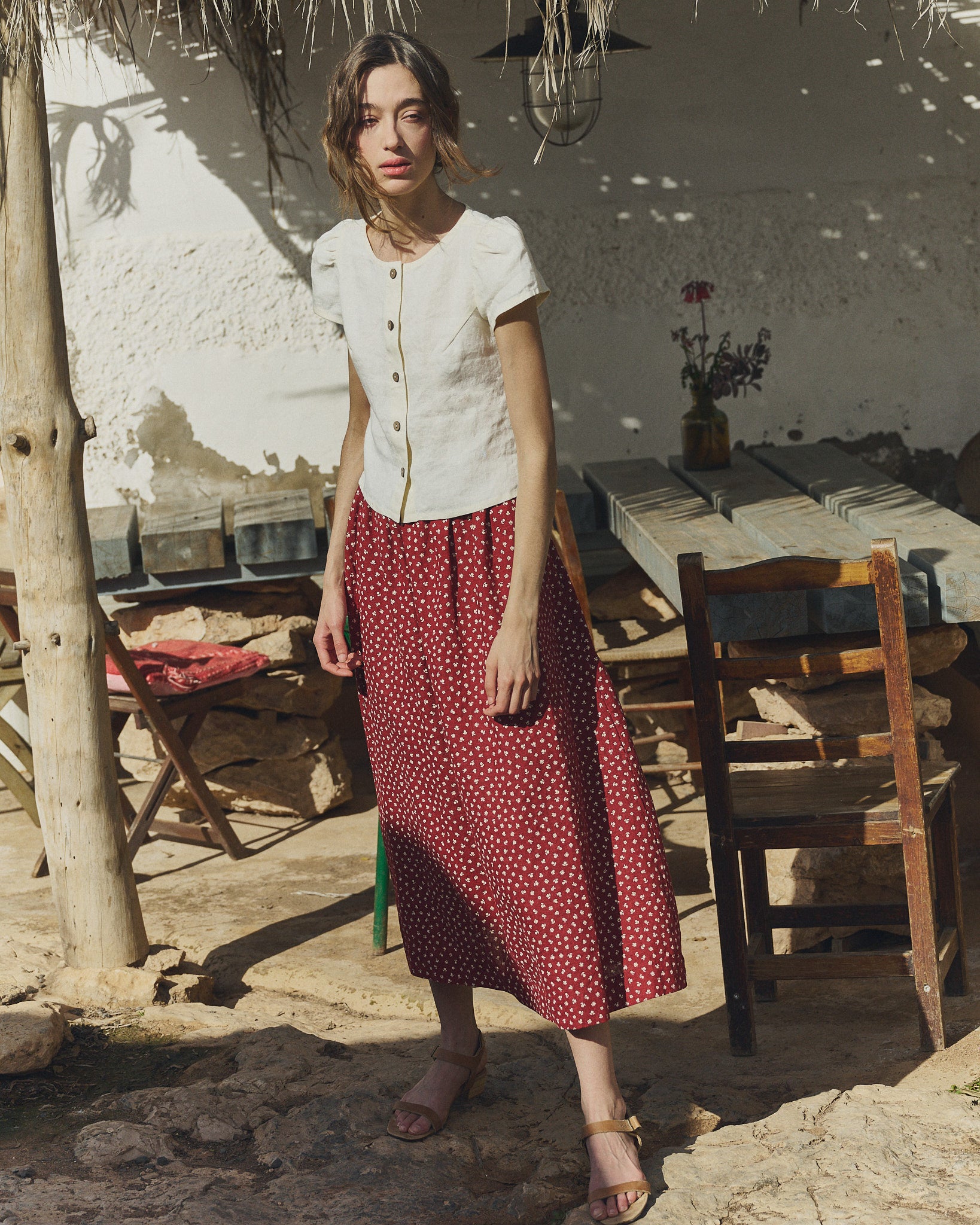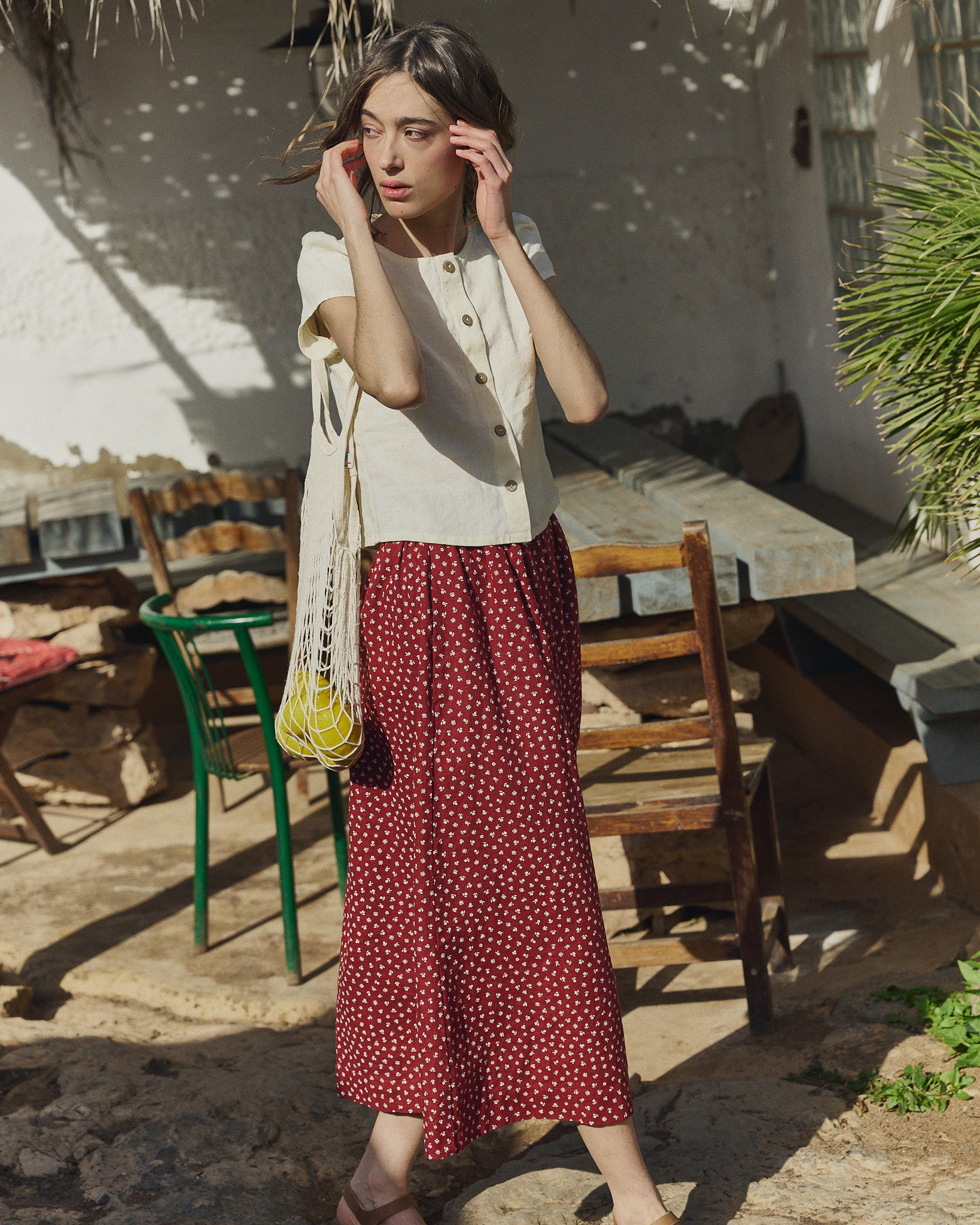 • Model wears XS in cream, paired with a Sion skirt in ruby red florals.