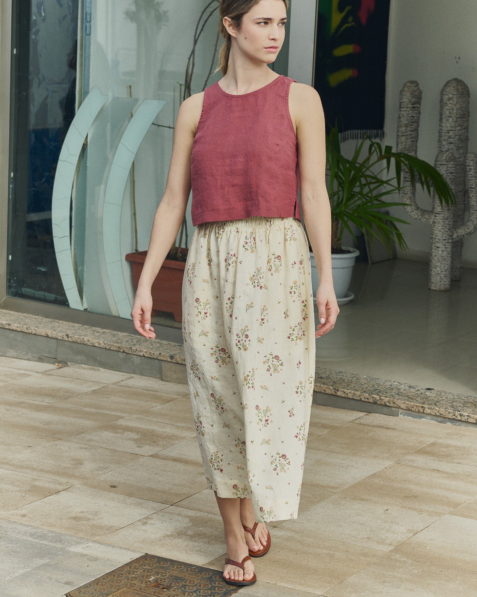 • Simple sleeveless linen crop top with a high, rounded neckline.