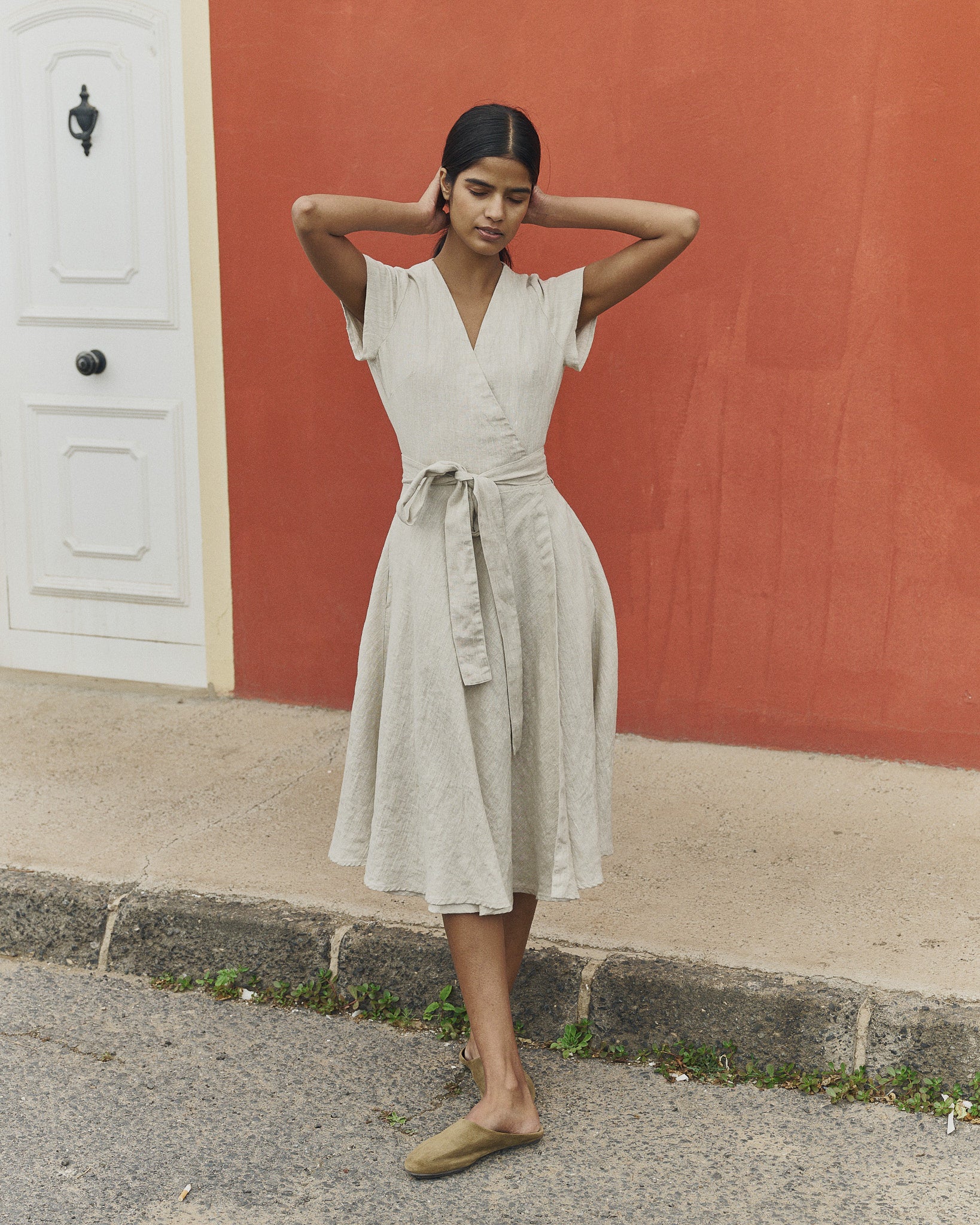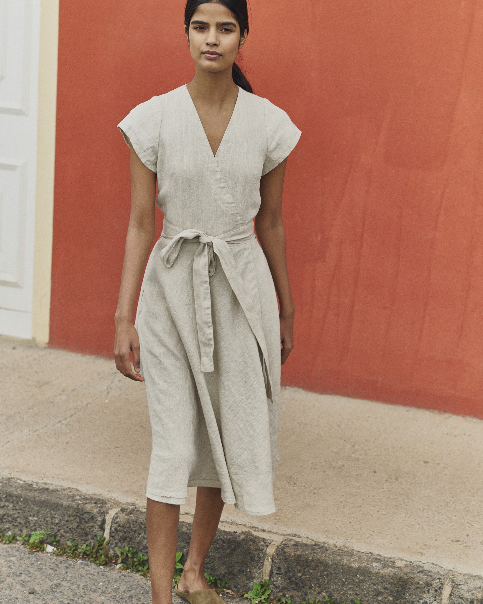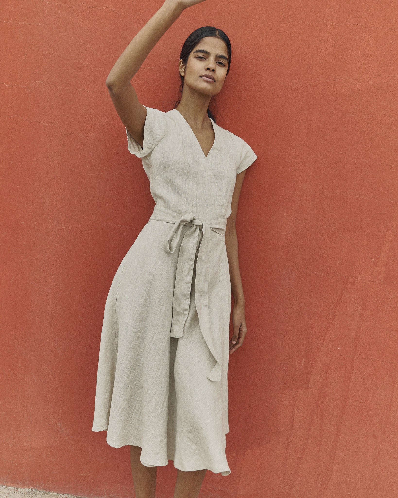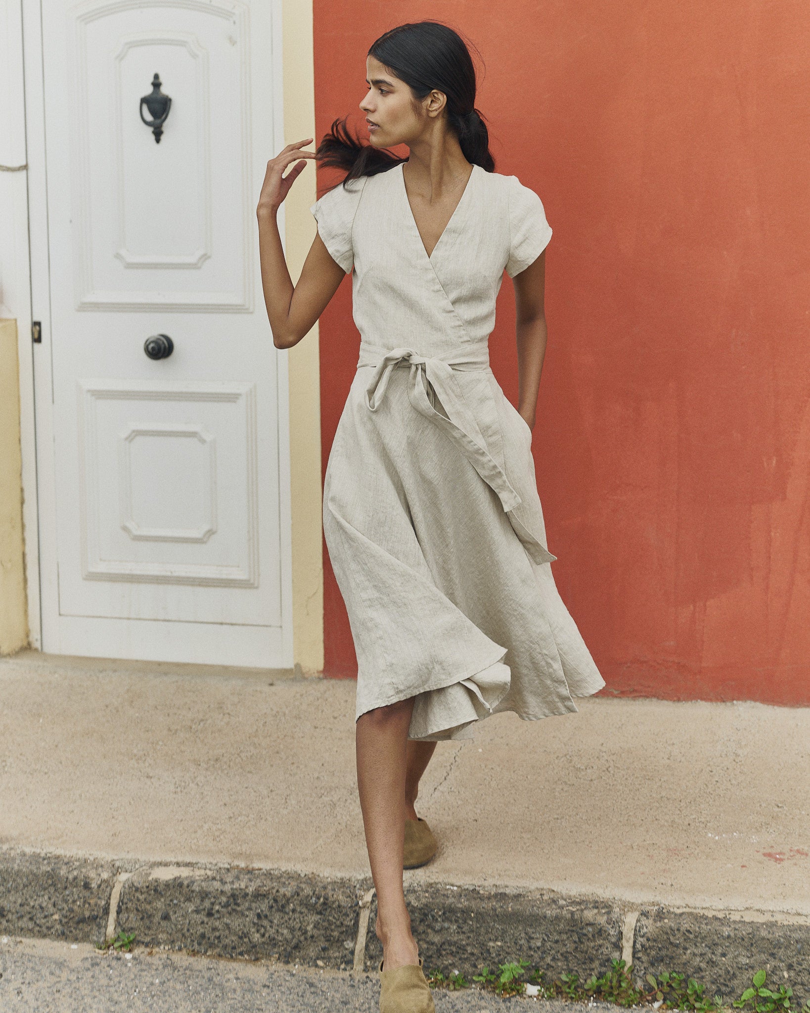 The CANNES-2 wrap linen dress is praised for its perfect fit and versatile design, though sizing feedback varies. It features a subtle v-neckline, cap sleeves, and an elastic waistband with a wraparound tie, making it comfortable and functional. The A-line skirt and pockets add to its appeal, and it is designed to be breastfeeding friendly.
