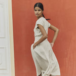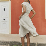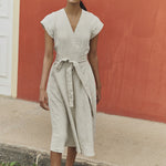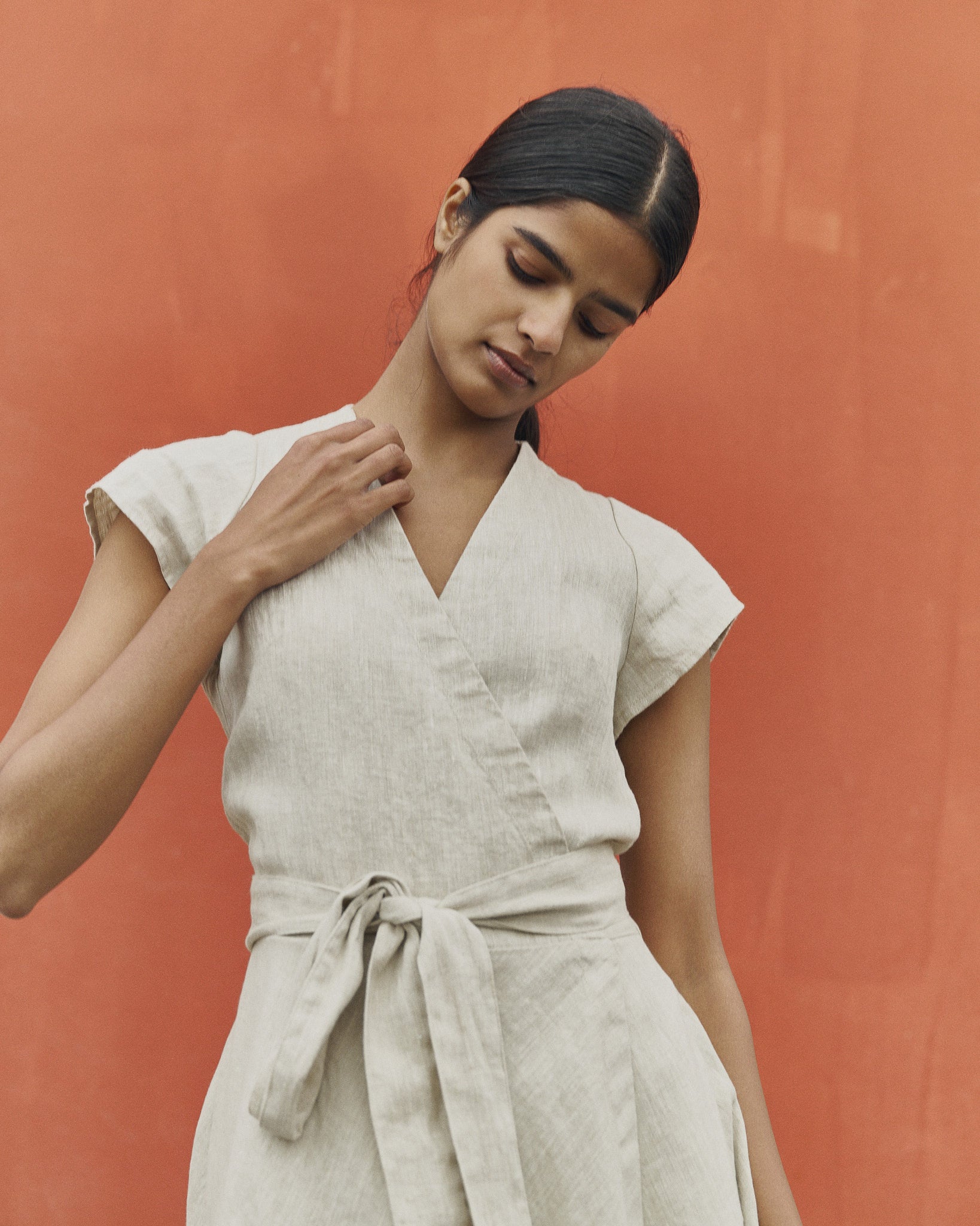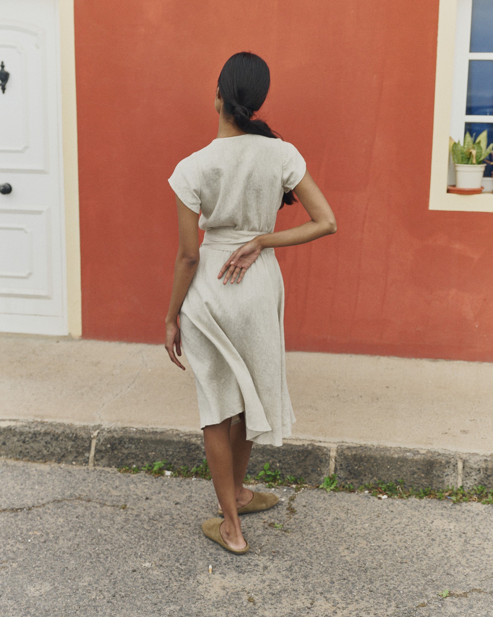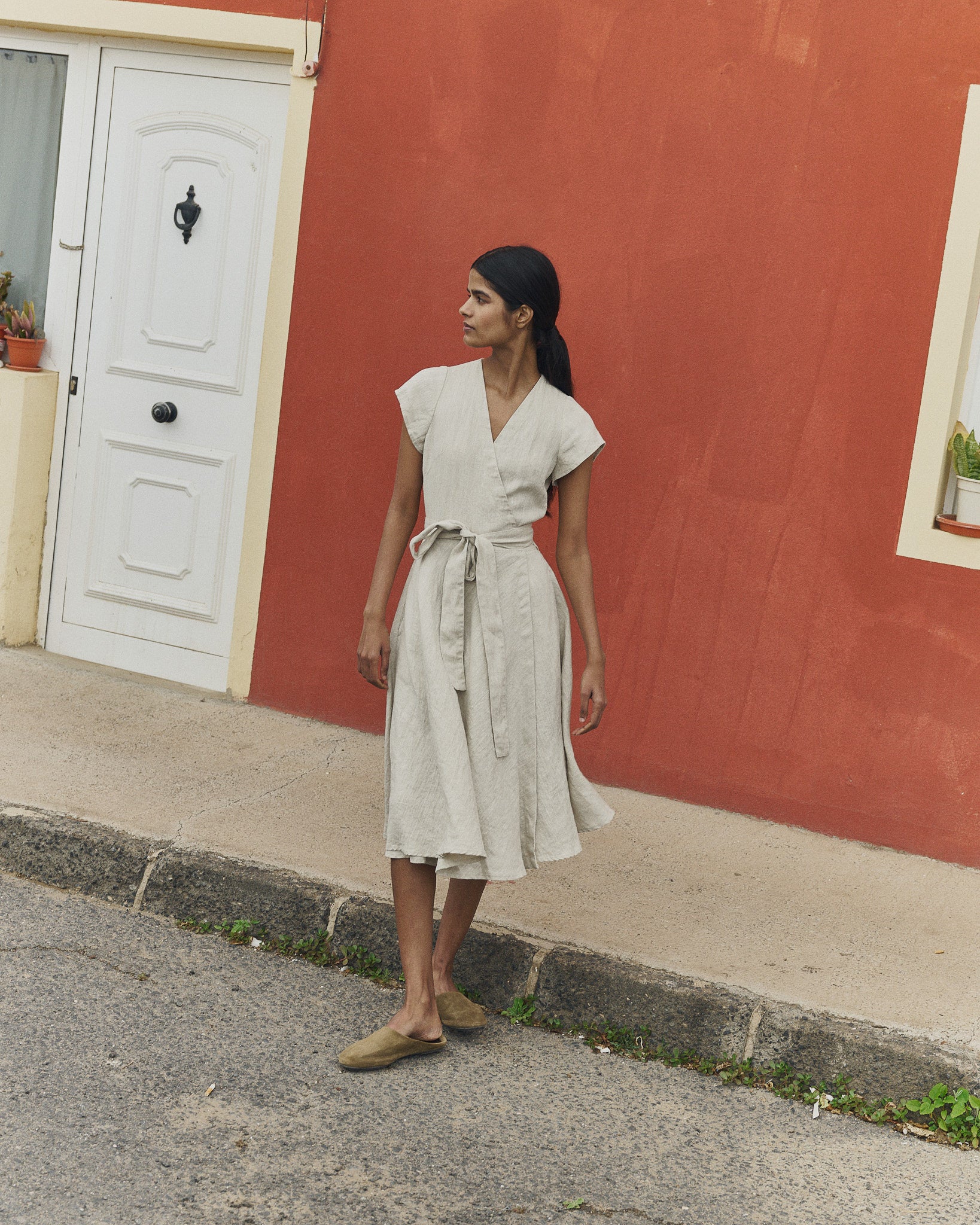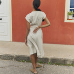 The CANNES-2 wrap linen dress is praised for its perfect fit and versatile design, though sizing feedback varies. It features a subtle v-neckline, cap sleeves, and an elastic waistband with a wraparound tie, making it comfortable and functional. The A-line skirt and pockets add to its appeal, and it is designed to be breastfeeding friendly.