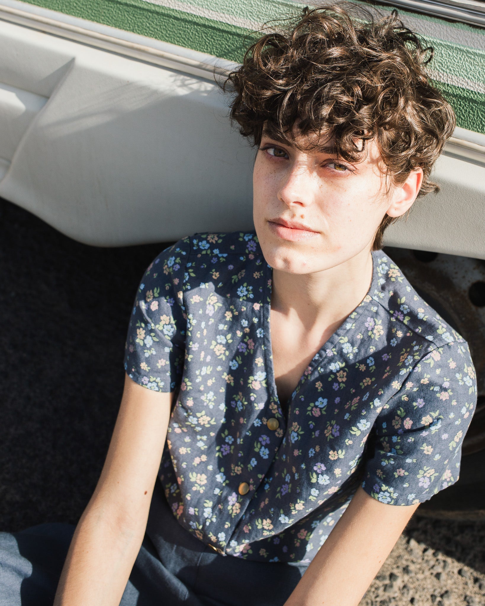 • The model is 5'10" tall (177 cm), size S, and wears a shirt in medium weight weight 'Dusky florals' pattern.