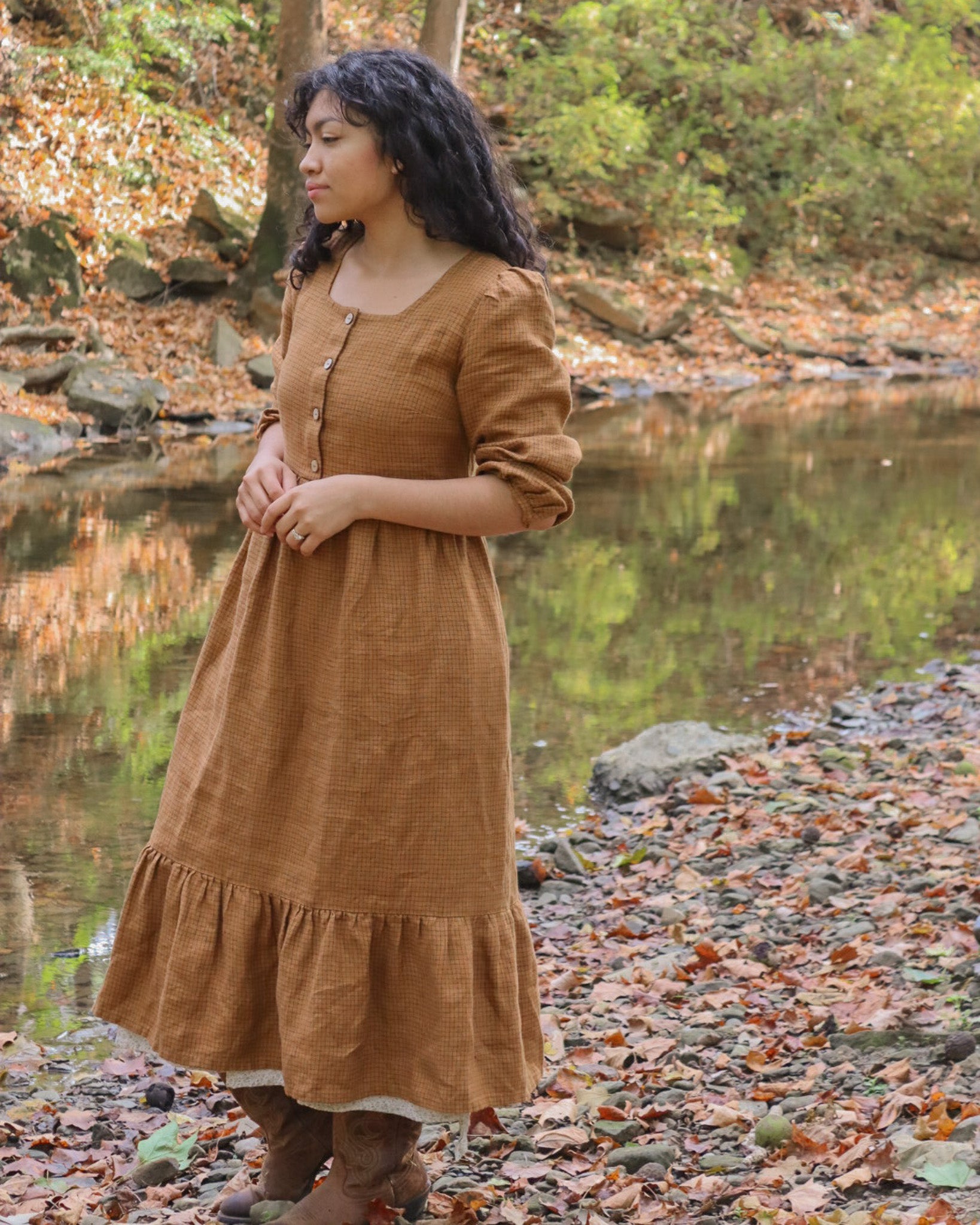 • Jezelle is 5'1 (155 cm) and wears a dress in 'ginger checks'.