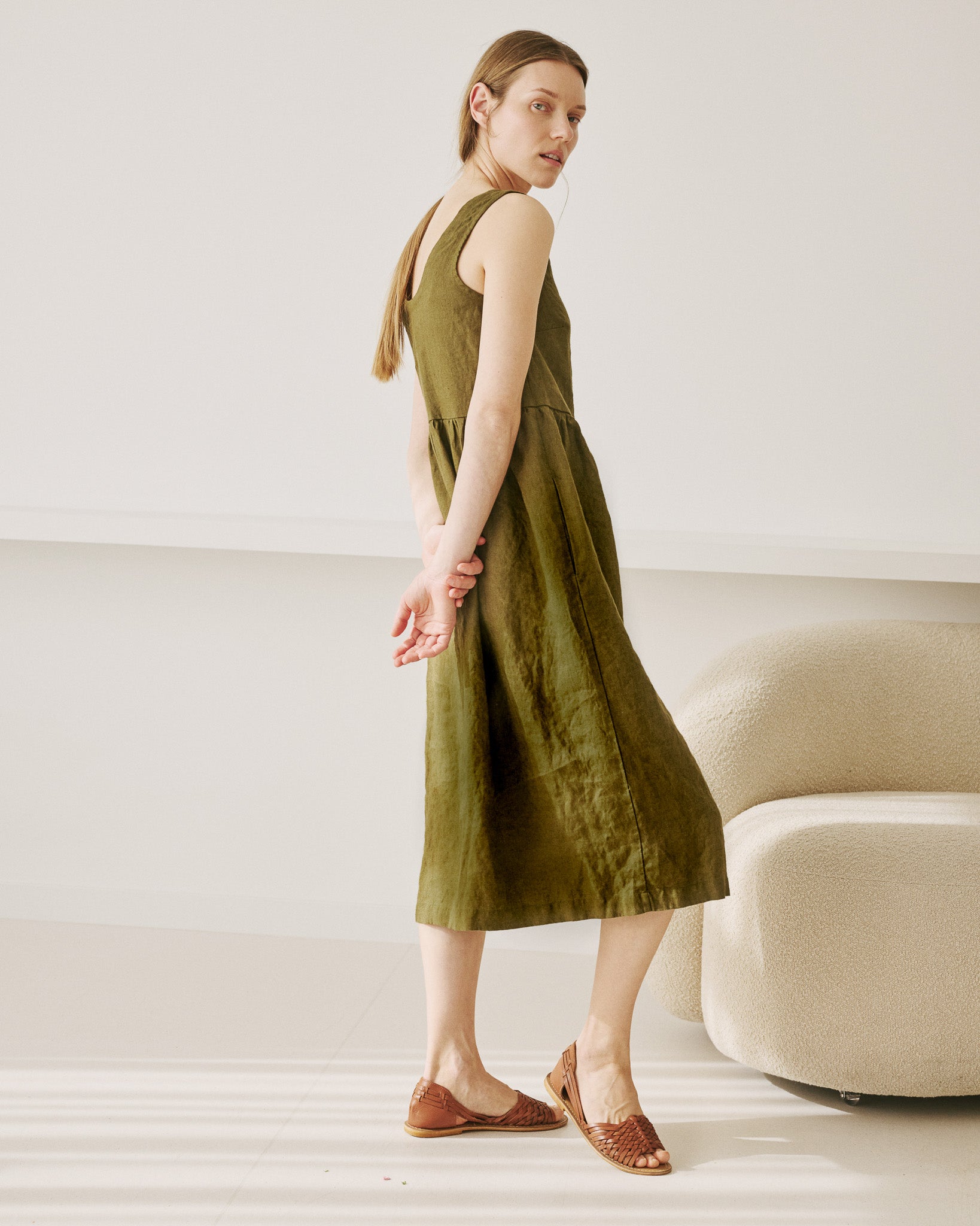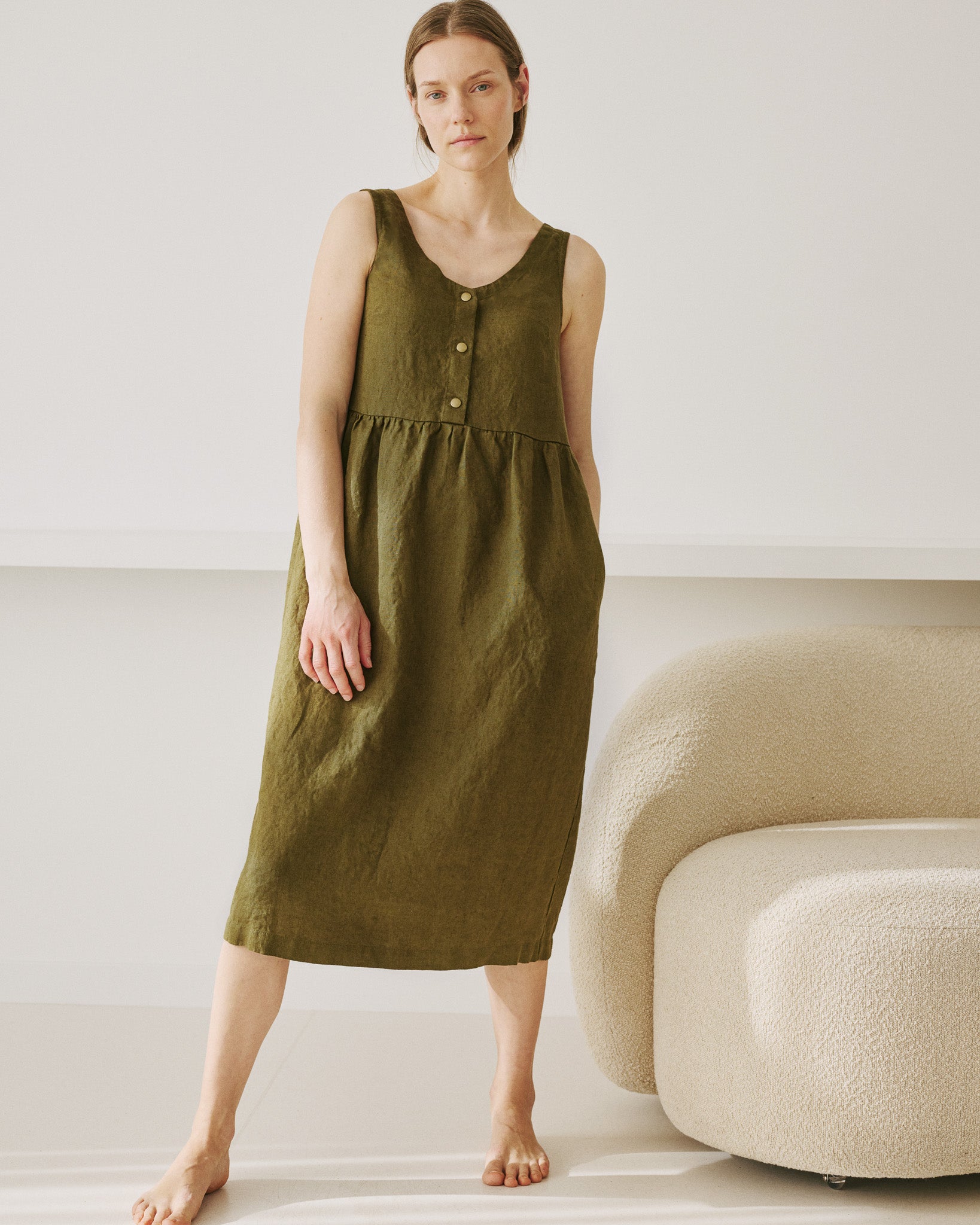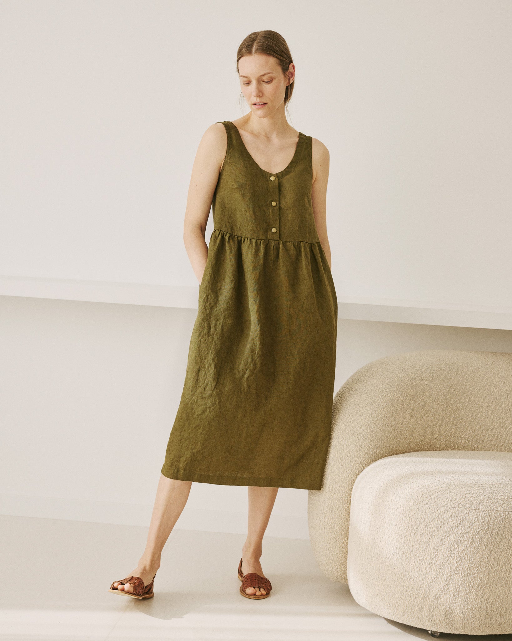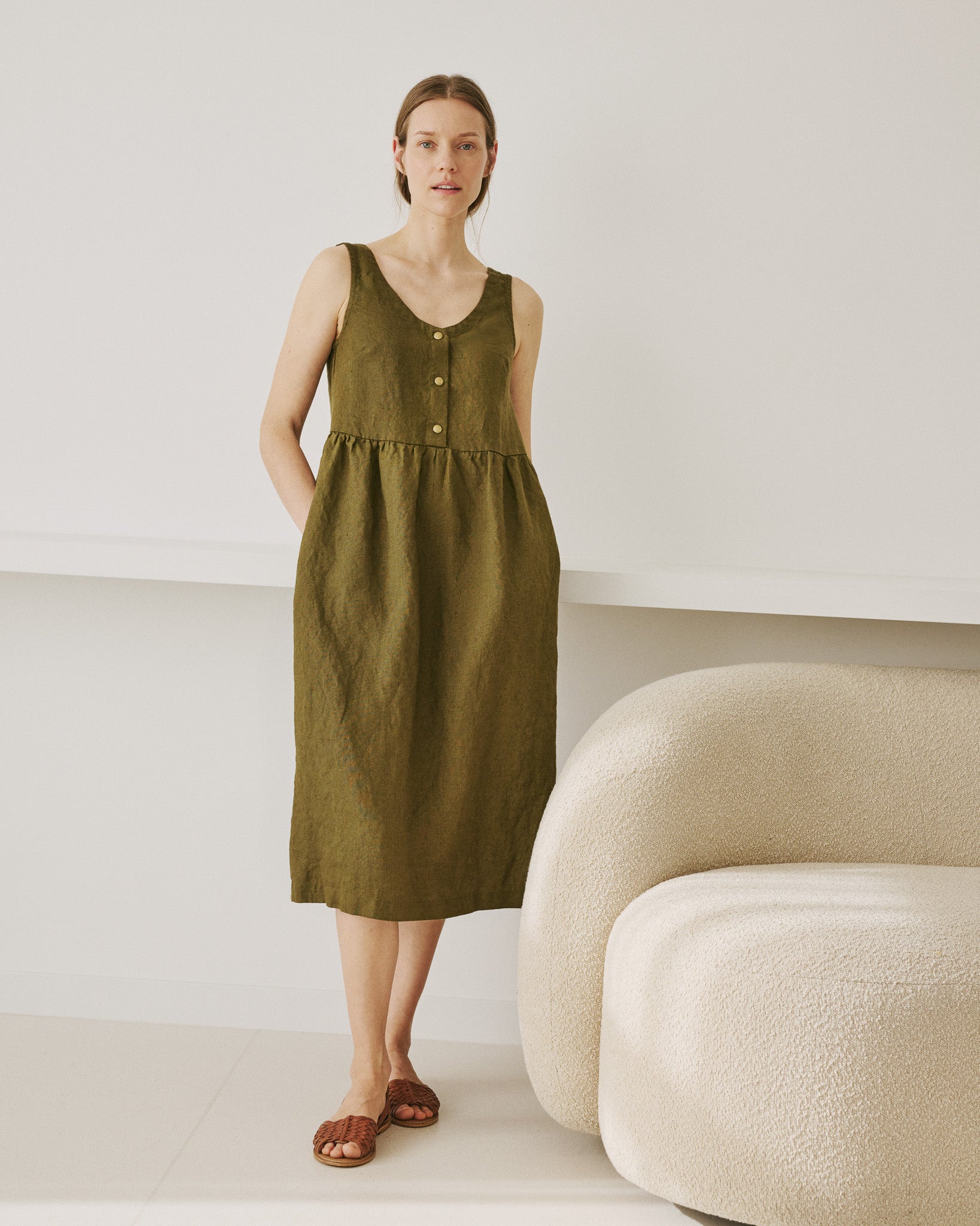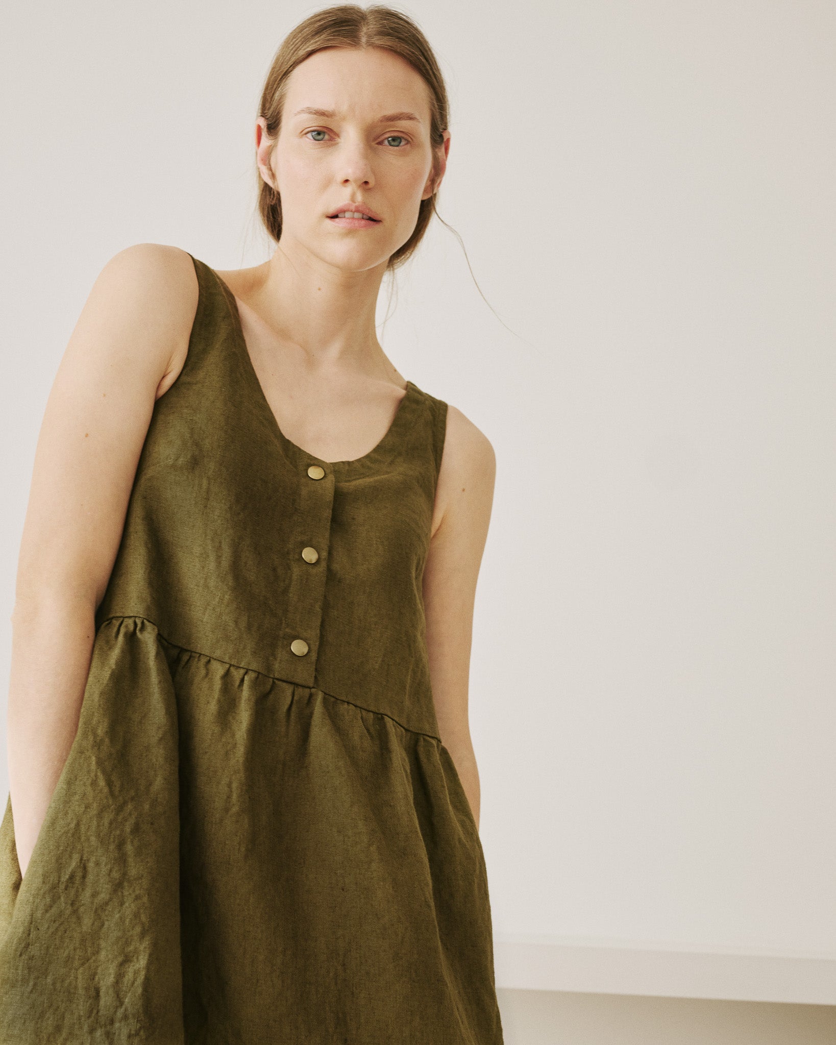 • Washed, soft, easy shape sleeveless linen dress with a softly gathered skirt and pockets set into side-seam at both hips.