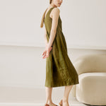 • Model wears a dress in loden green.