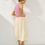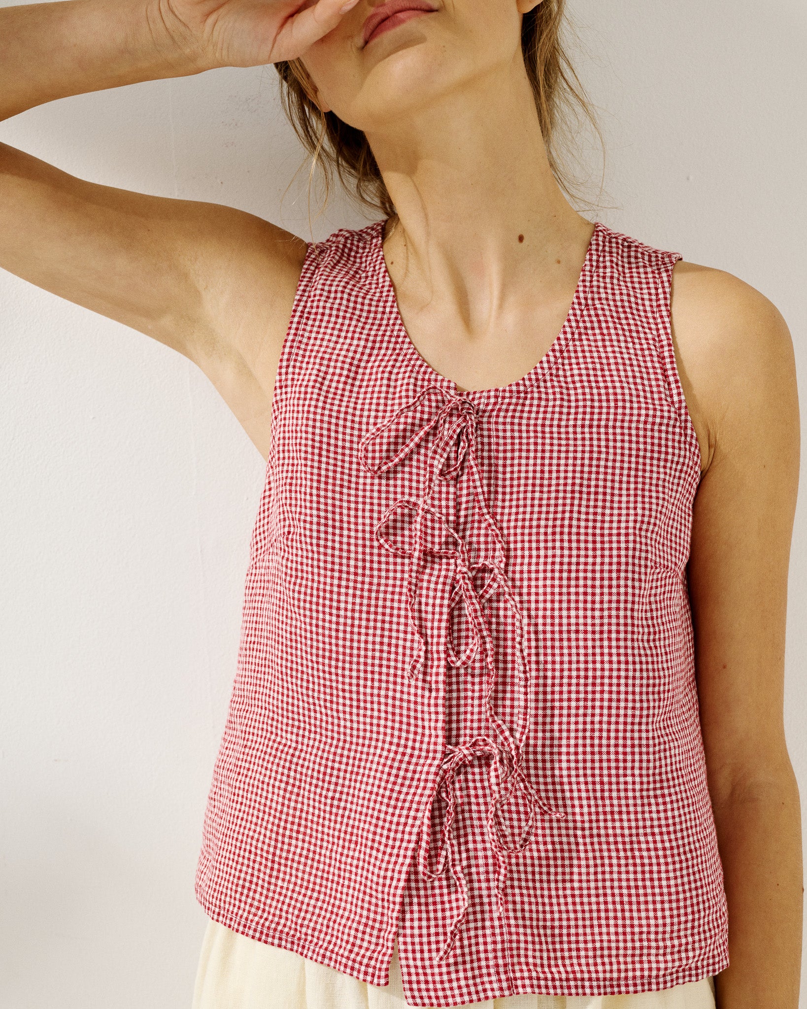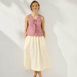 • Model wears a top in light red checks, paired with Sion skirt in medium weight light butter.