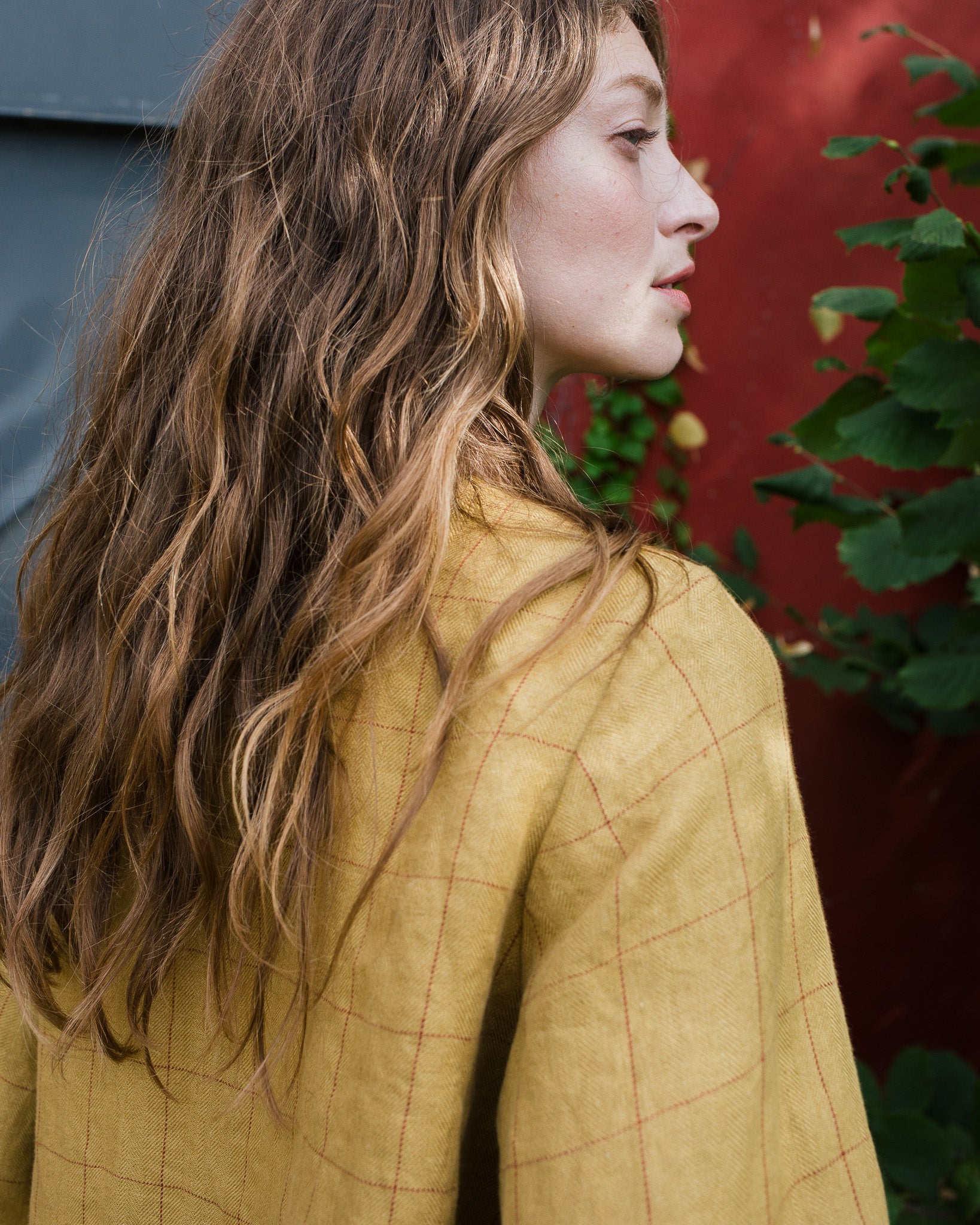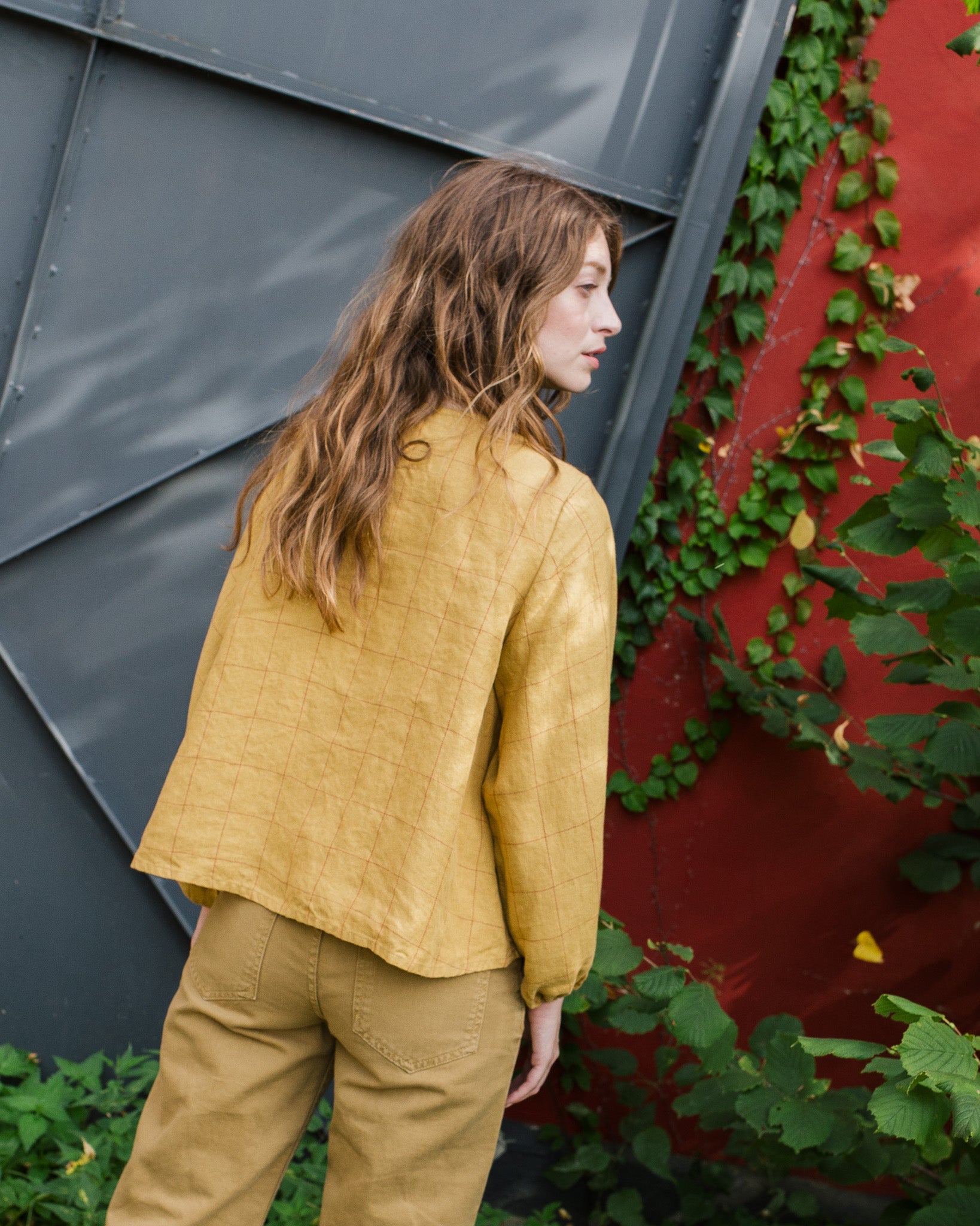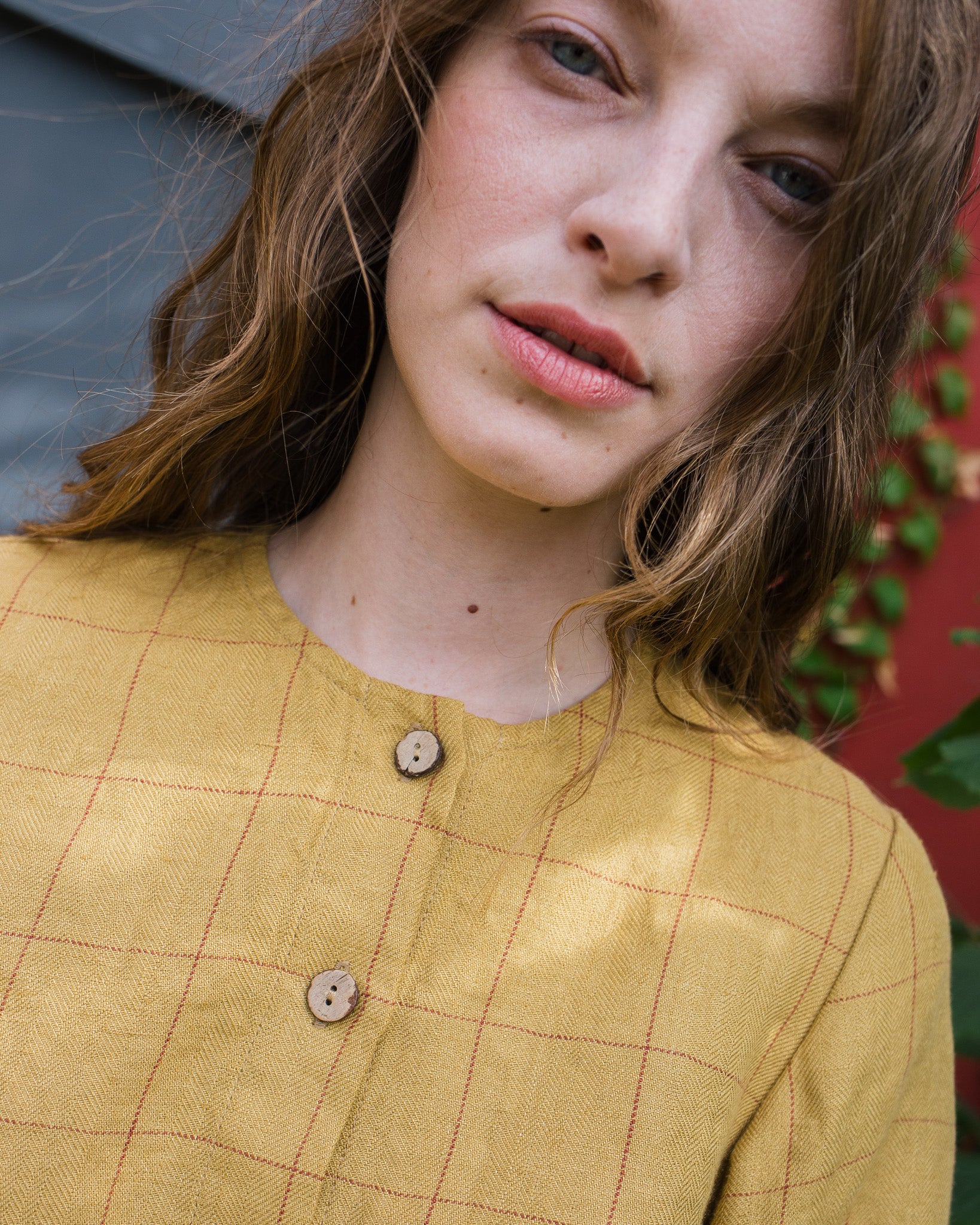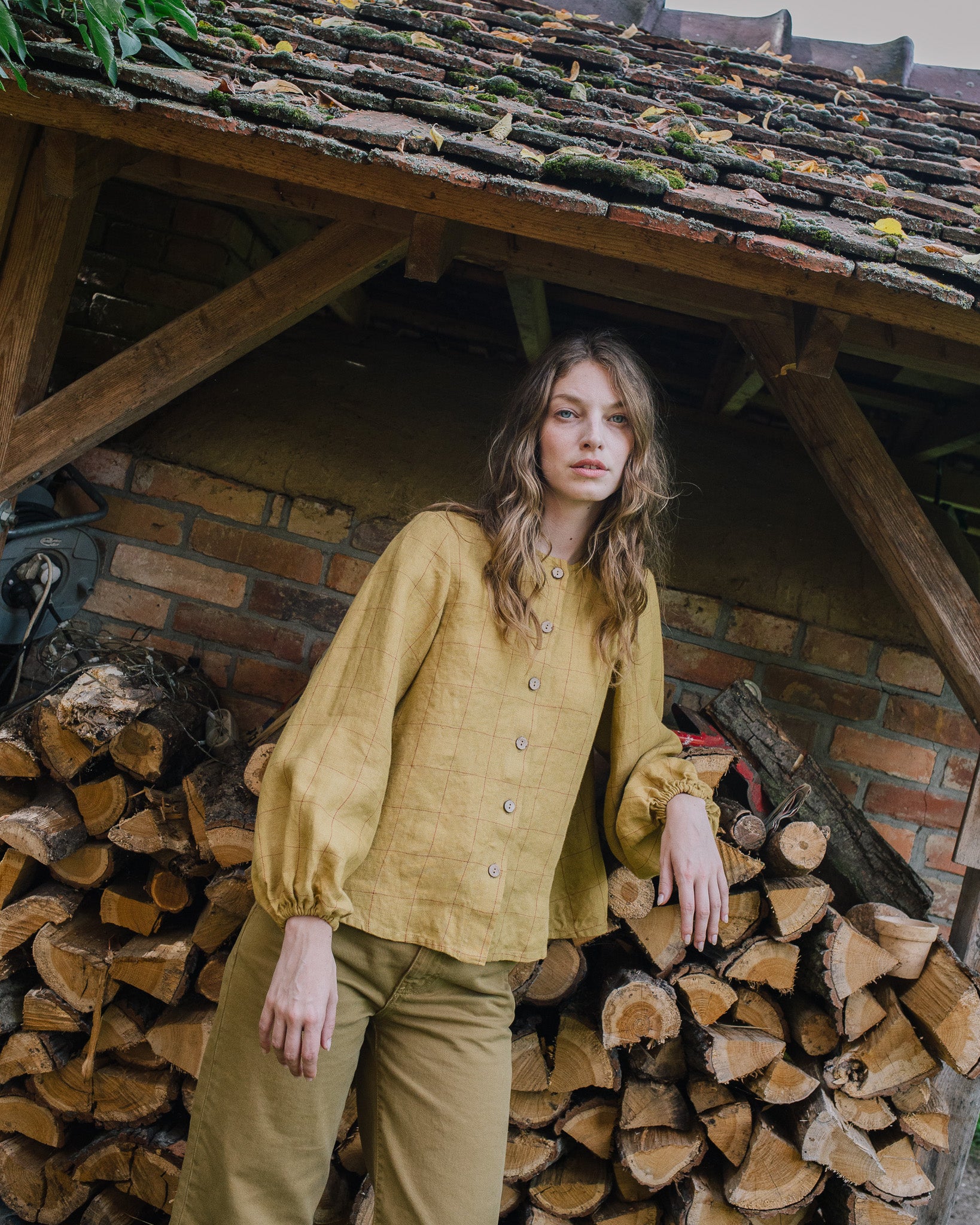 • Model wears a shirt in mustard checks.