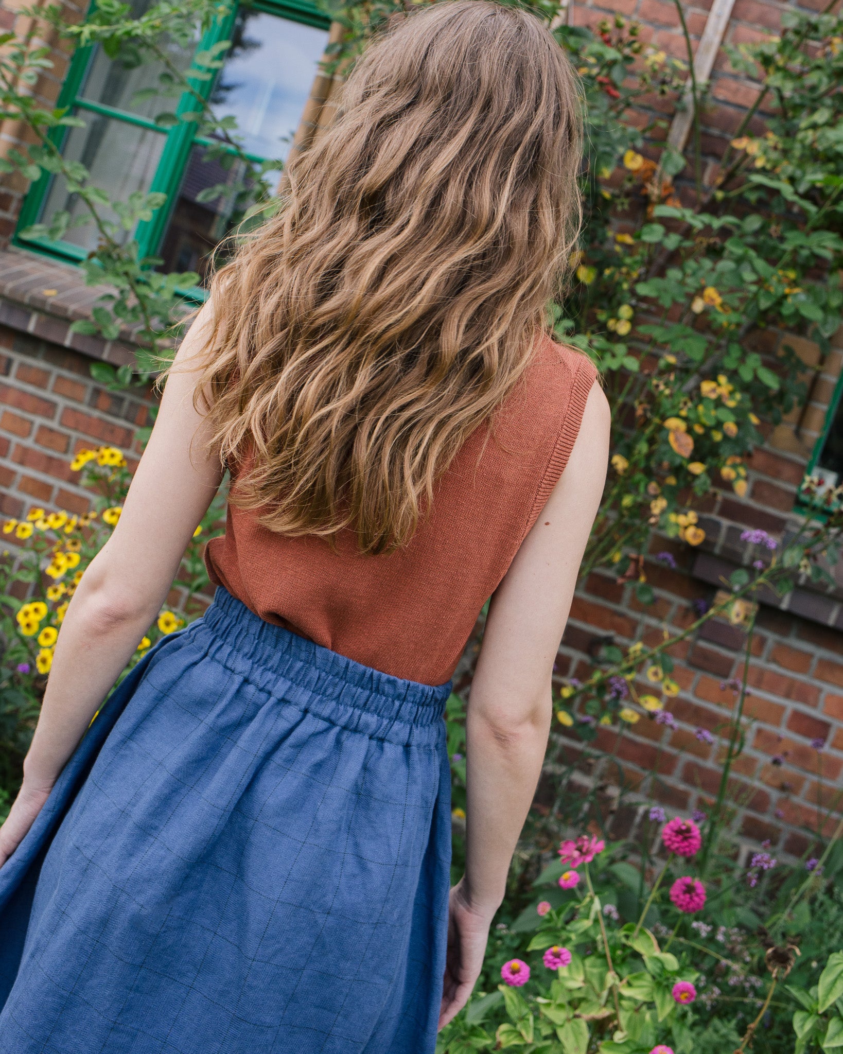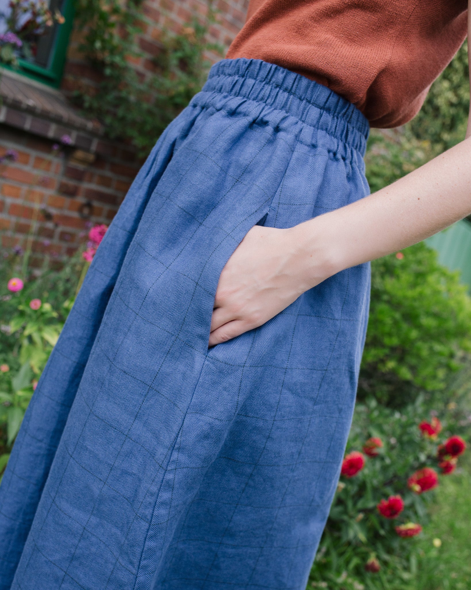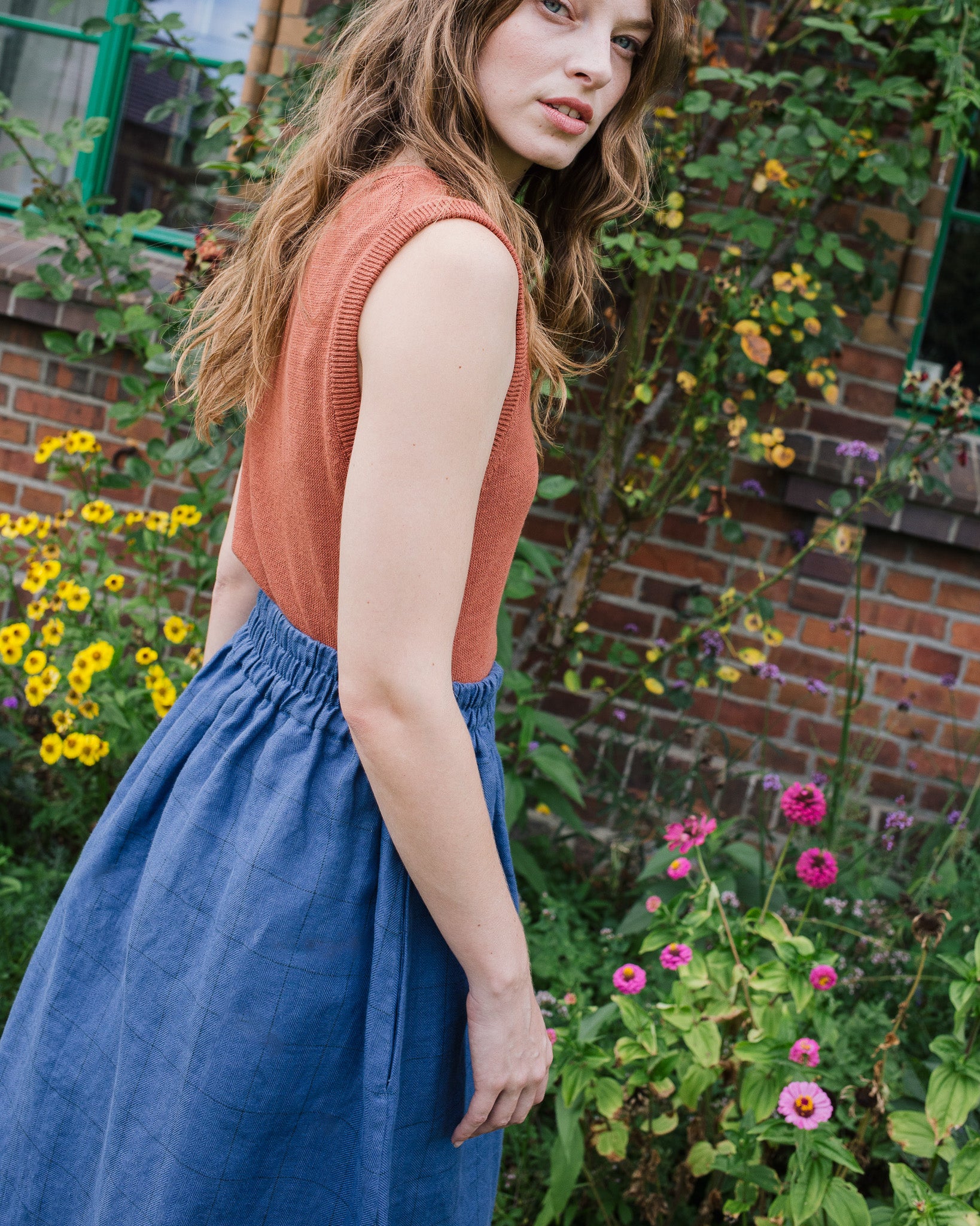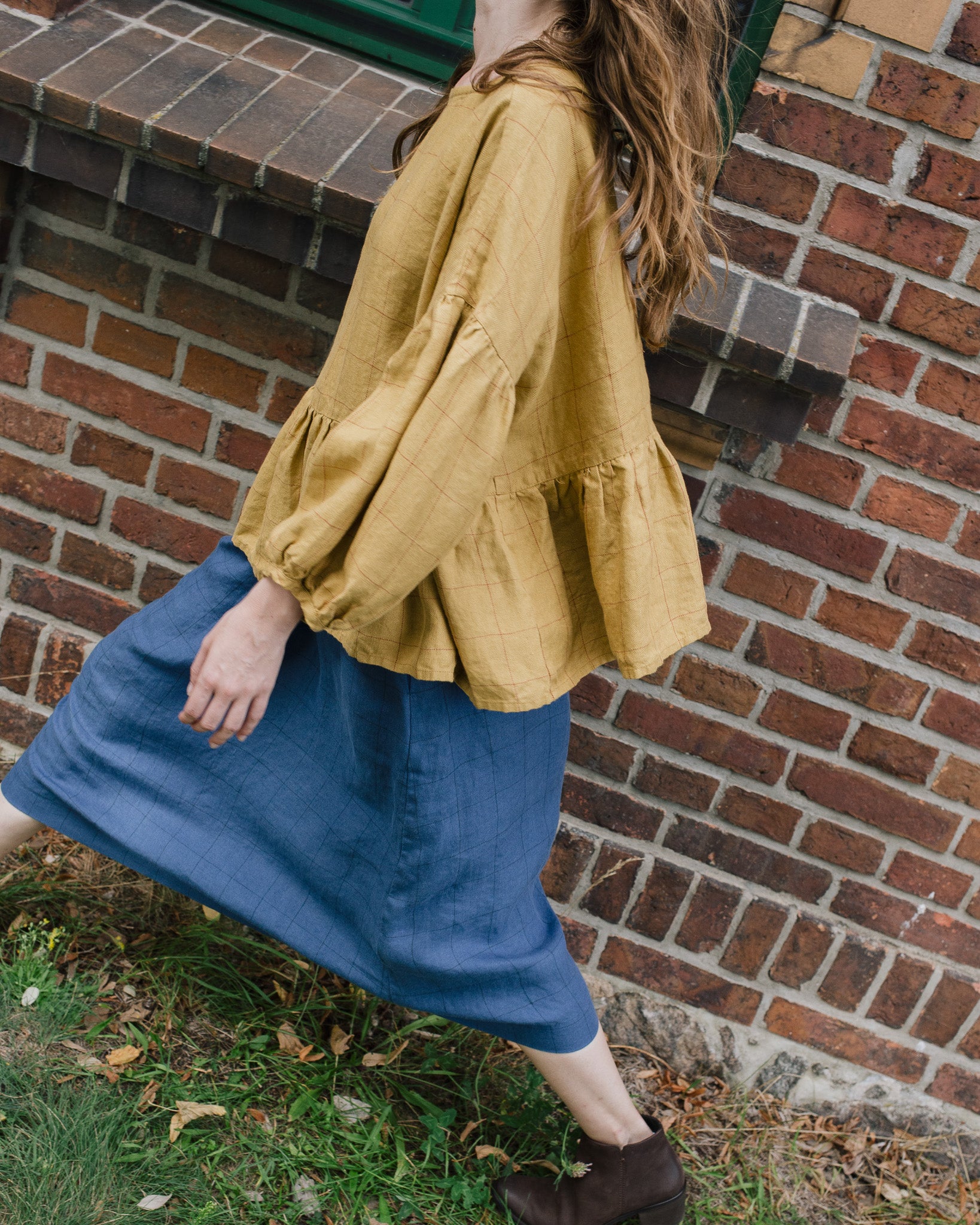 • Model wears a skirt in delft blue checks, paired with Ochre top in mustard checks.