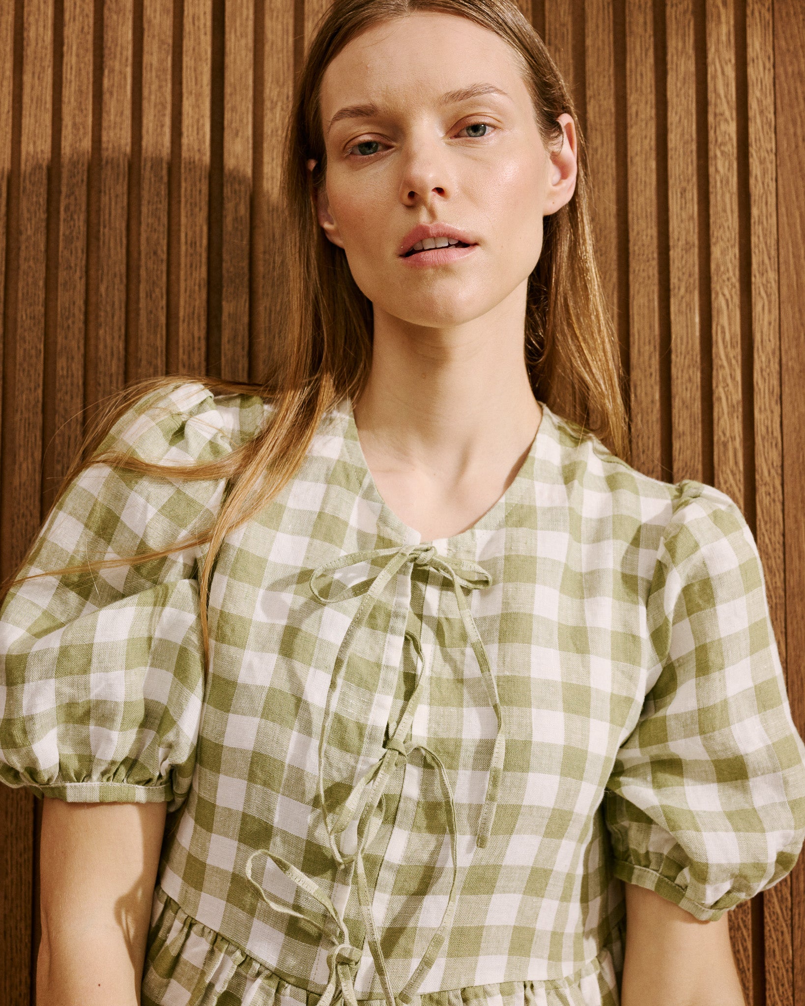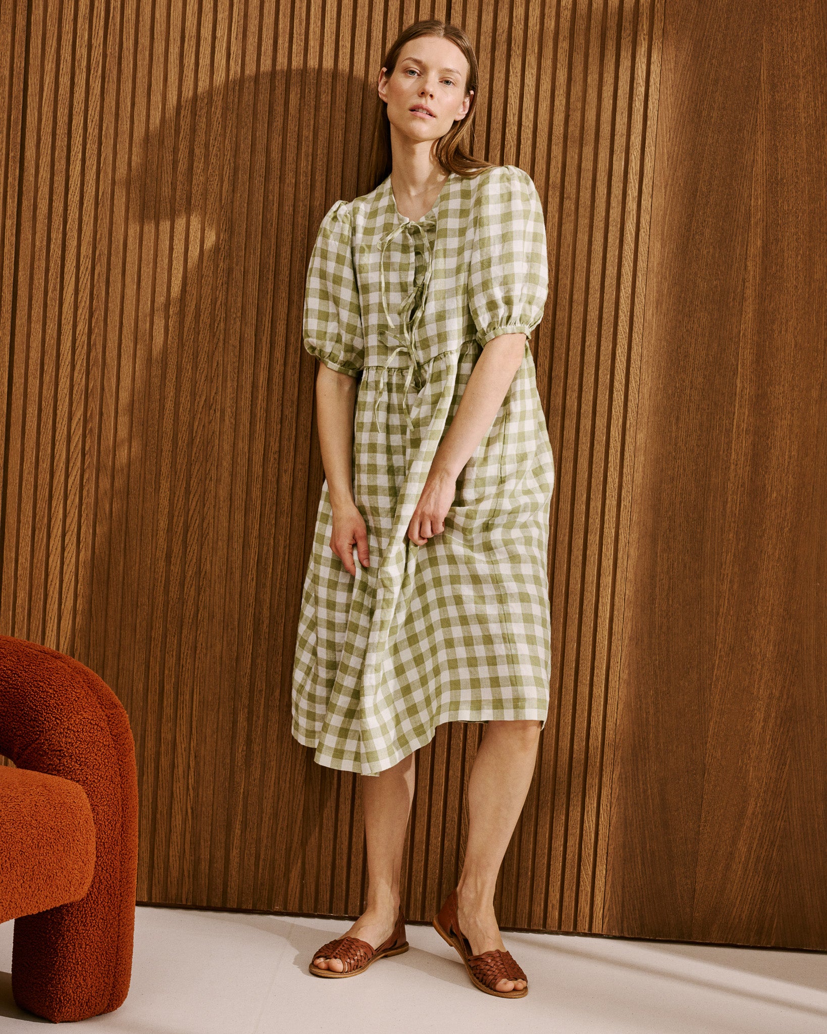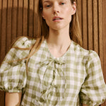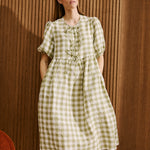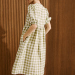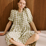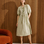 • Model wears a dress in laurel gingham.