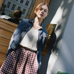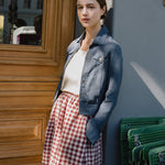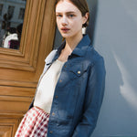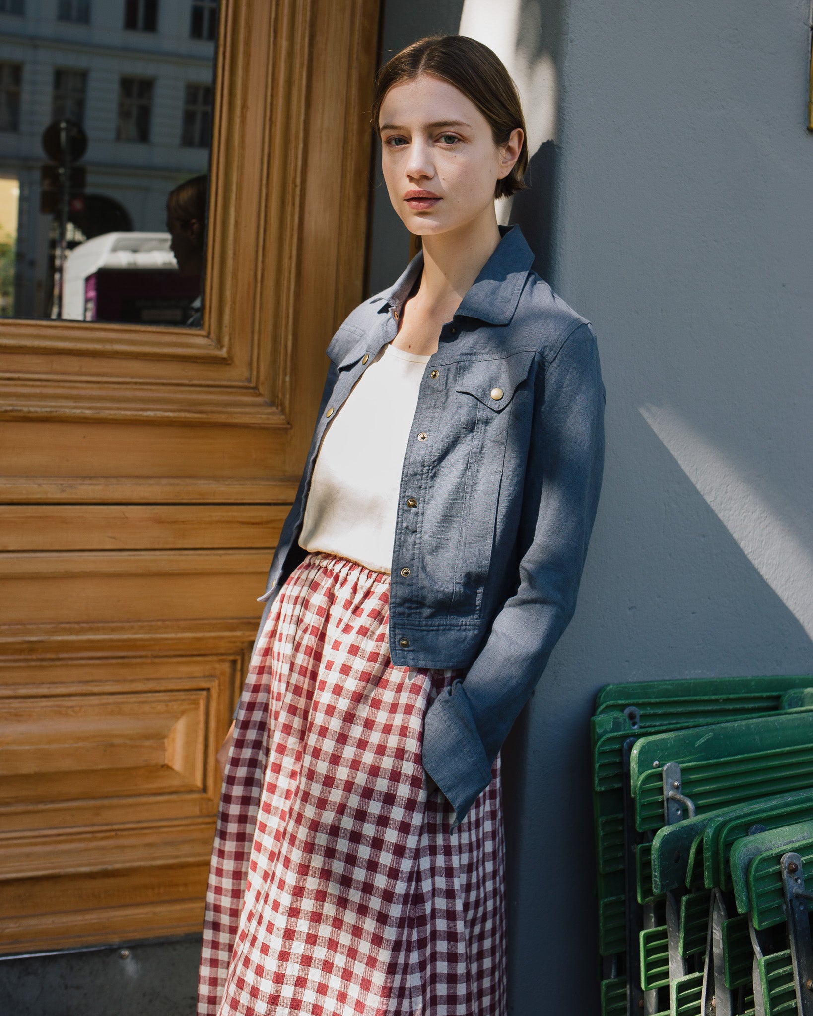 • Vintage-inspired cropped linen jacket with brass snaps.