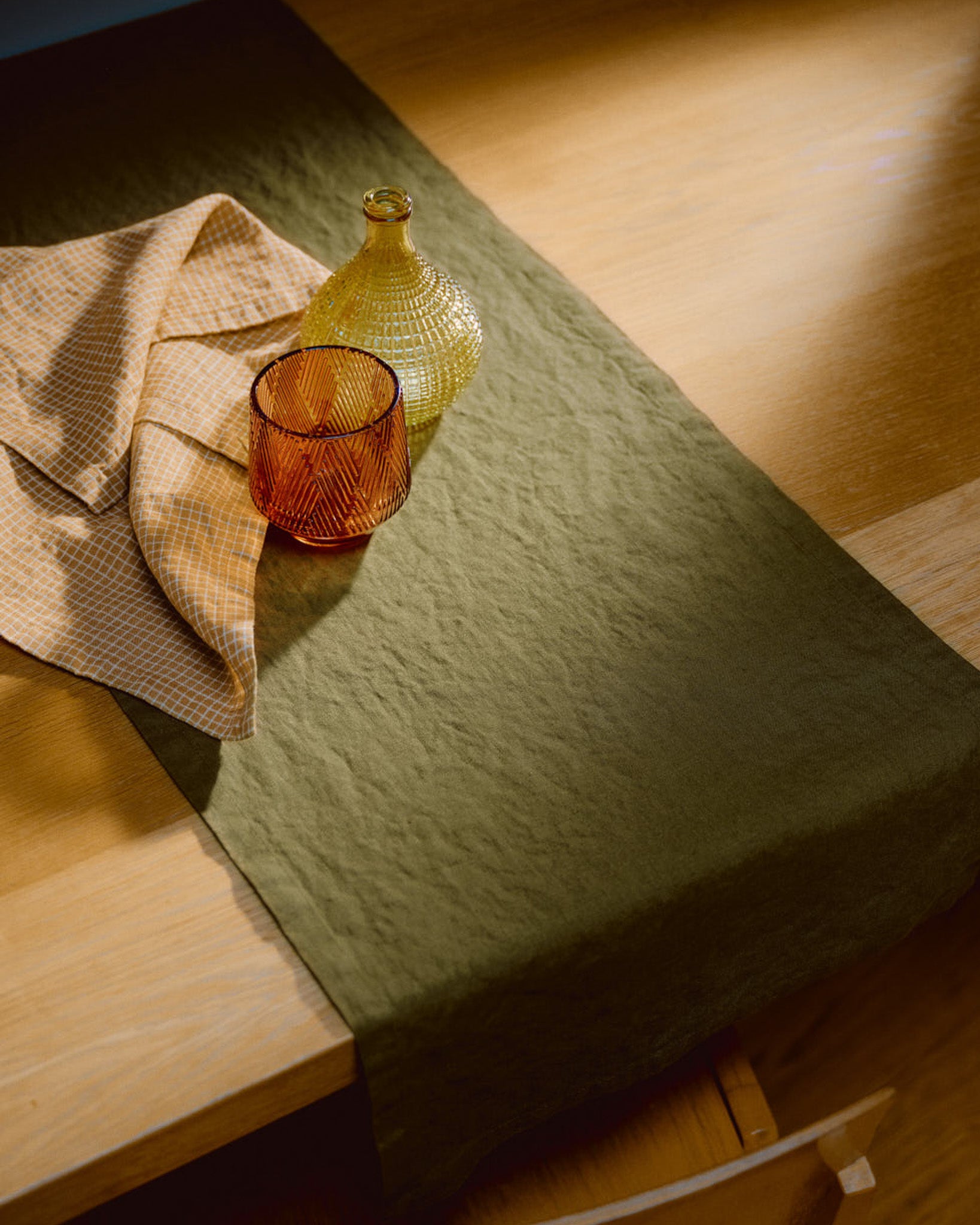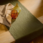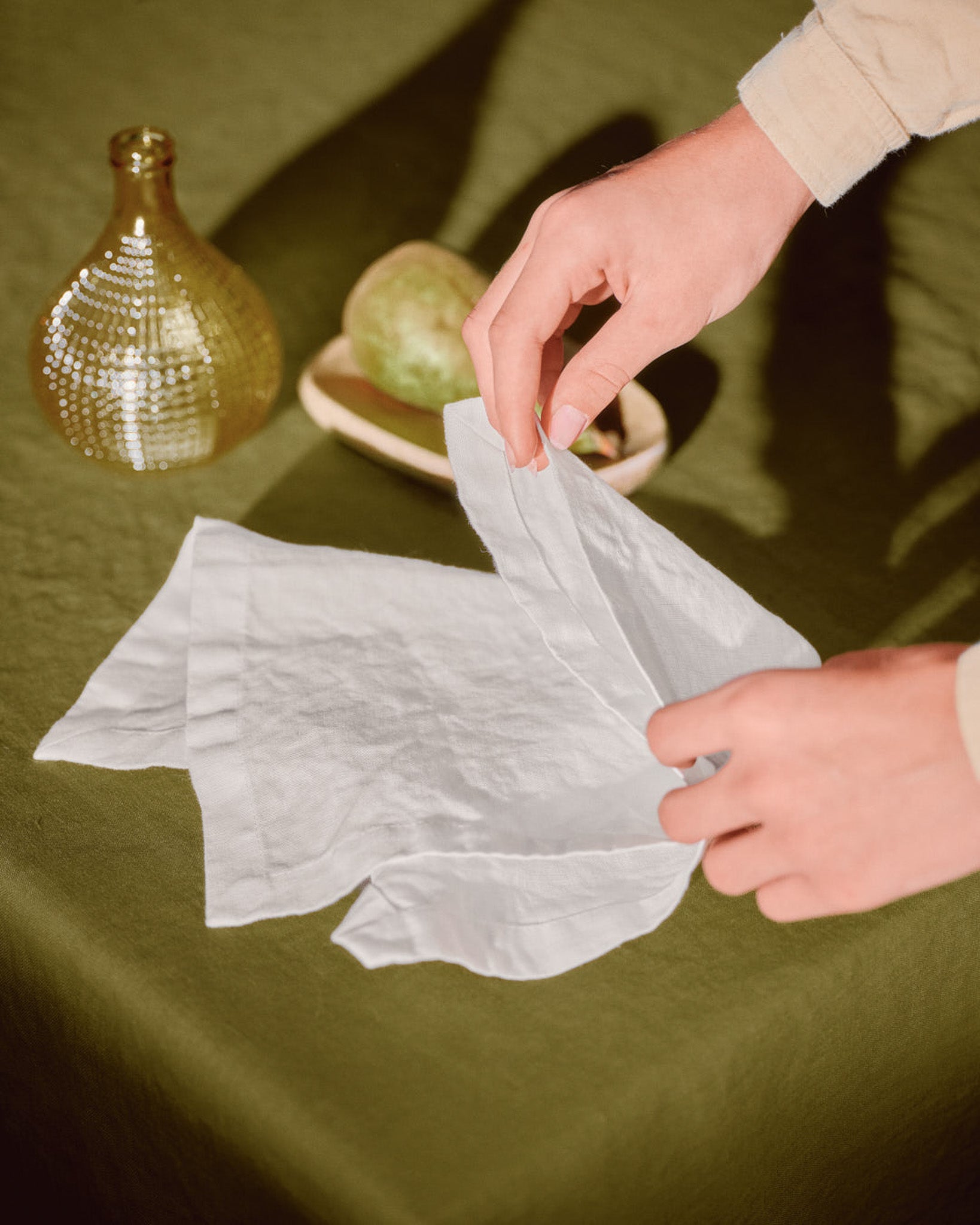 • Pure linen napkins, hand-cut, sewn, and pre-washed with precision.