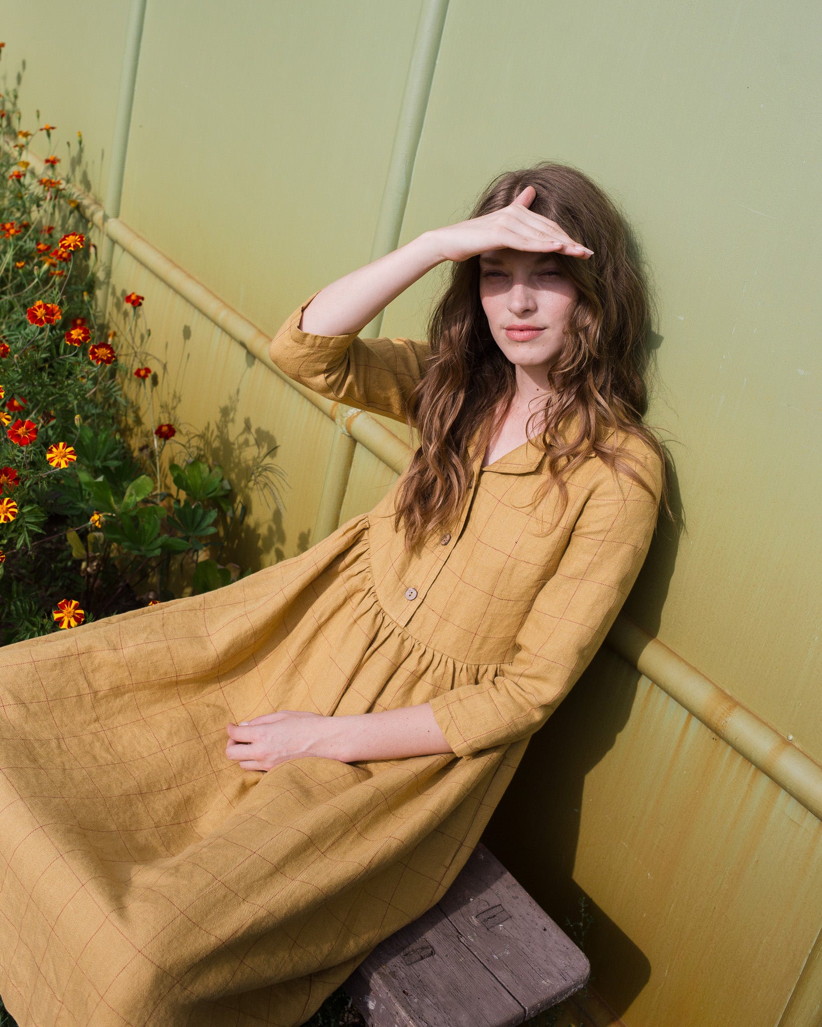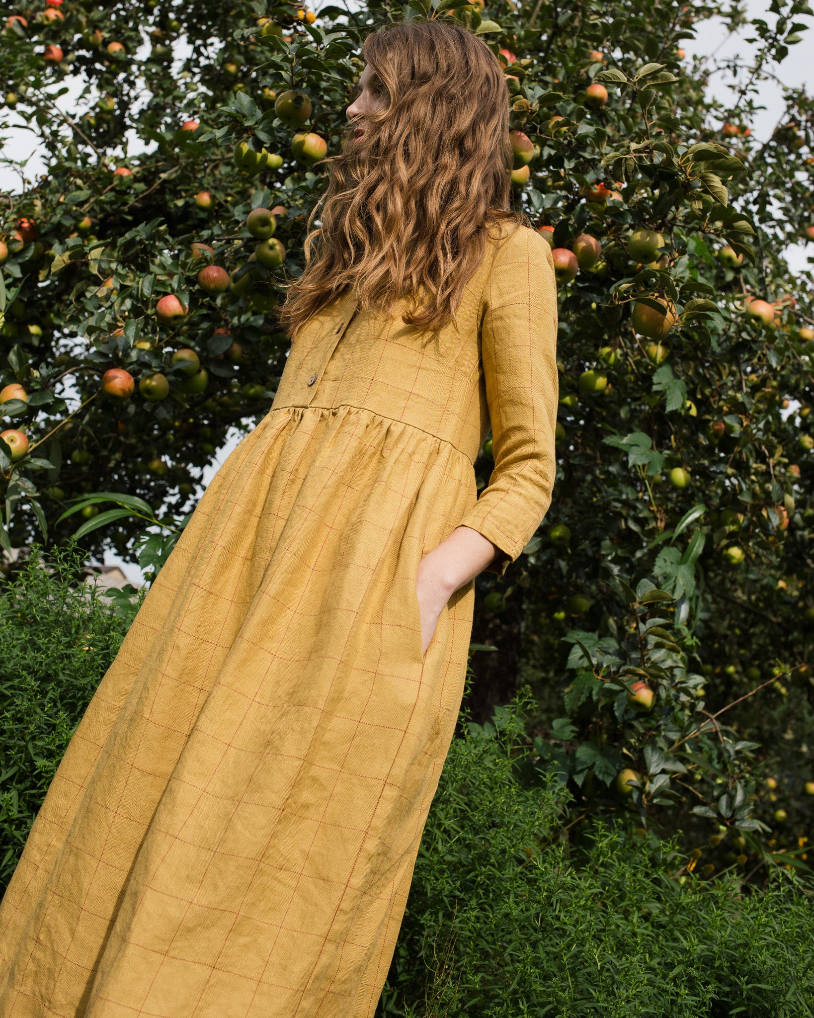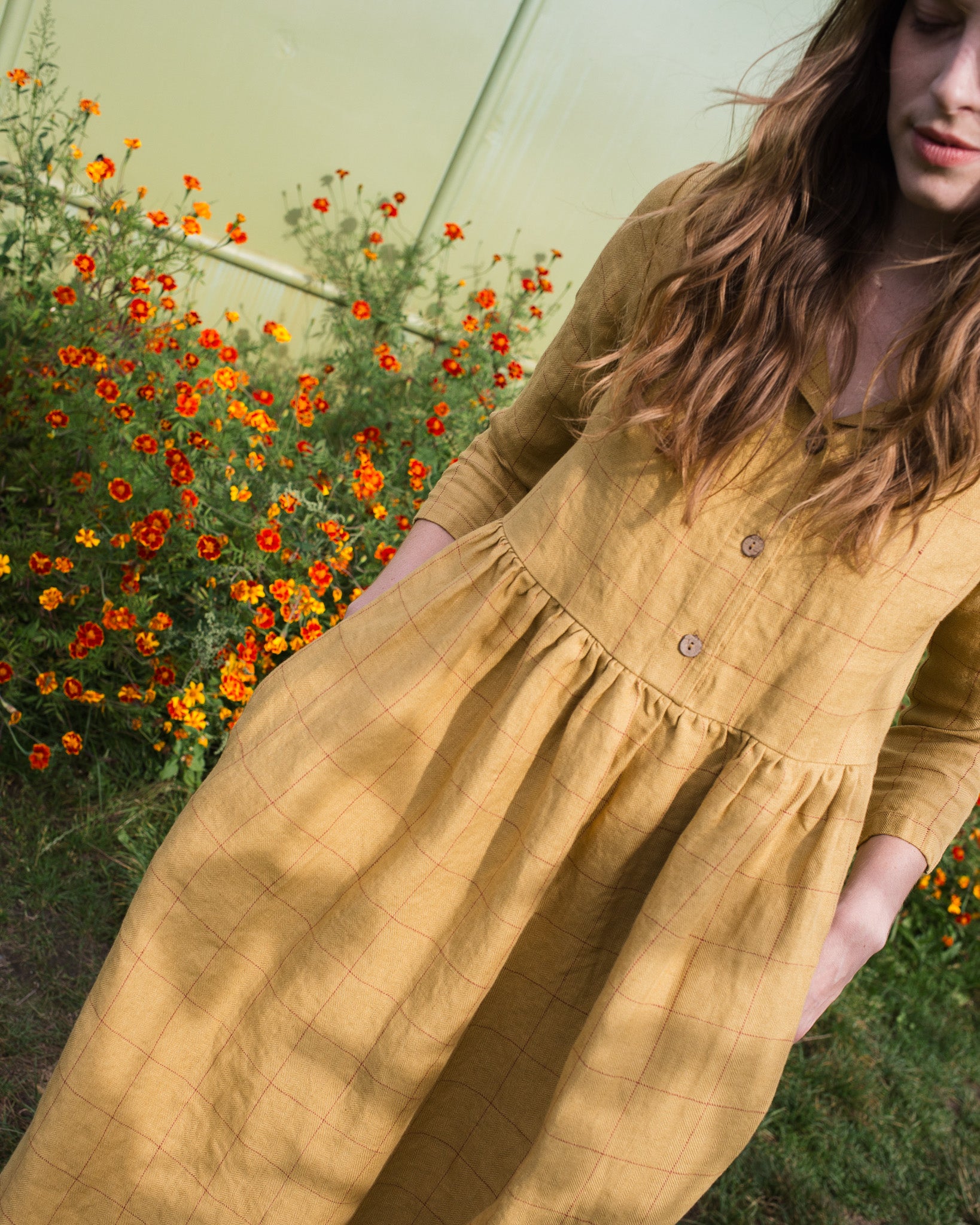 • Model wears a dress in mustard checks.