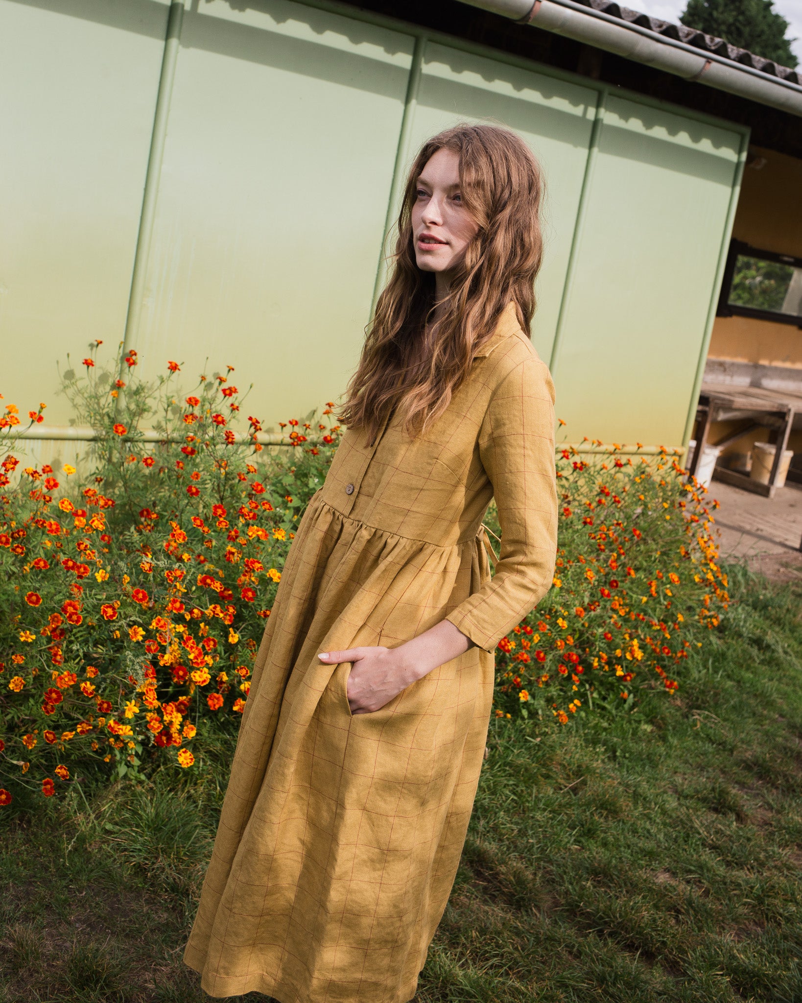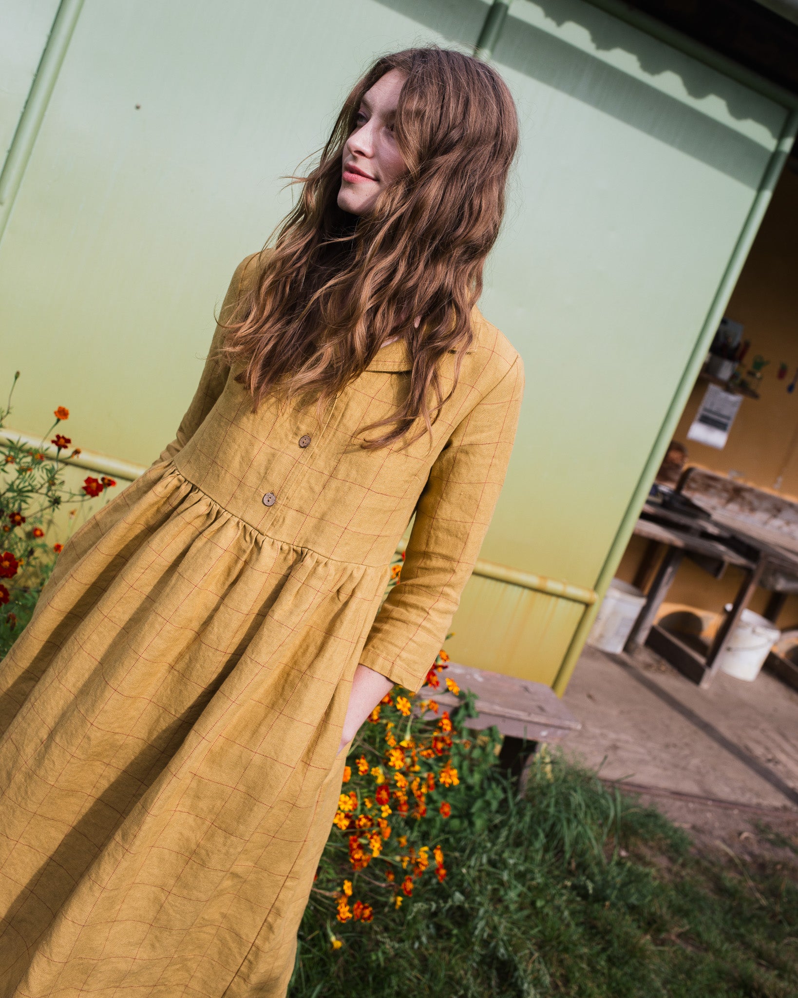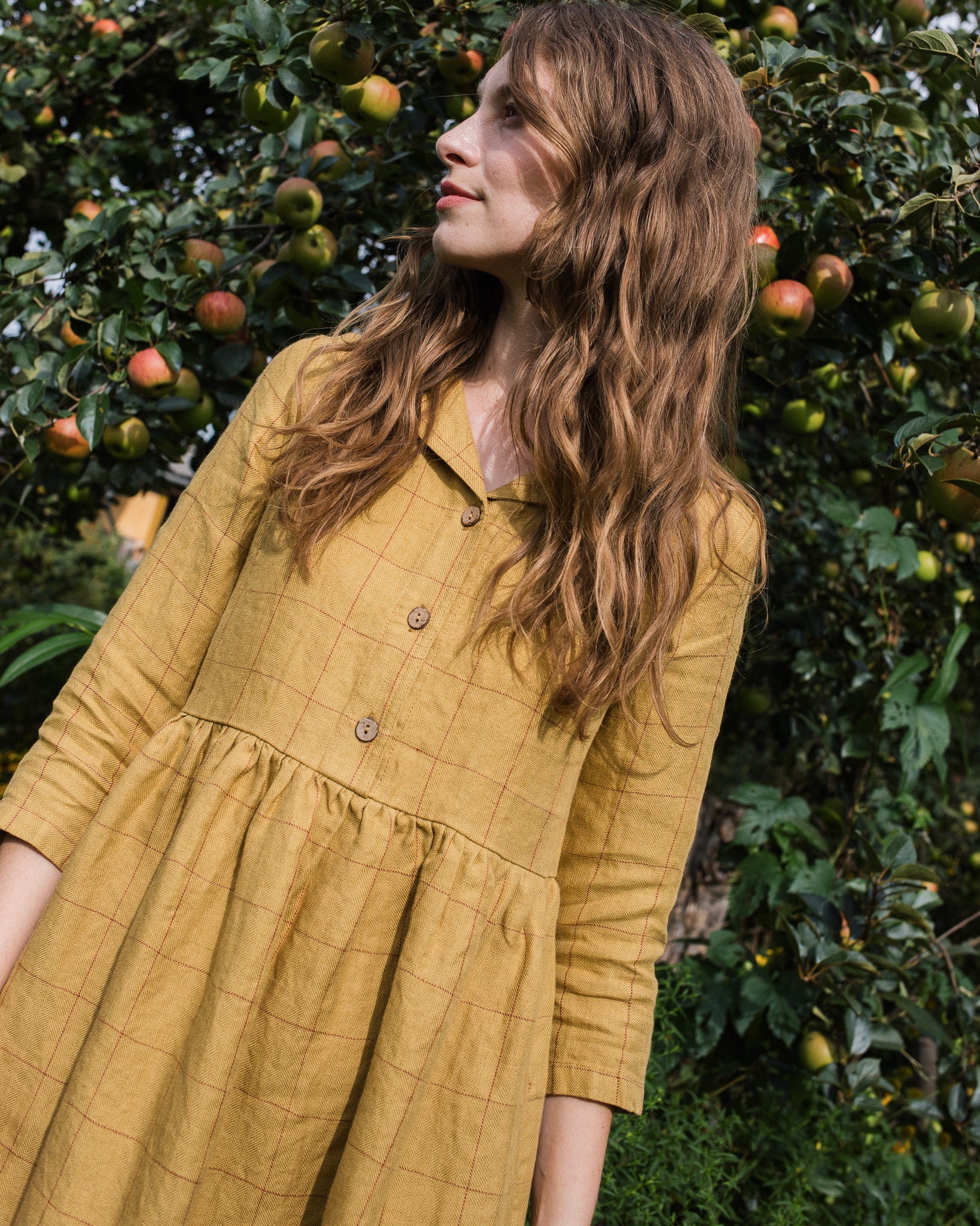 • Model wears a dress in mustard checks.
