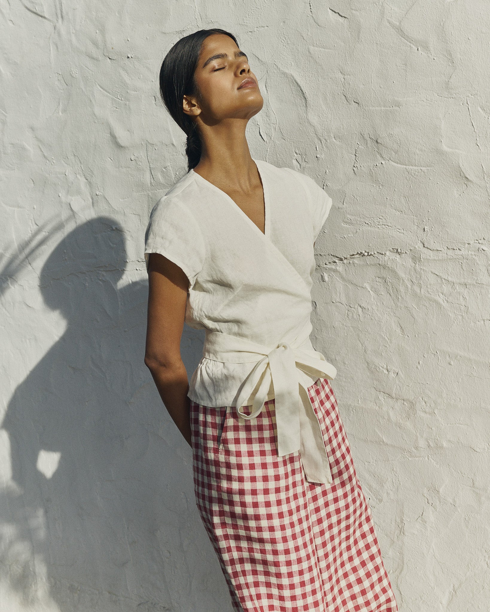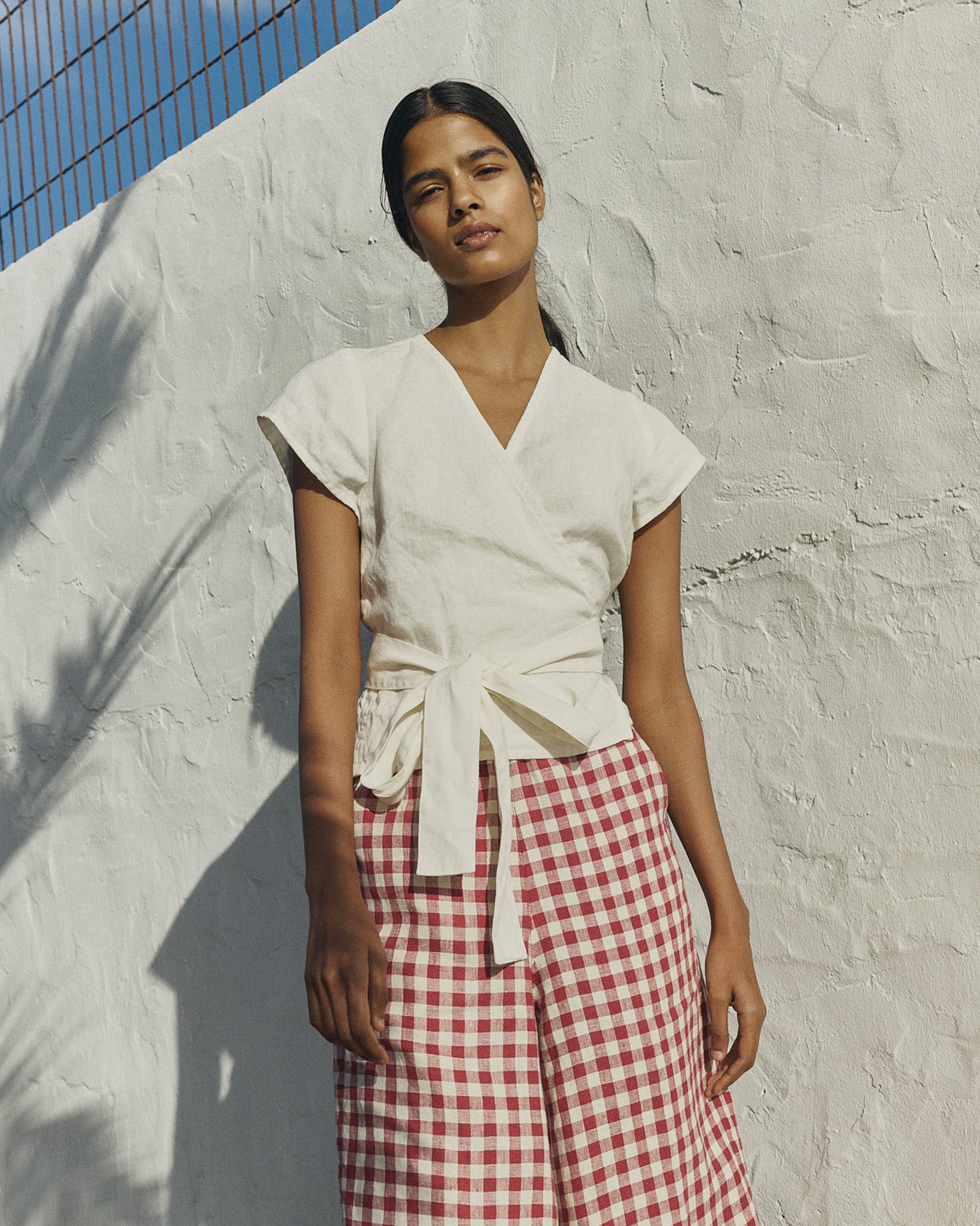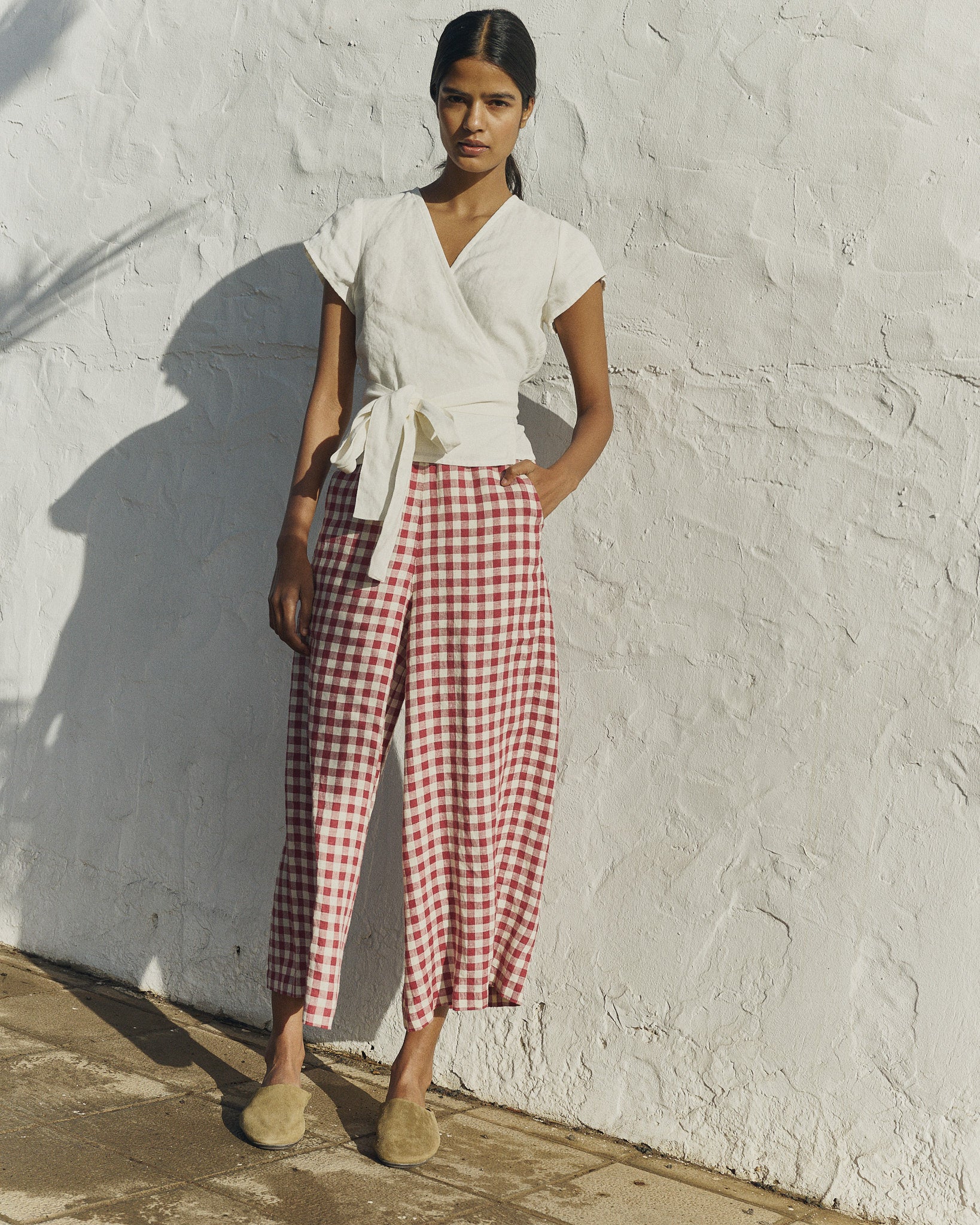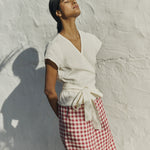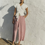 • Model wears size XS in cream, paired with Wels pants in marsala gingham.