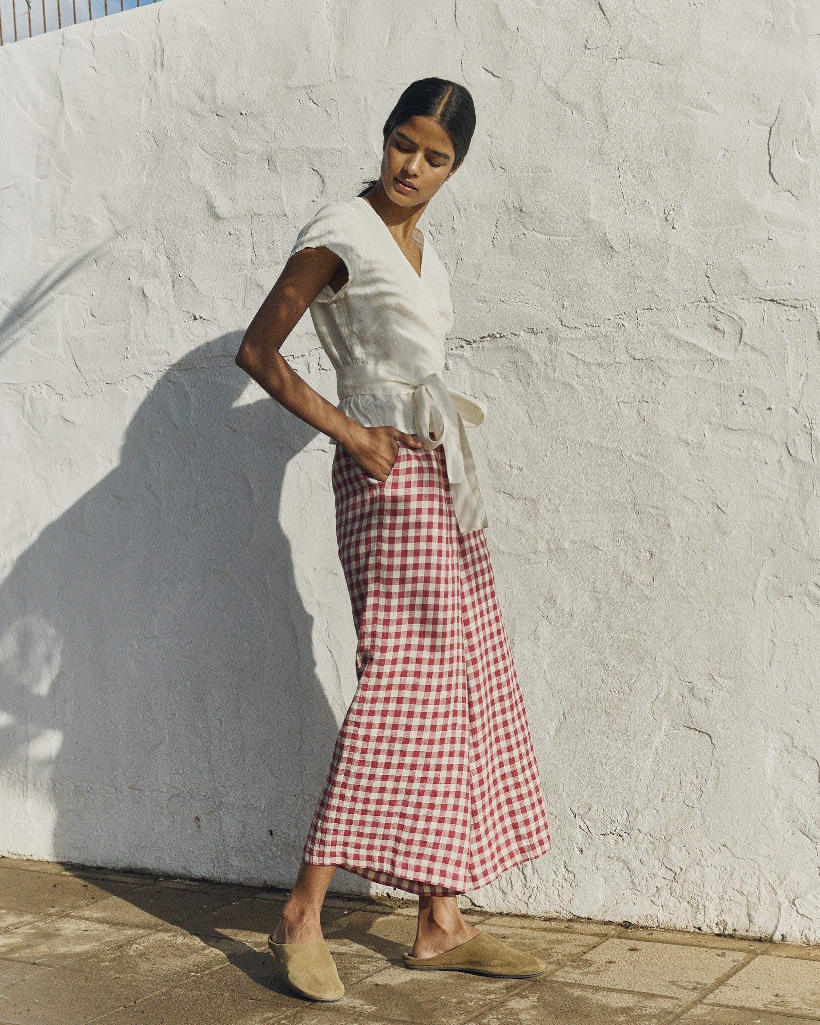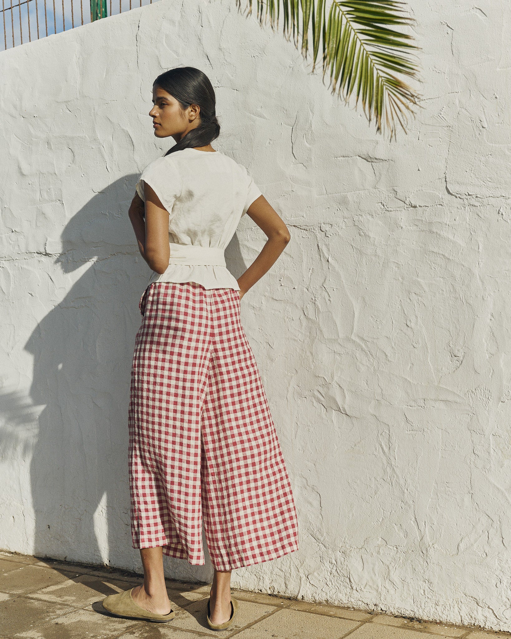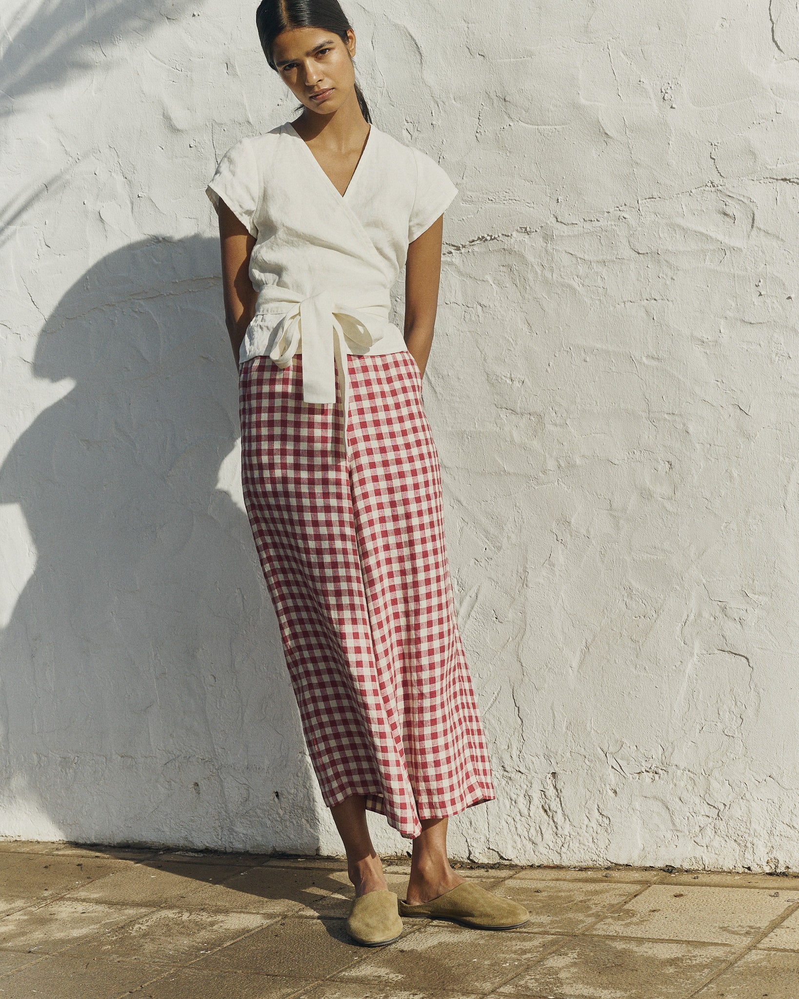 • Model wears size XS in cream, paired with Wels pants in marsala gingham.