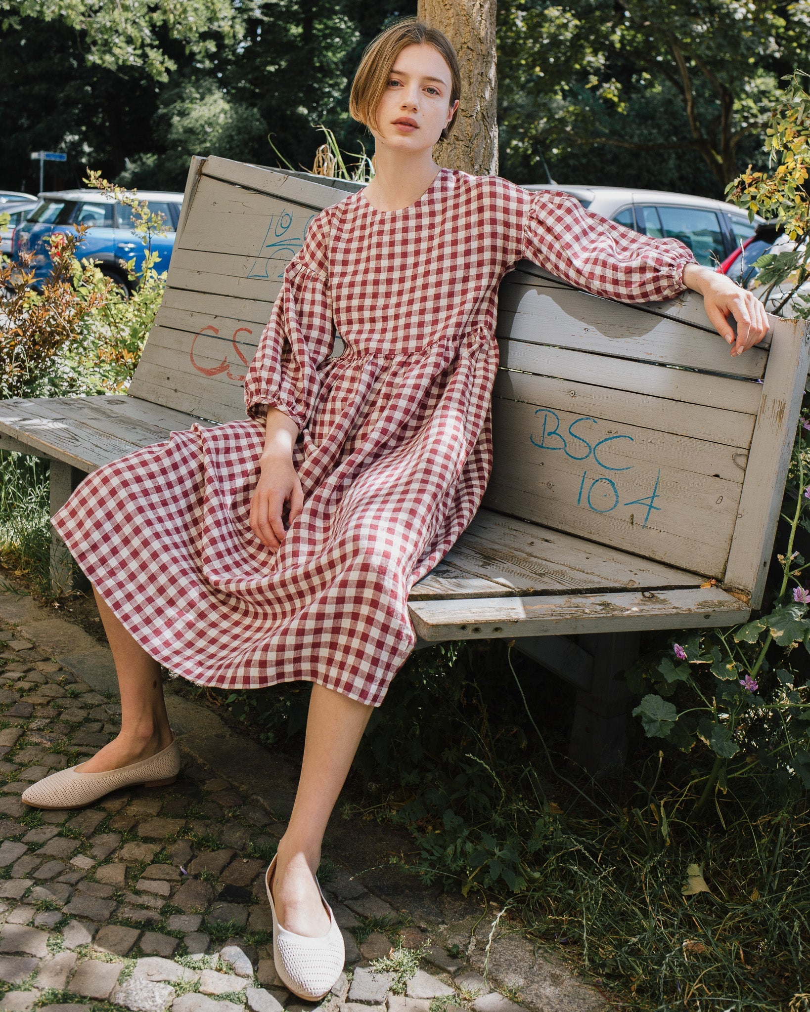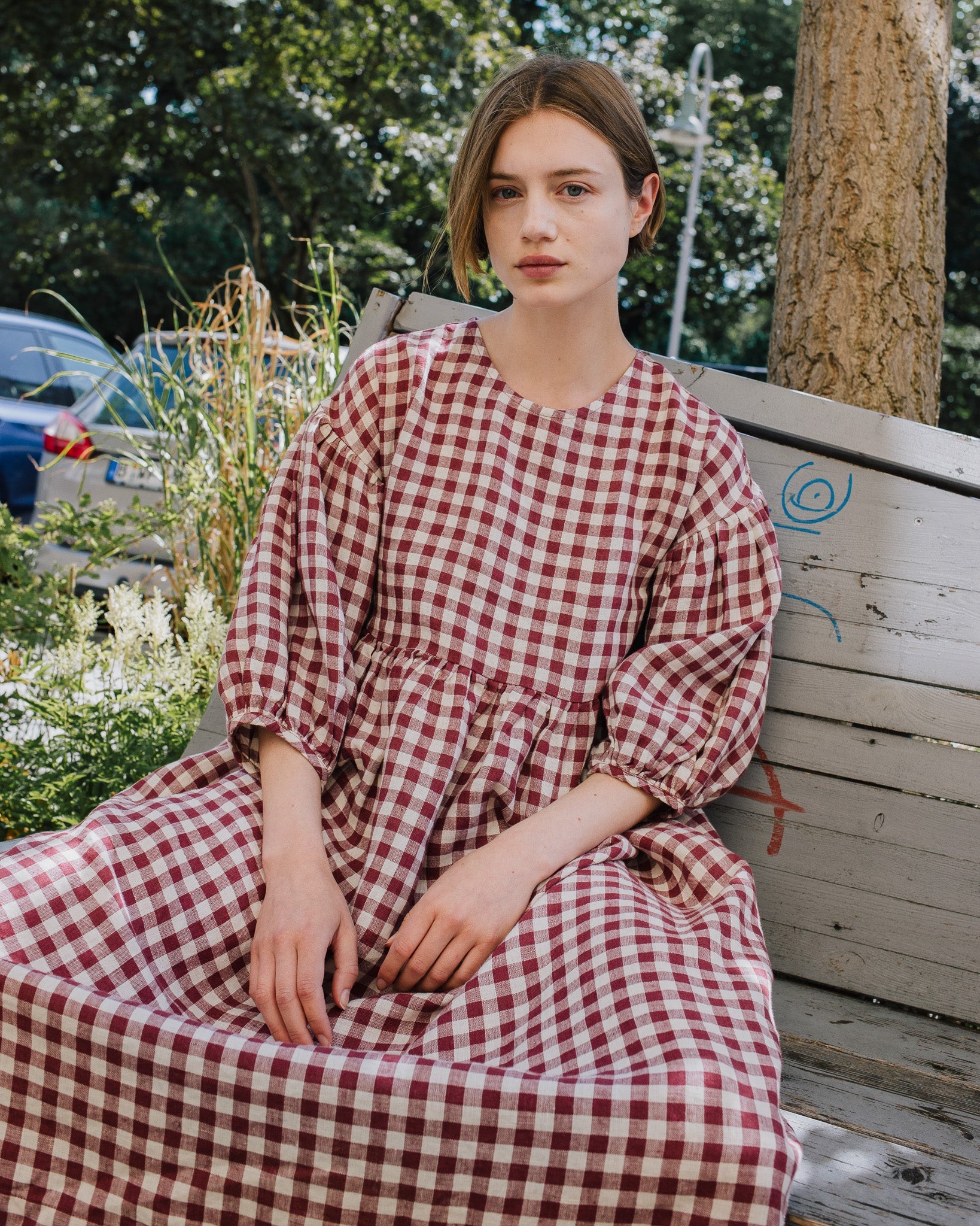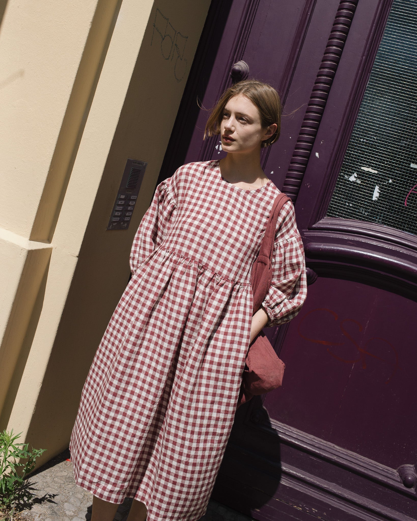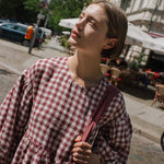 • The model is 5'8" tall (174 cm), size S, and wears a dress in medium weight 'Marsala gingham' pattern.