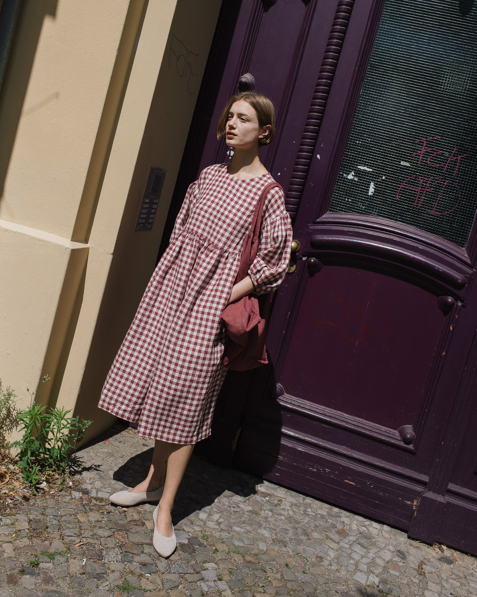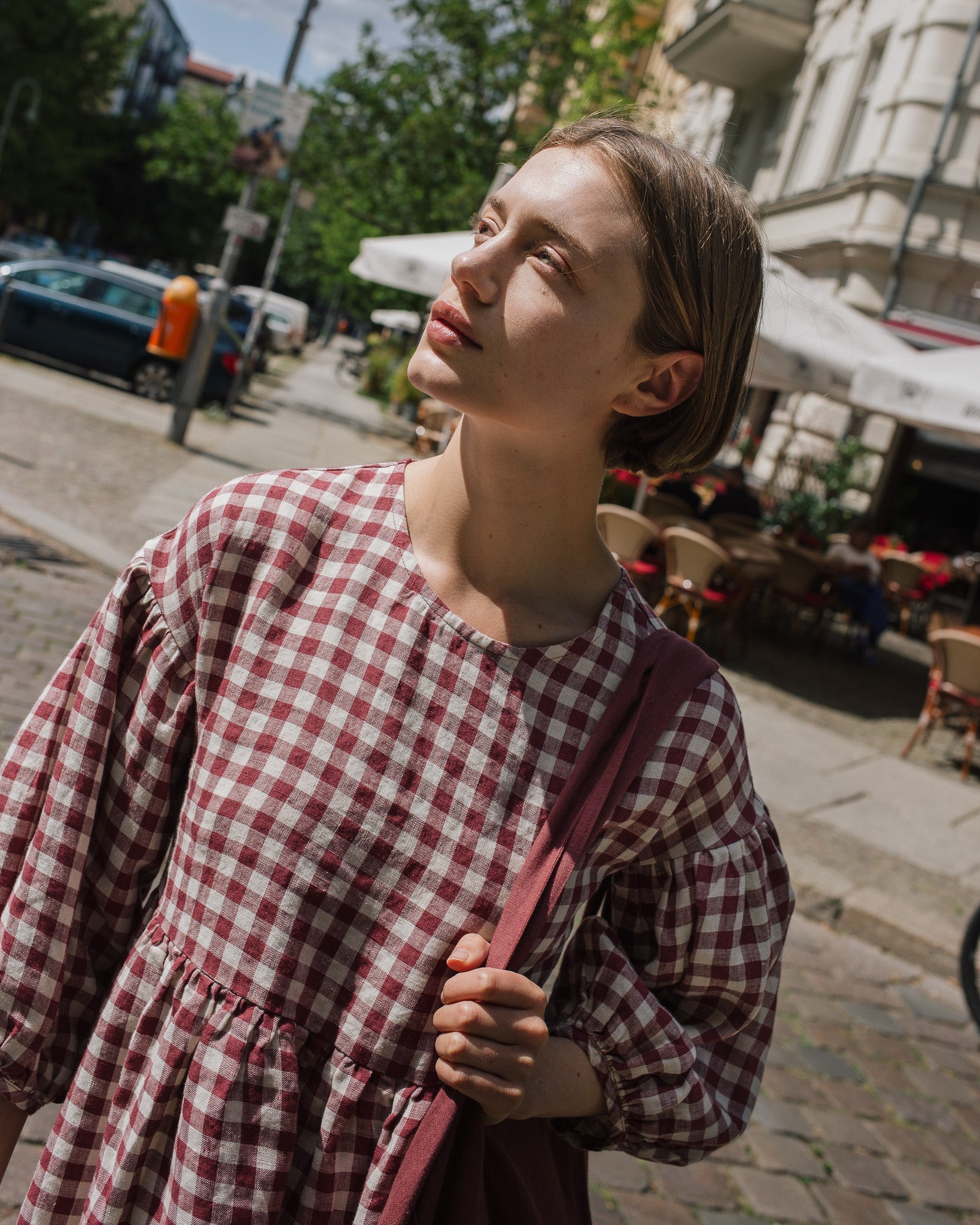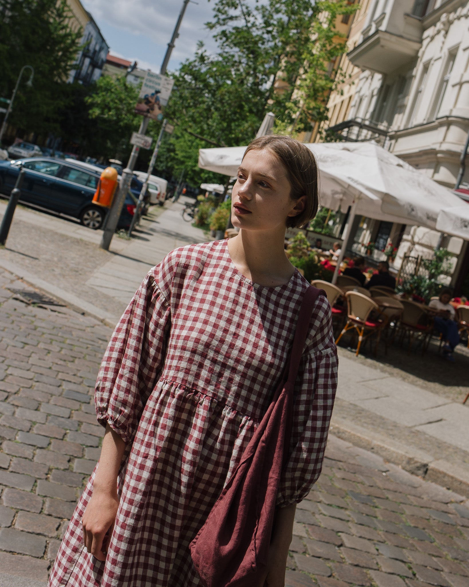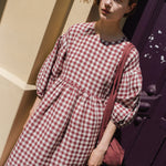 • The model is 5'8" tall (174 cm), size S, and wears a dress in medium weight 'Marsala gingham' pattern.
