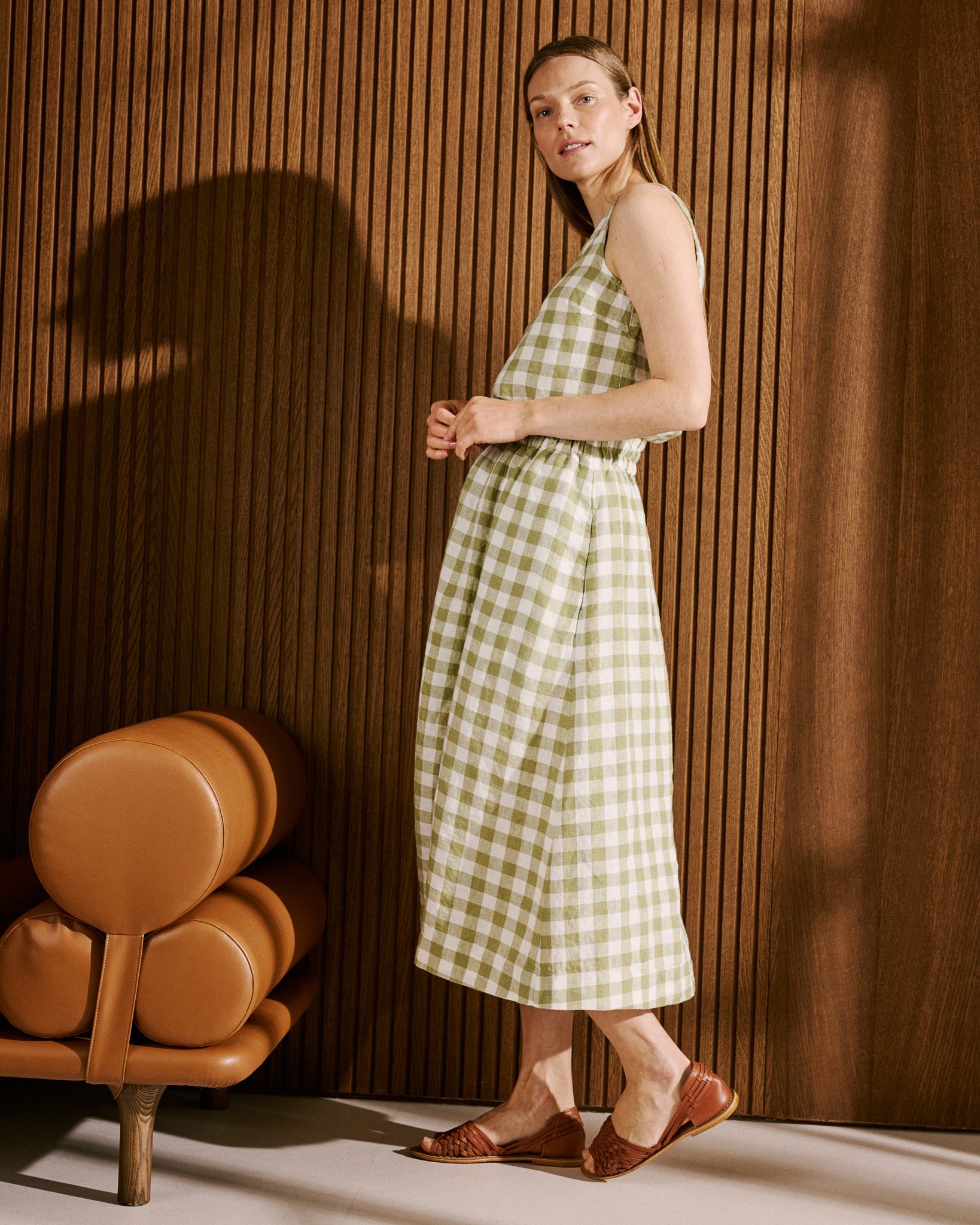 • The model is 5'8" tall (173 cm), size S, and wears a top in medium weight laurel gingham pattern.